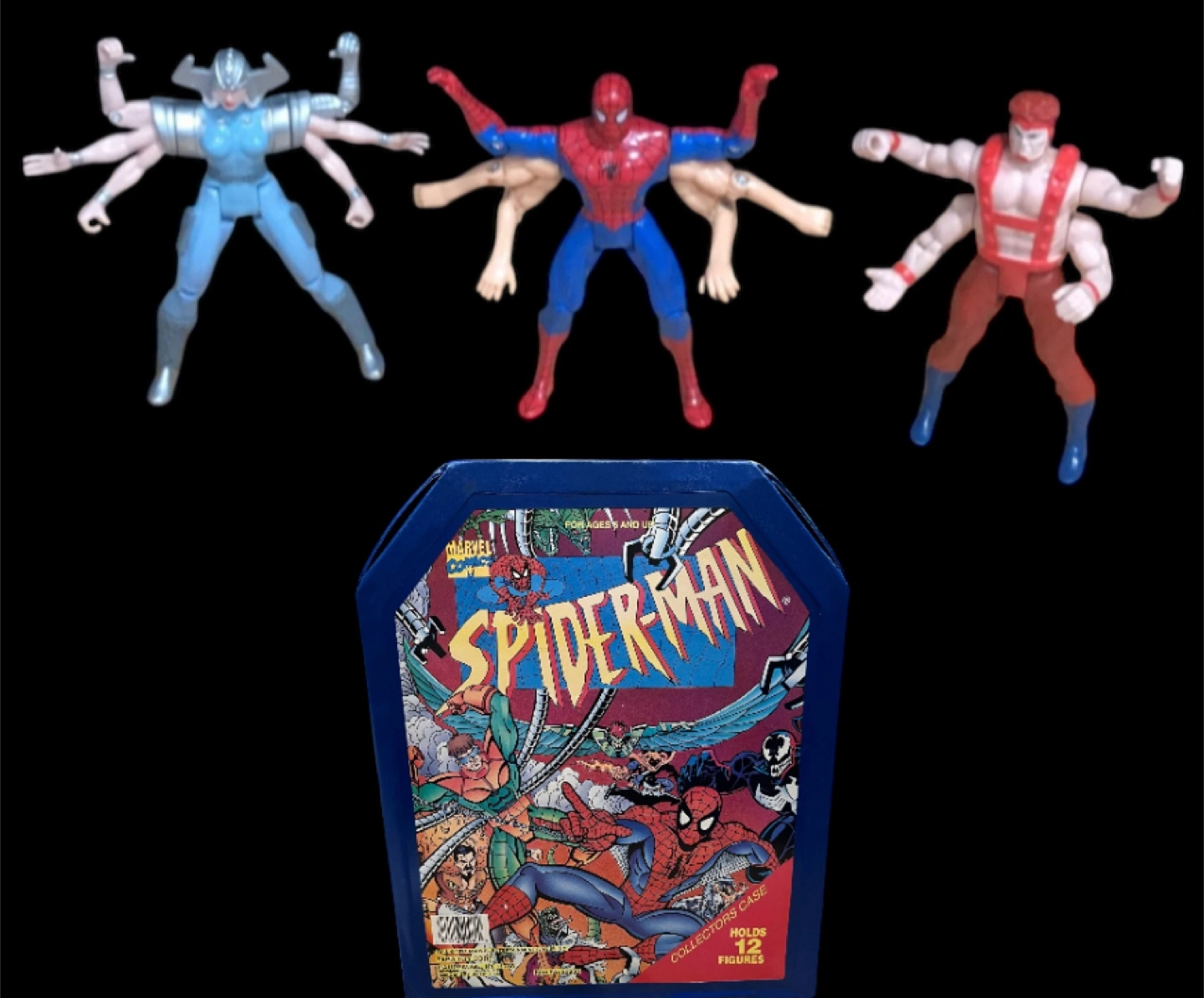 Three vintage Marvel Spider-Man action figures. Each figure has four arms. Includes Spider-Man, Spiral and Forearm figures come in original vintage blue collector's case that holds 12 figures Great for collectors. Sell or Trade
