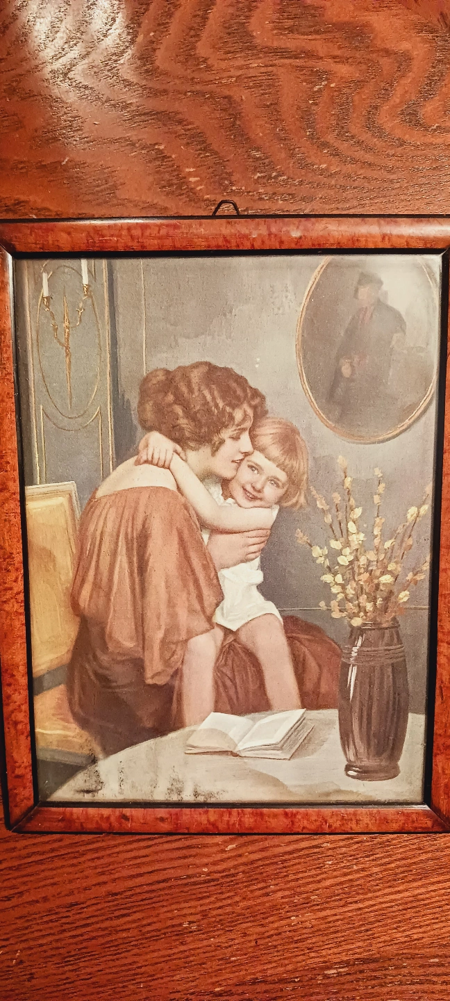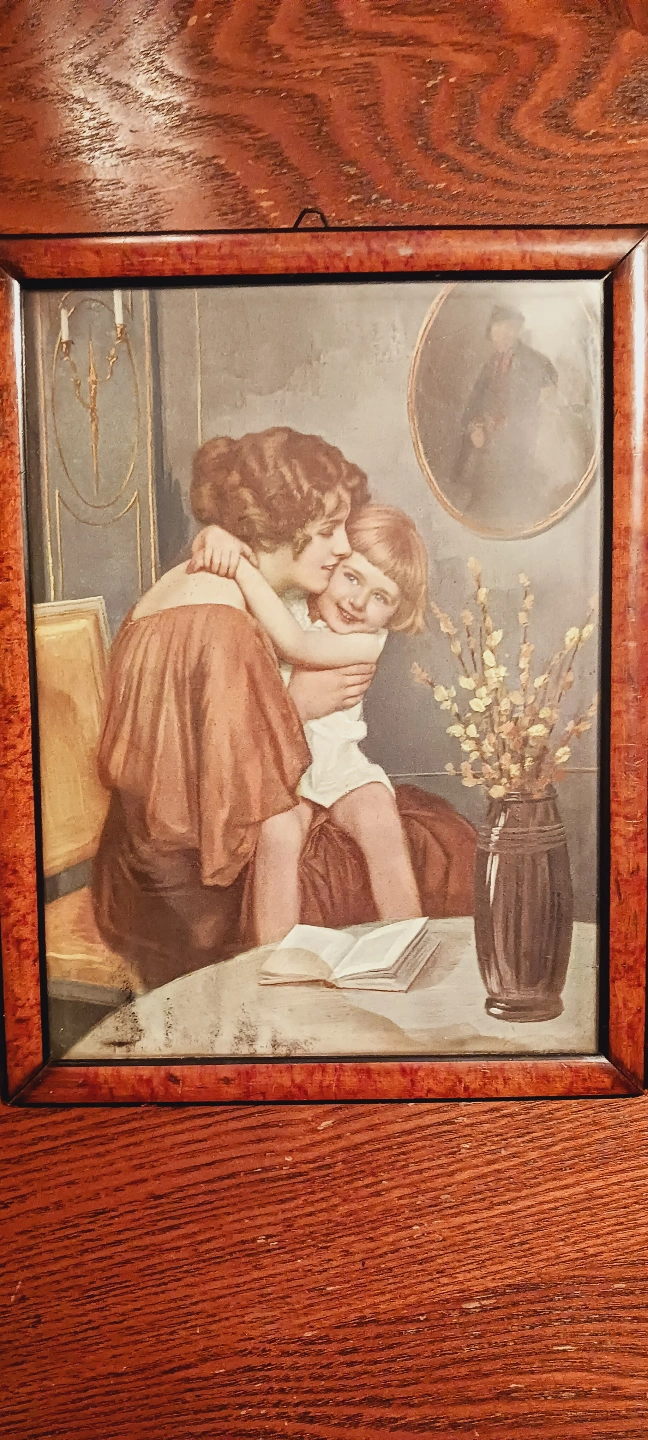 Absolutely Gorgeous Antique framed print. Depicts a mother embracing her young child. Dark wood frame. Flowers in vase on table. Nice detail. 10"×8". Excellent condition. ALL MY PRICES ARE NEGOTIABLE !!!