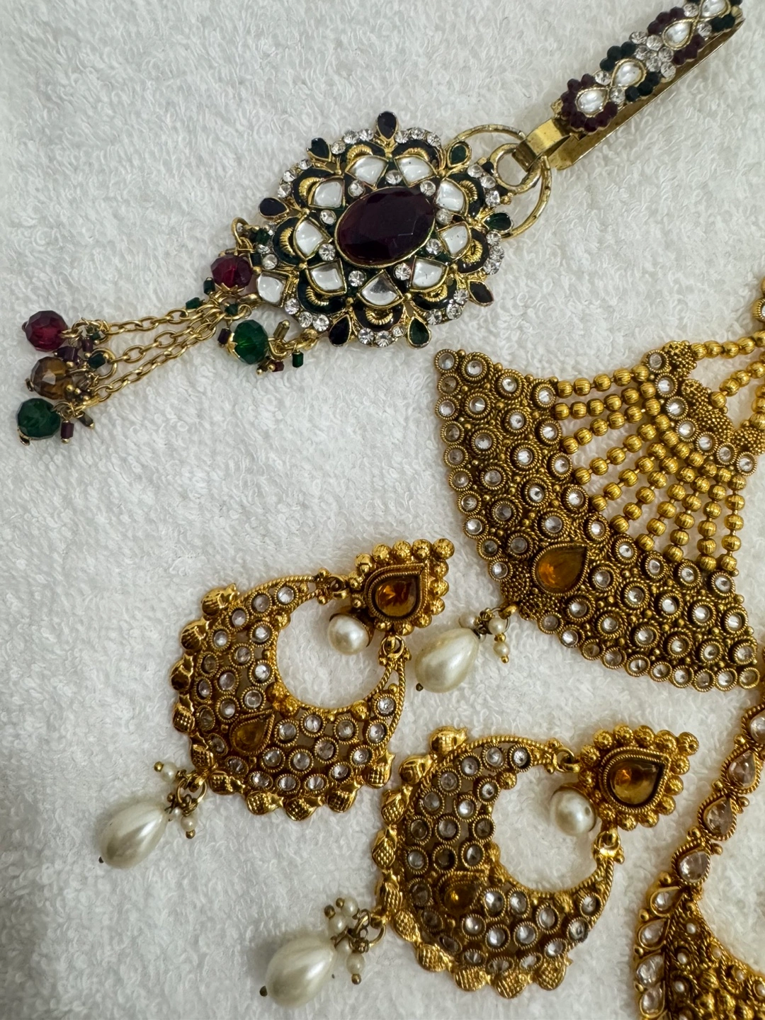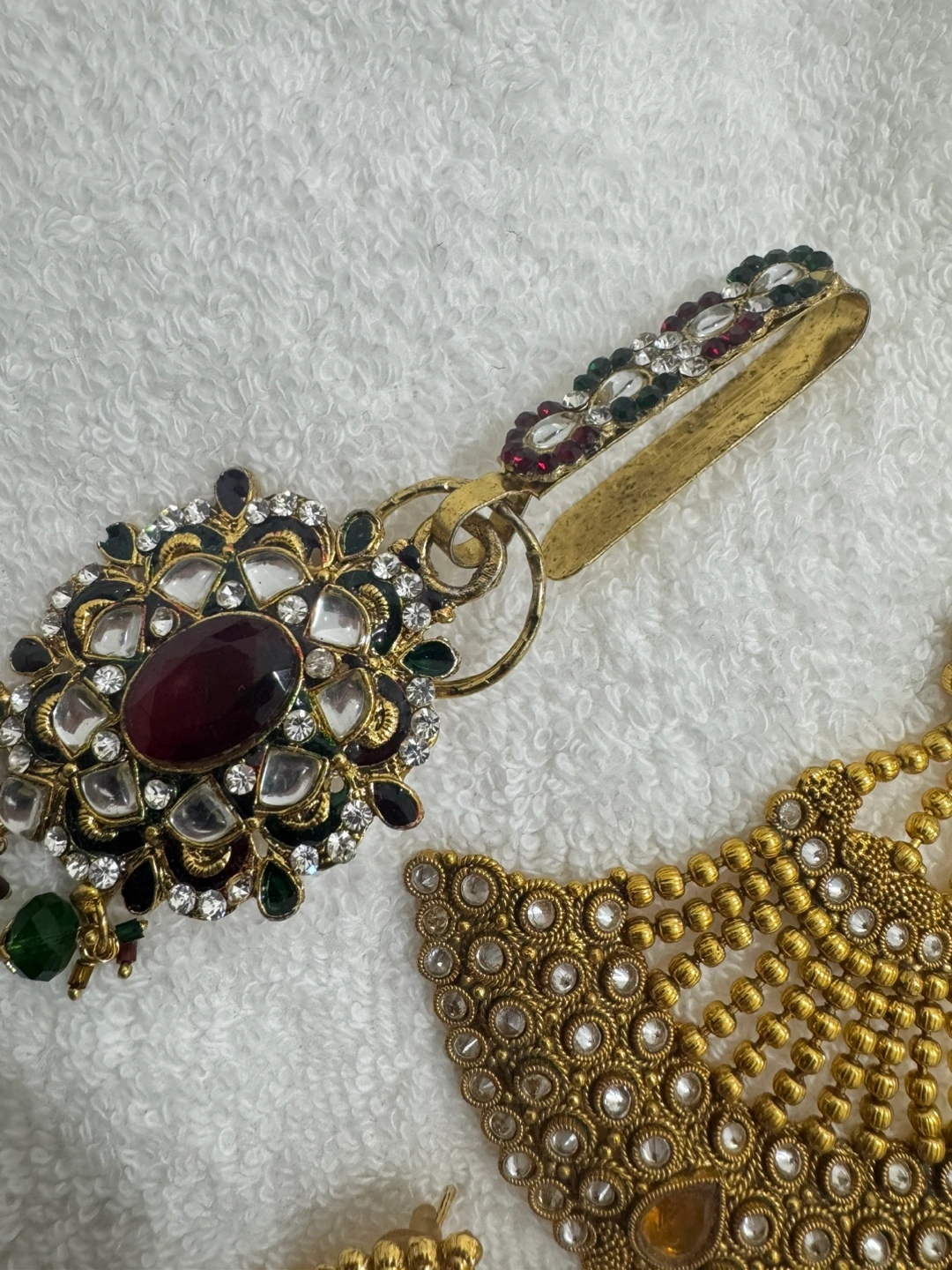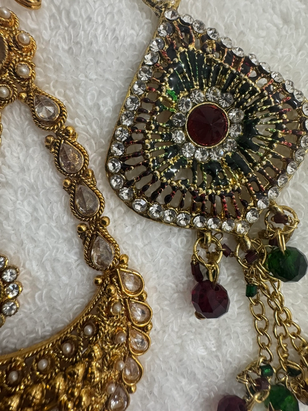 80Beautiful gold tone Indian bridal jewelry set. Includes earrings, maang tikka, and key chain. Features red, green, and clear stones. Perfect for weddings or special occasions.