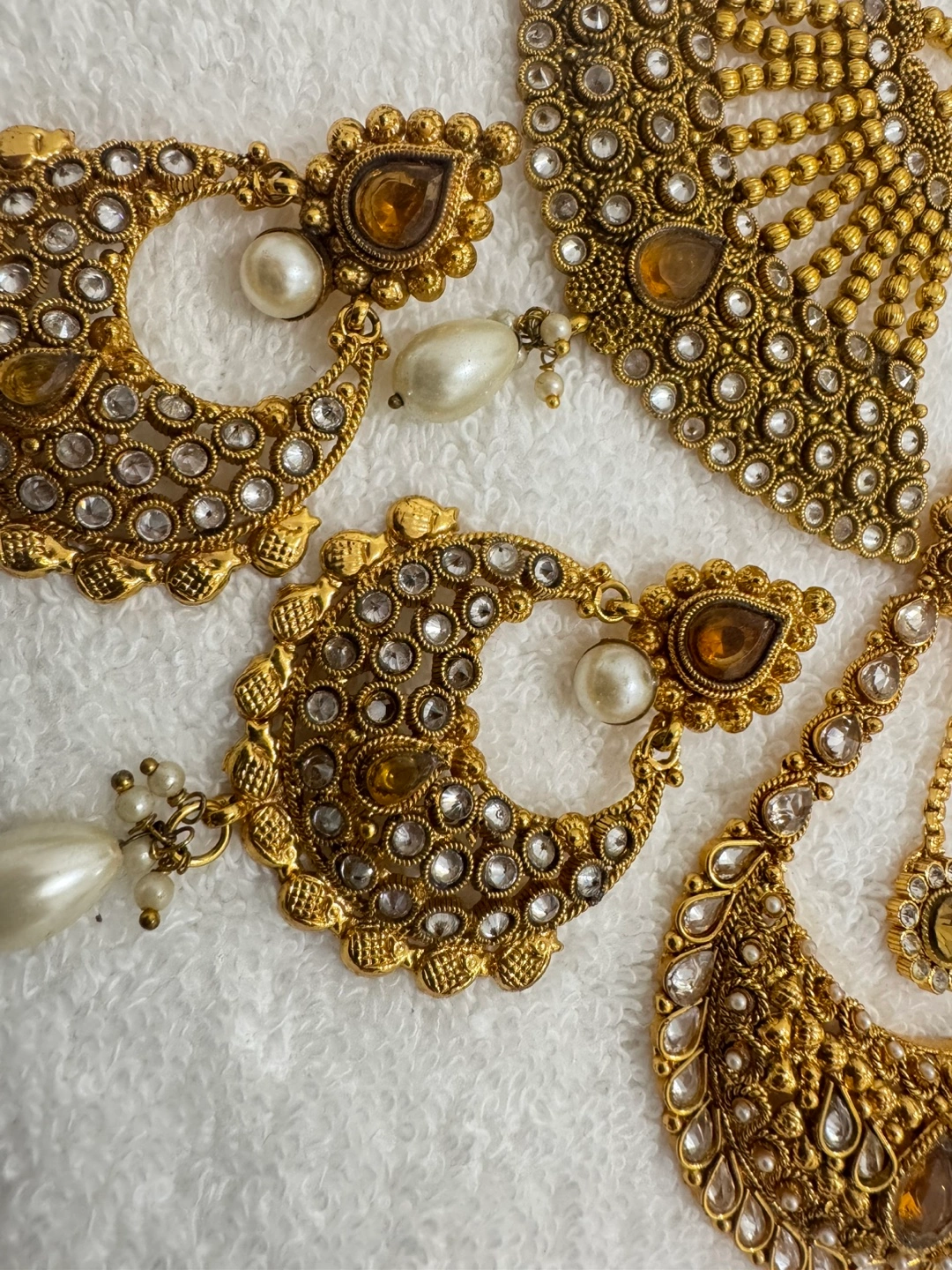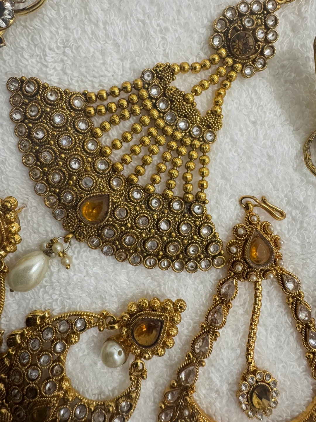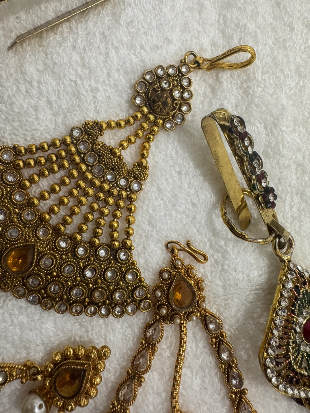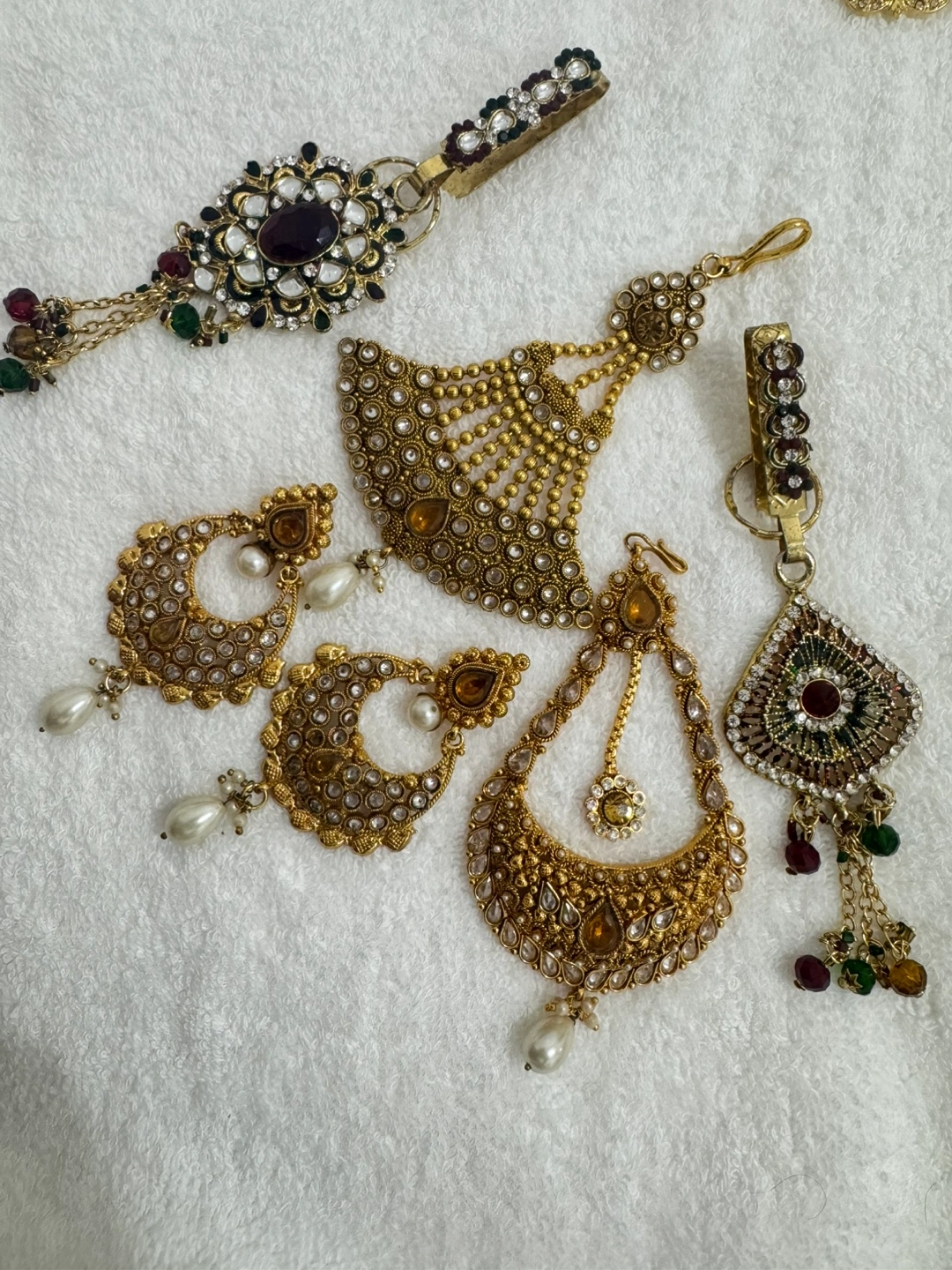 80Beautiful gold tone Indian bridal jewelry set. Includes earrings, maang tikka, and key chain. Features red, green, and clear stones. Perfect for weddings or special occasions.