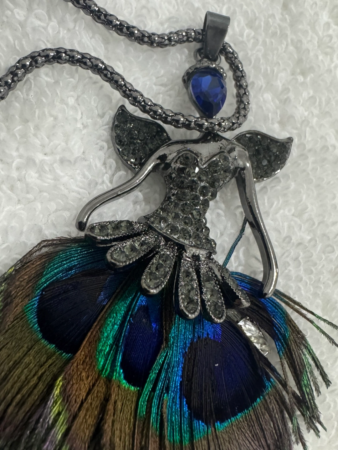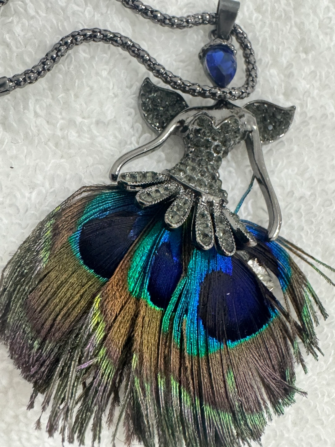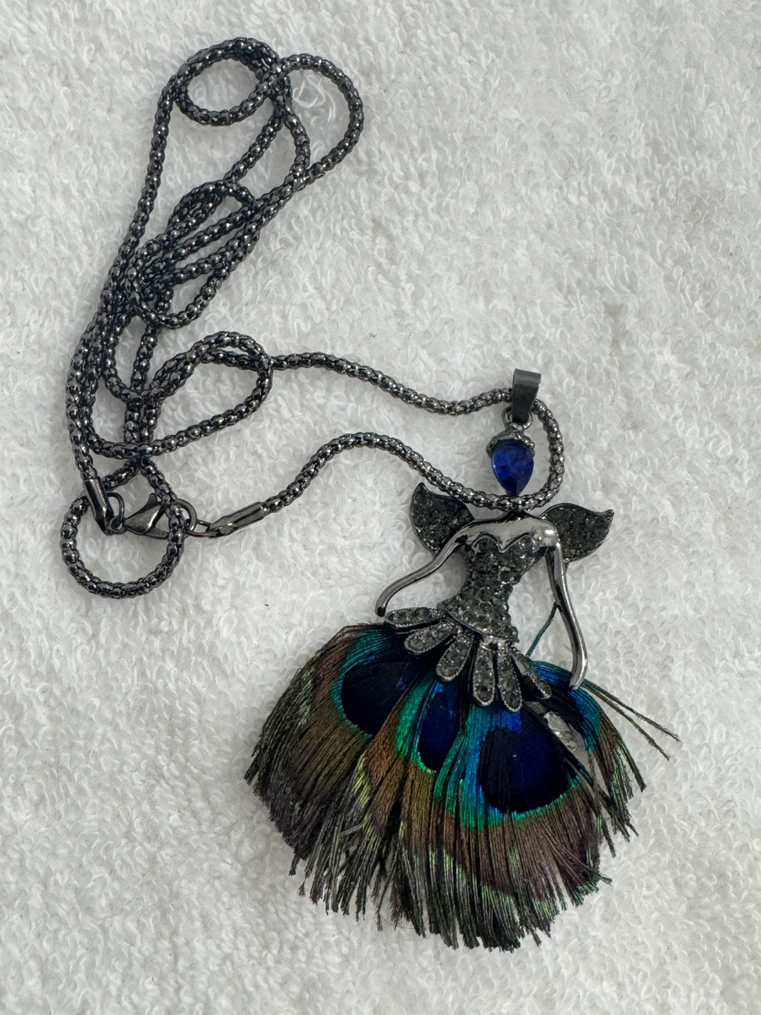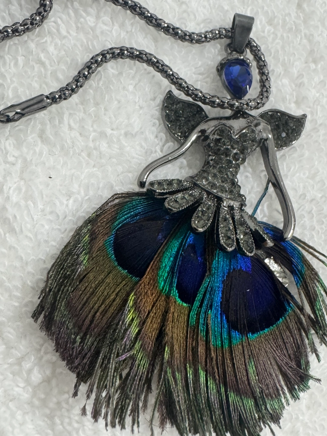 80Stunning peacock feather pendant necklace. Features a dark metal chain and intricate rhinestone detailing. Beautiful statement piece.