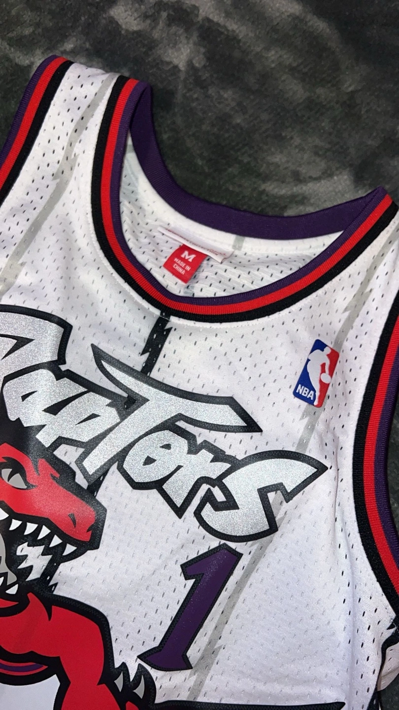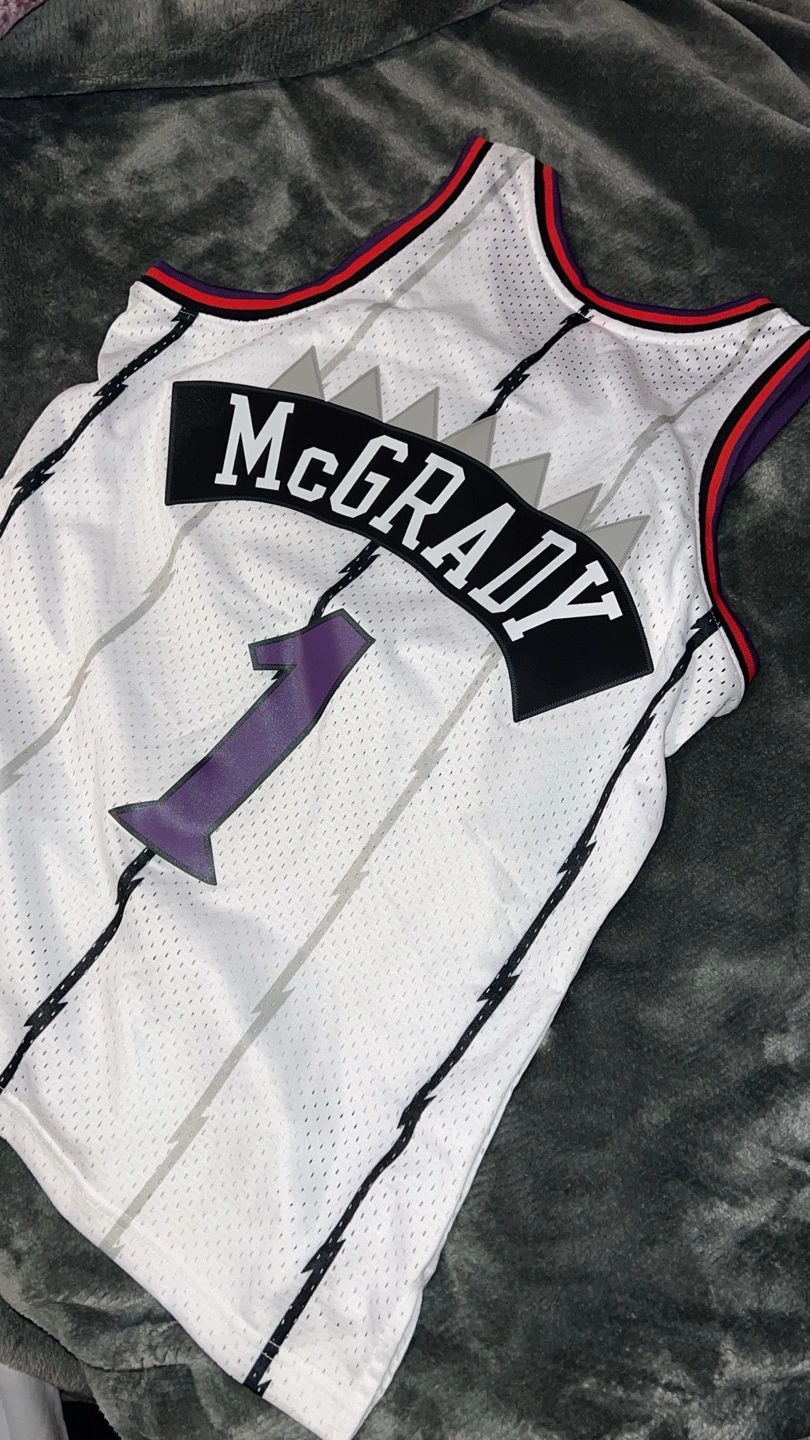 12Men's size medium Toronto Raptors jersey. Features Tracy McGrady's name and number. 1997-98 season design. Hardwood Classics edition.