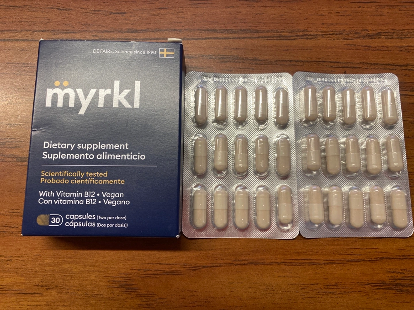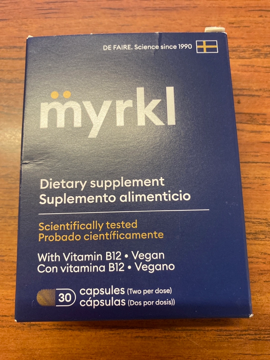 New, sealed box of Myrkl Vegan Vitamin B12 dietary supplement. 30 capsules, two per dose. Scientifically tested. Vegan. Additional information on Amazon. Exp date is 8/17/25.