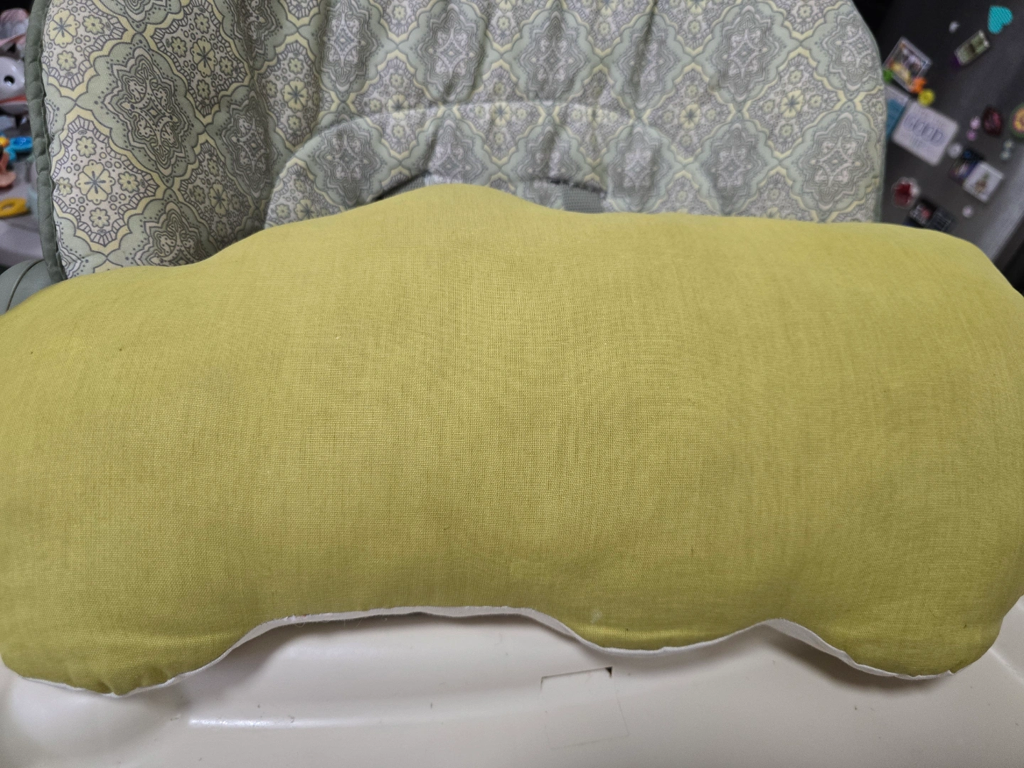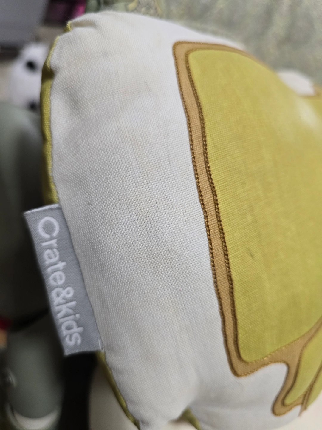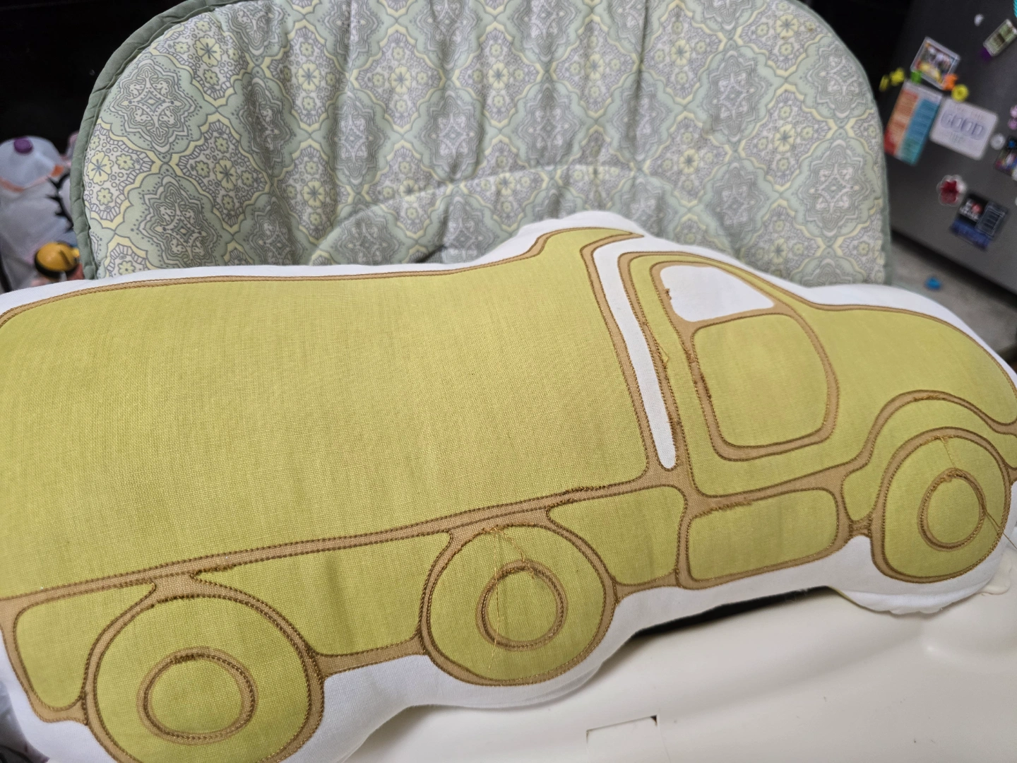 1000+preloved Adorable olive green dump truck-shaped pillow. Perfect for a child's room. Soft fabric. Good condition. needs a lil wash