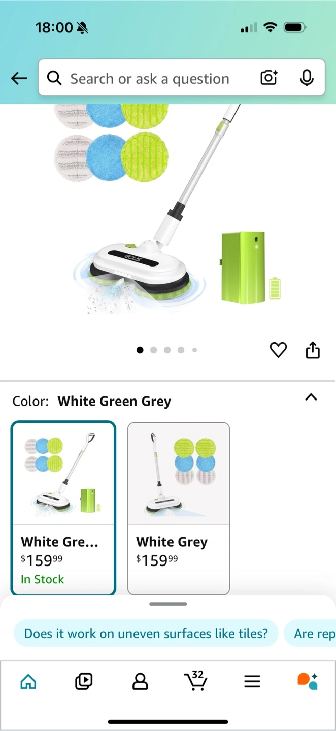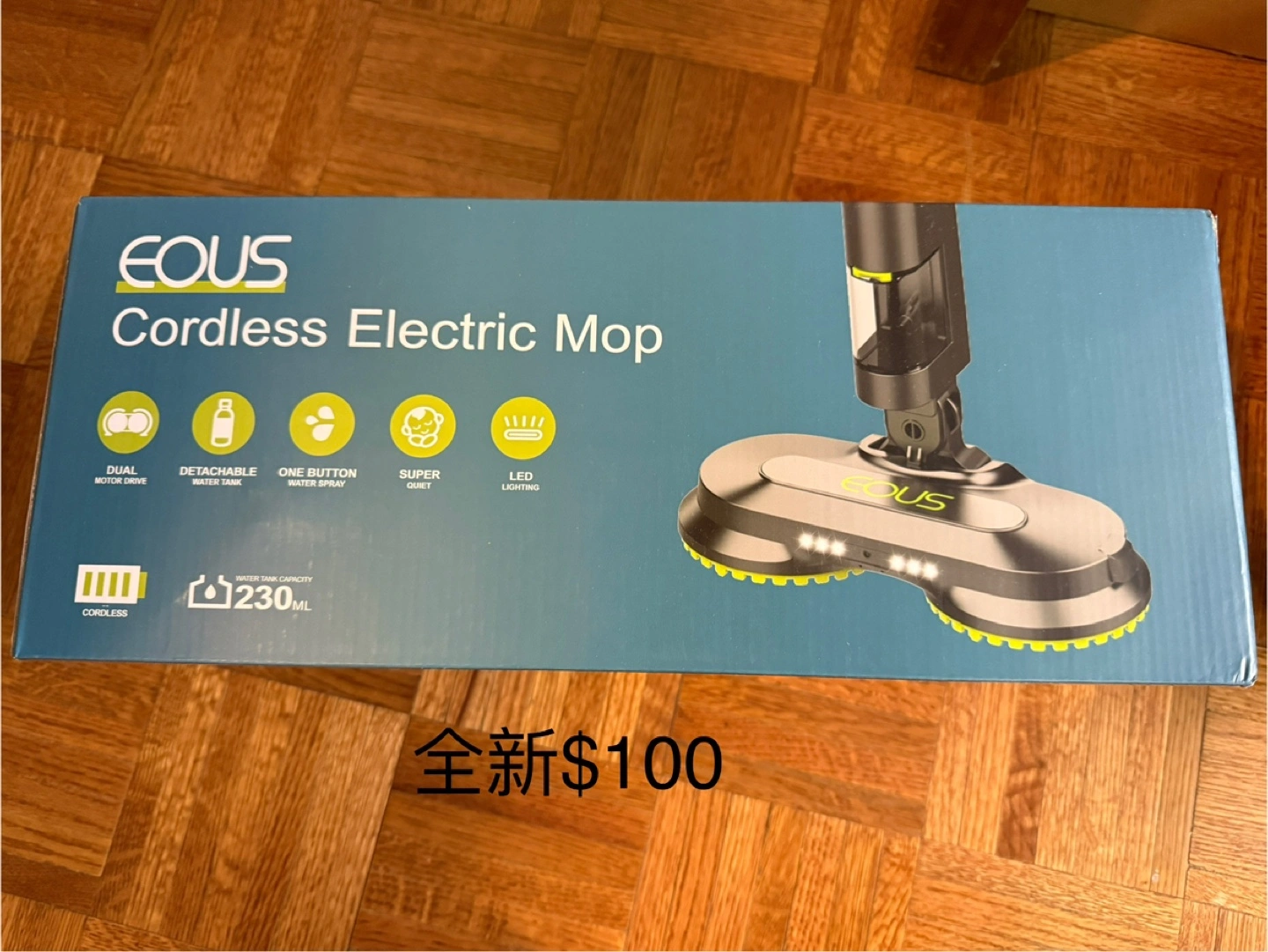 Brand new Eous cordless electric mop. Dual motor drive, detachable water tank, one-button water spray. Super quiet operation with LED lighting. 230ml water tank capacity. White, green, and grey color.(brand new in box)