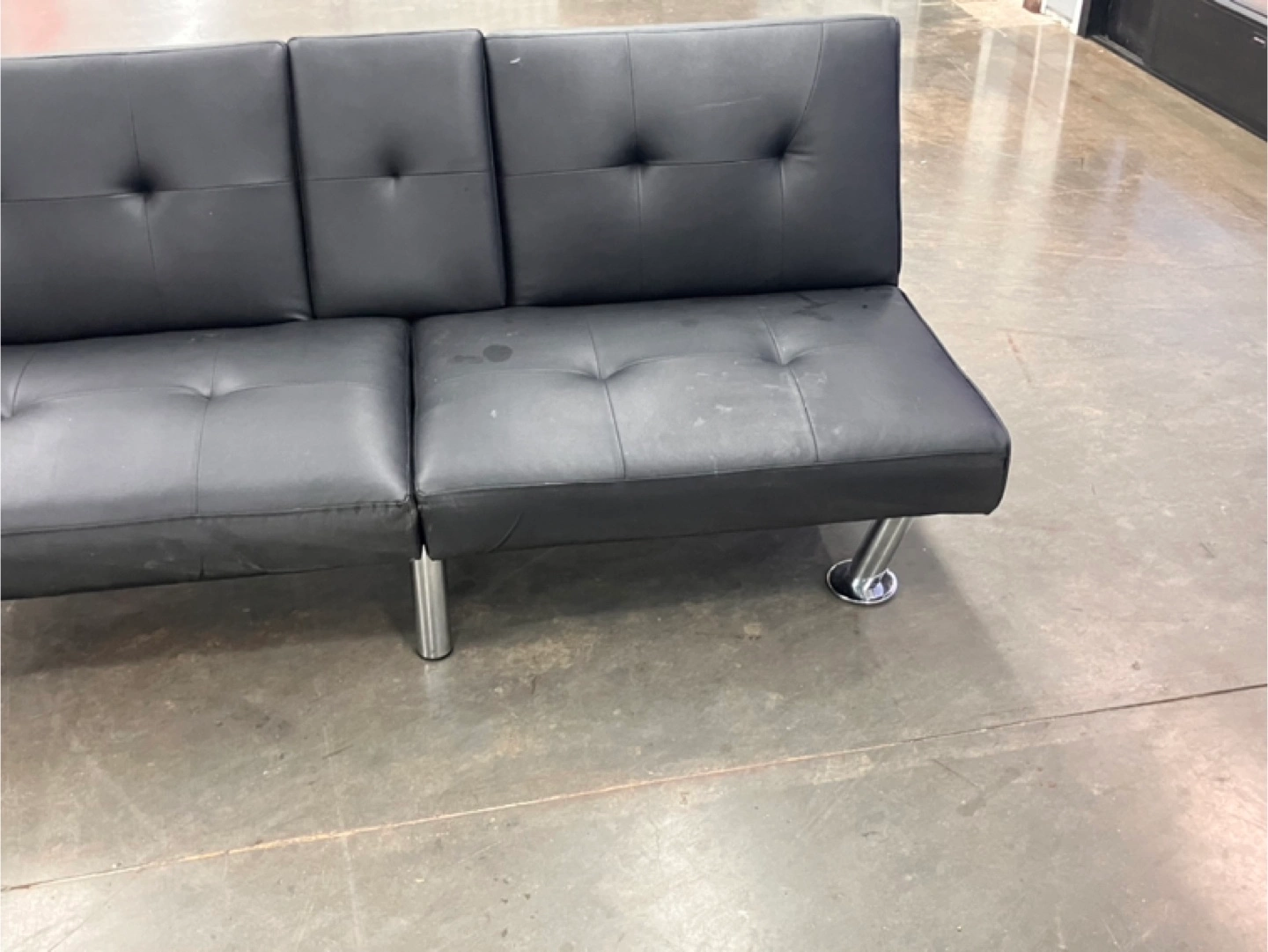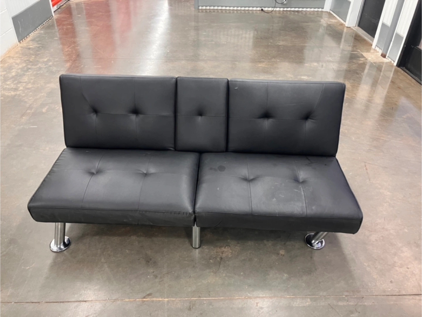 Black faux leather futon with cup holders. Metal legs. Good for small spaces. Some minor wear.