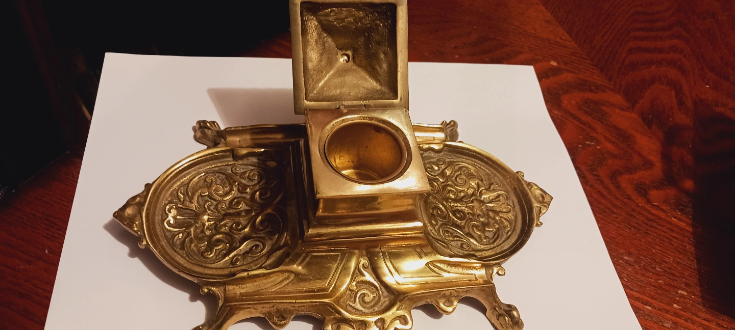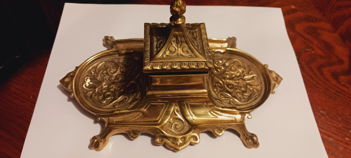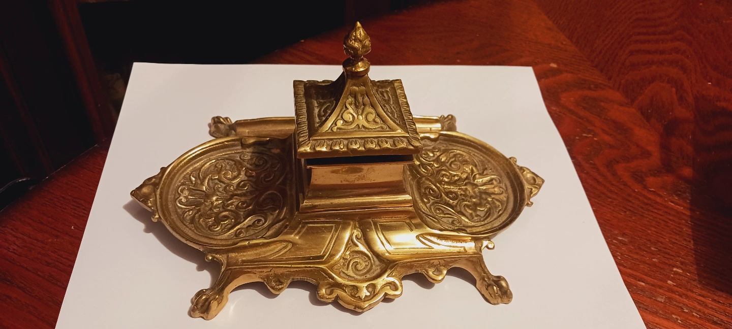 SALE !!! ONLY $20 !!! Absolutely Gorgeous Antique Ornate Lions Claw Footed Brass Inkwell with Pen Stand. intricate detailing. Features a hinged lidded inkwell. Excellent condition, like new. 9"×6". ALL MY PRICES ARE NEGOTIABLE !!!