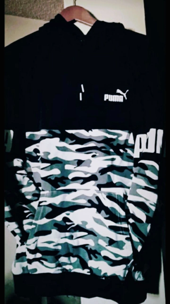 36Men's hooded sweatshirt. Black top, camo bottom. Long sleeves, kangaroo pocket. Puma logo.