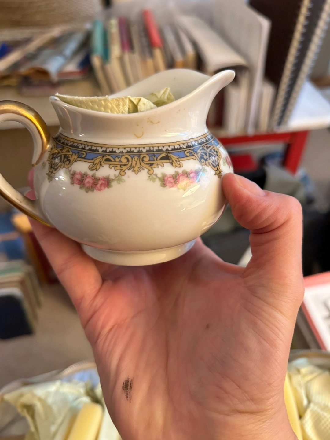 Elegant porcelain china. Features gold accents and delicate rose pattern. Made in France.