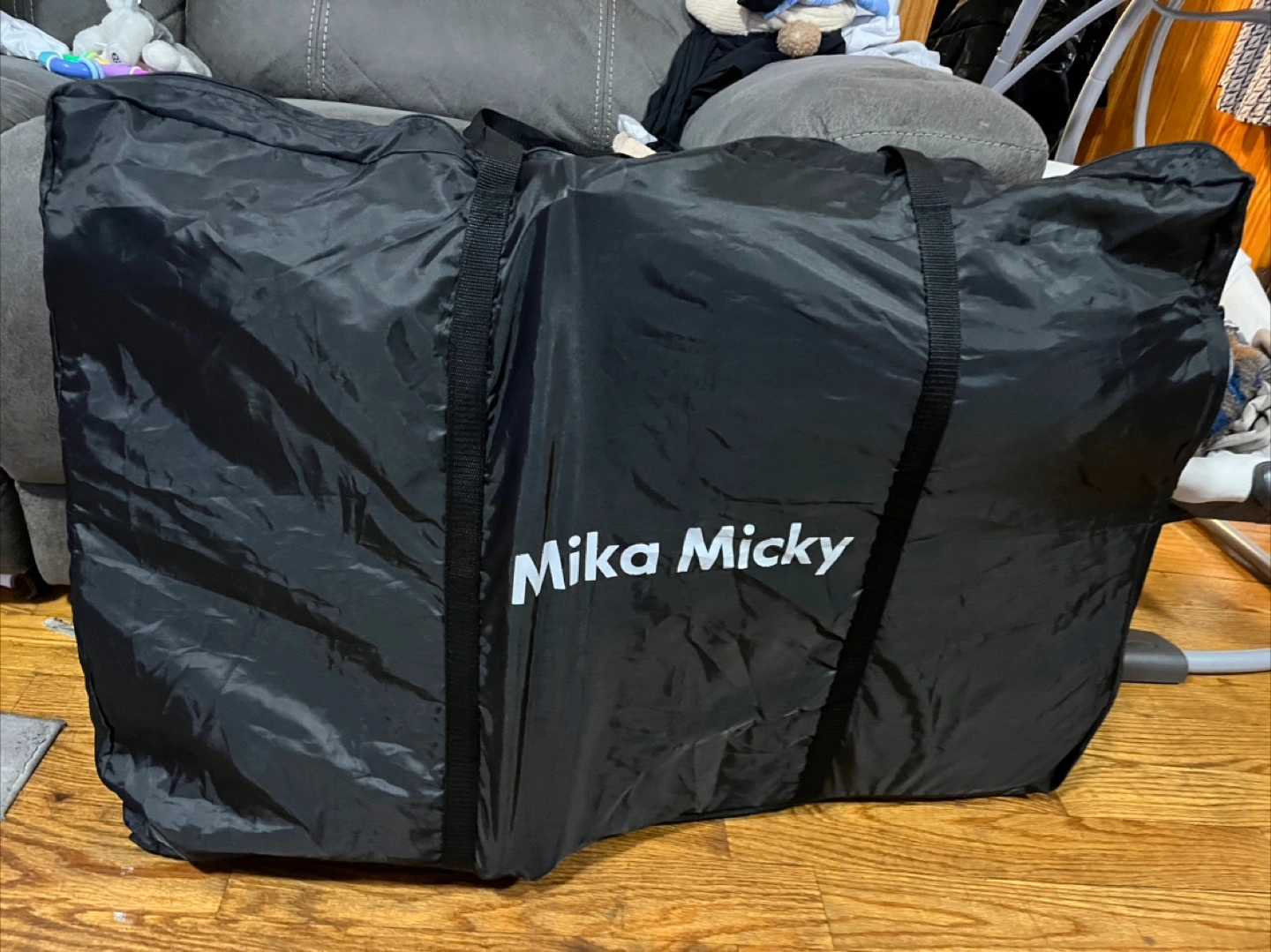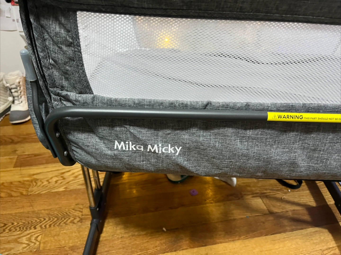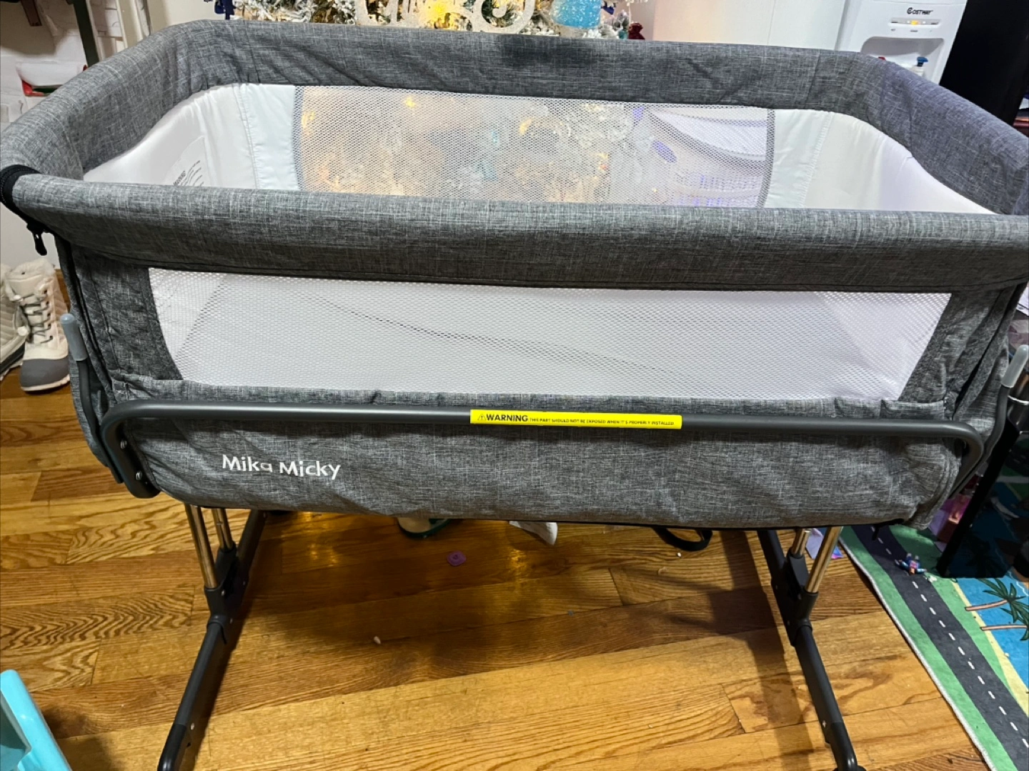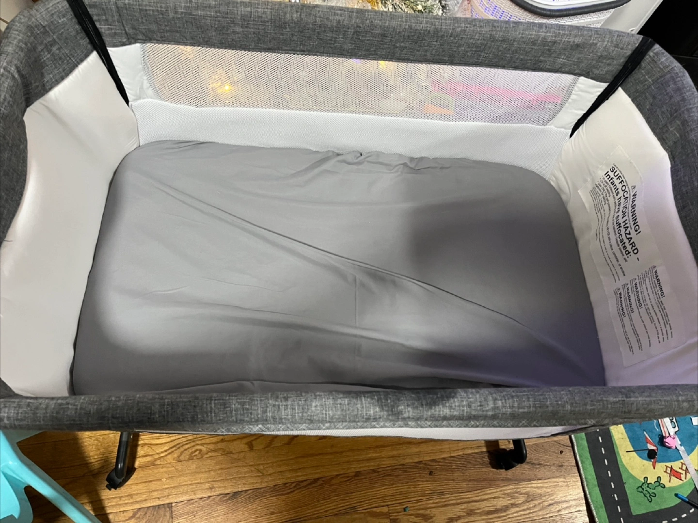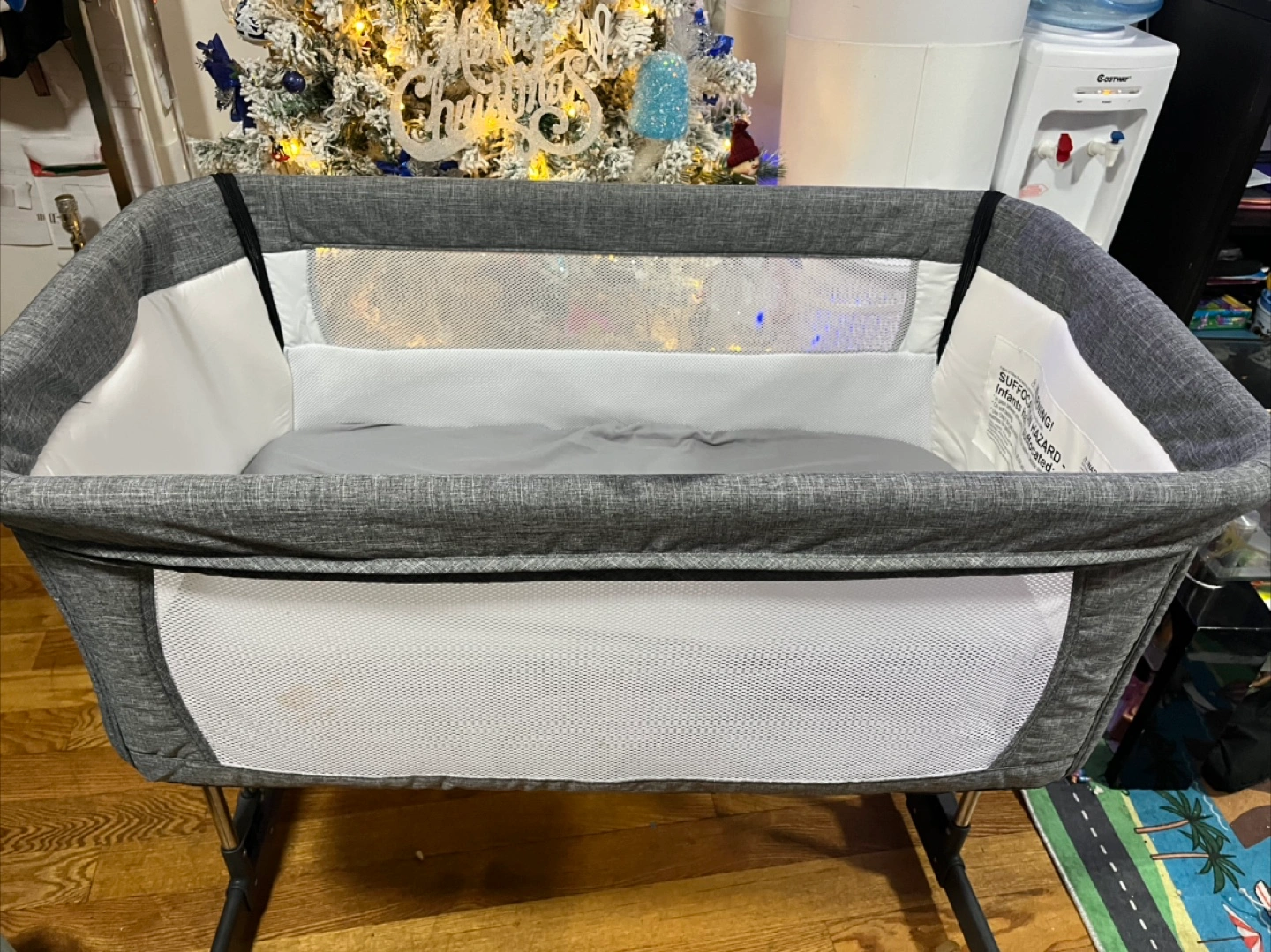 165Grey fabric bassinet. Includes carrying bag. Portable and easy to assemble.