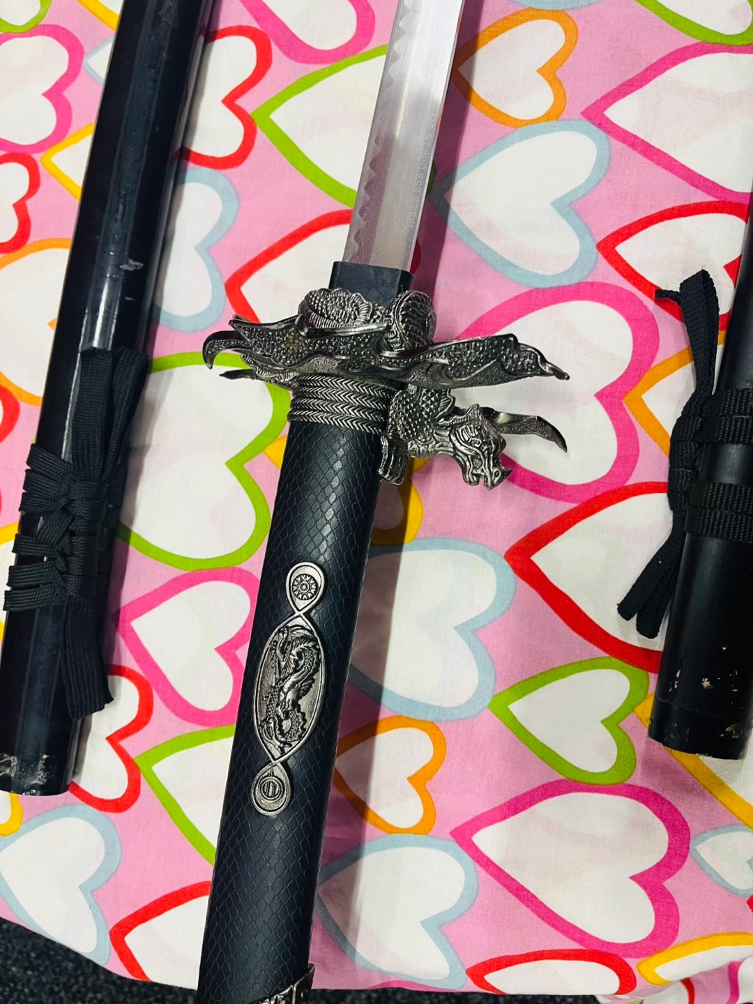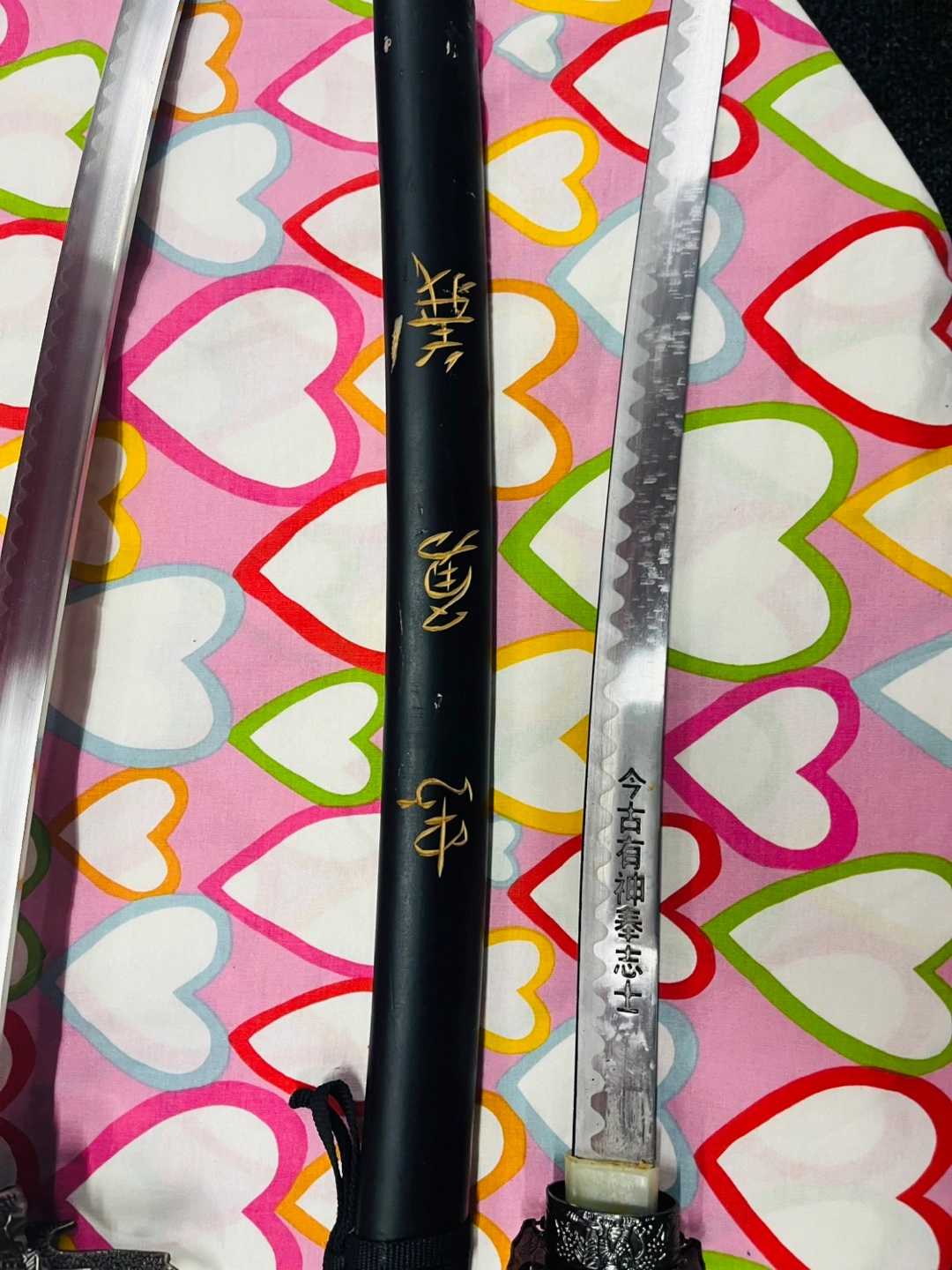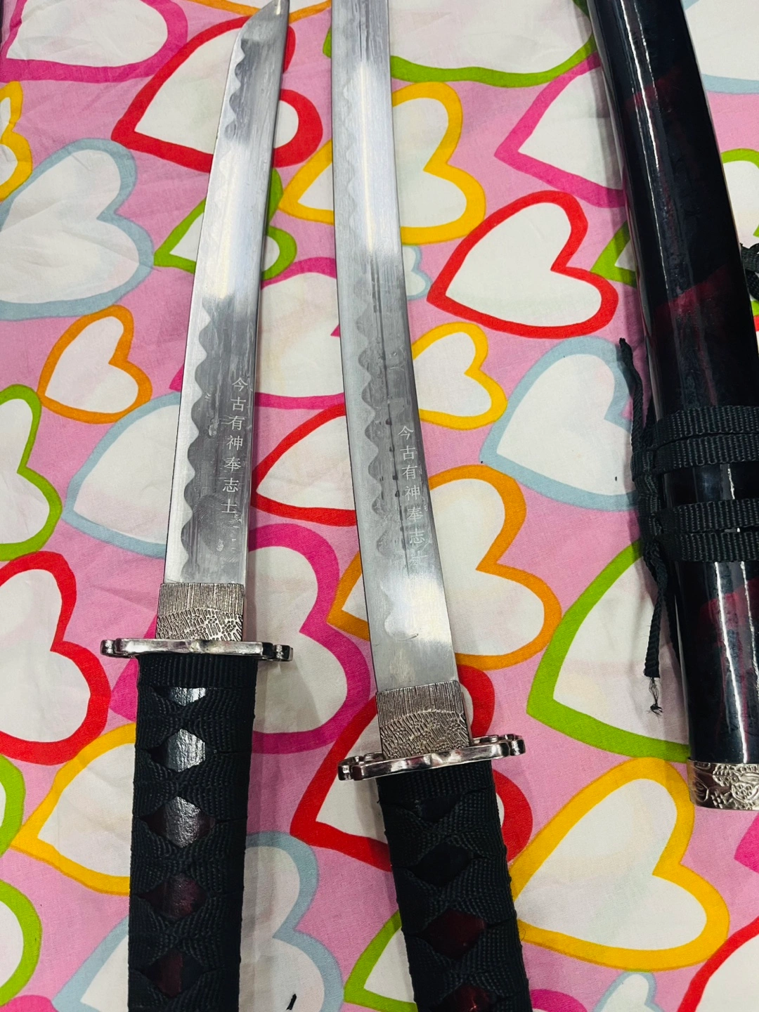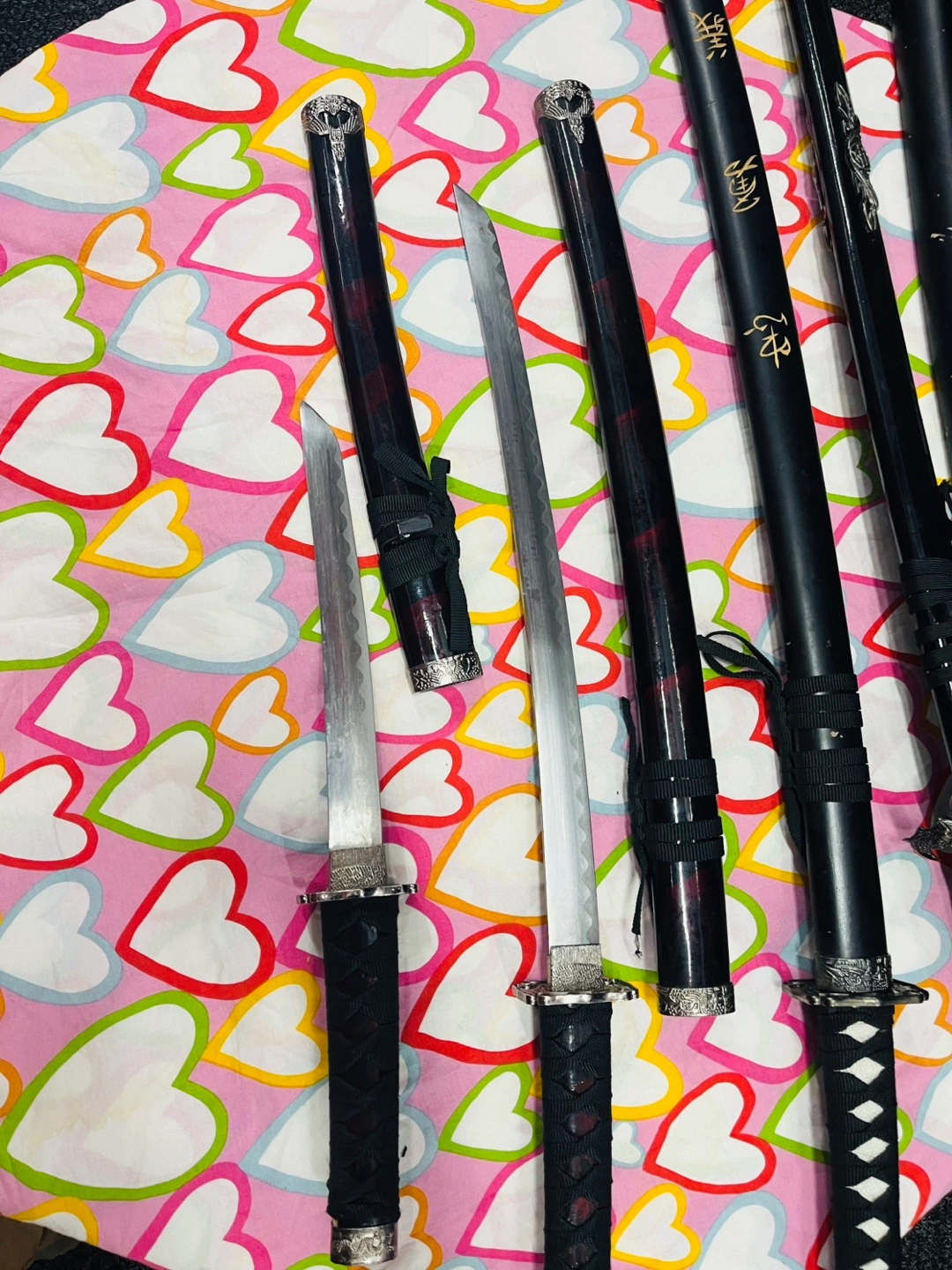 Four decorative katana swords. Black scabbards. Silver accents. Asian characters inscribed on blades and scabbards. Great for collectors or display.
