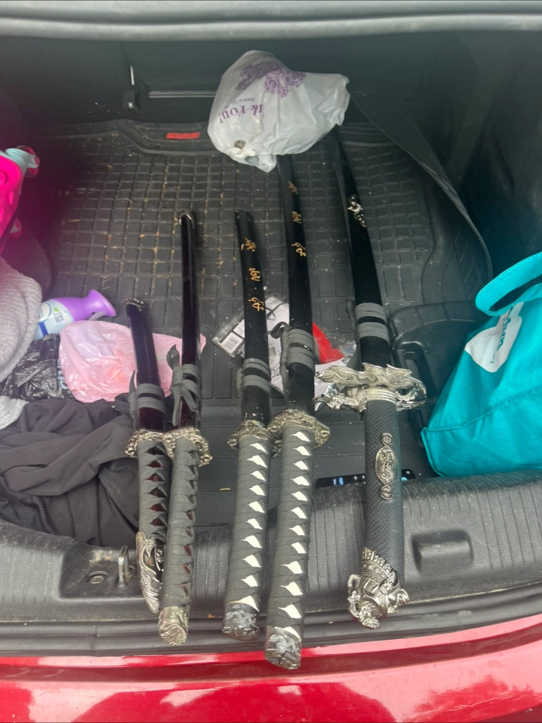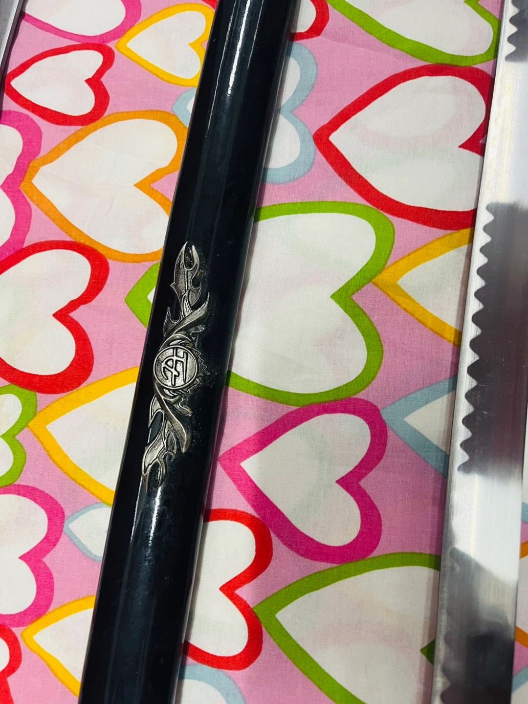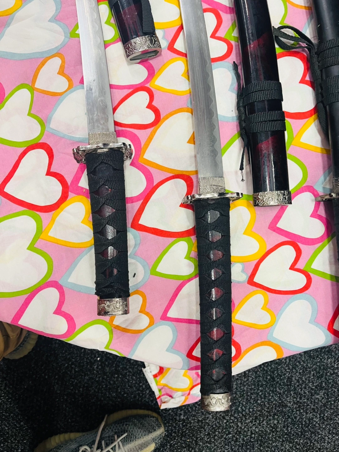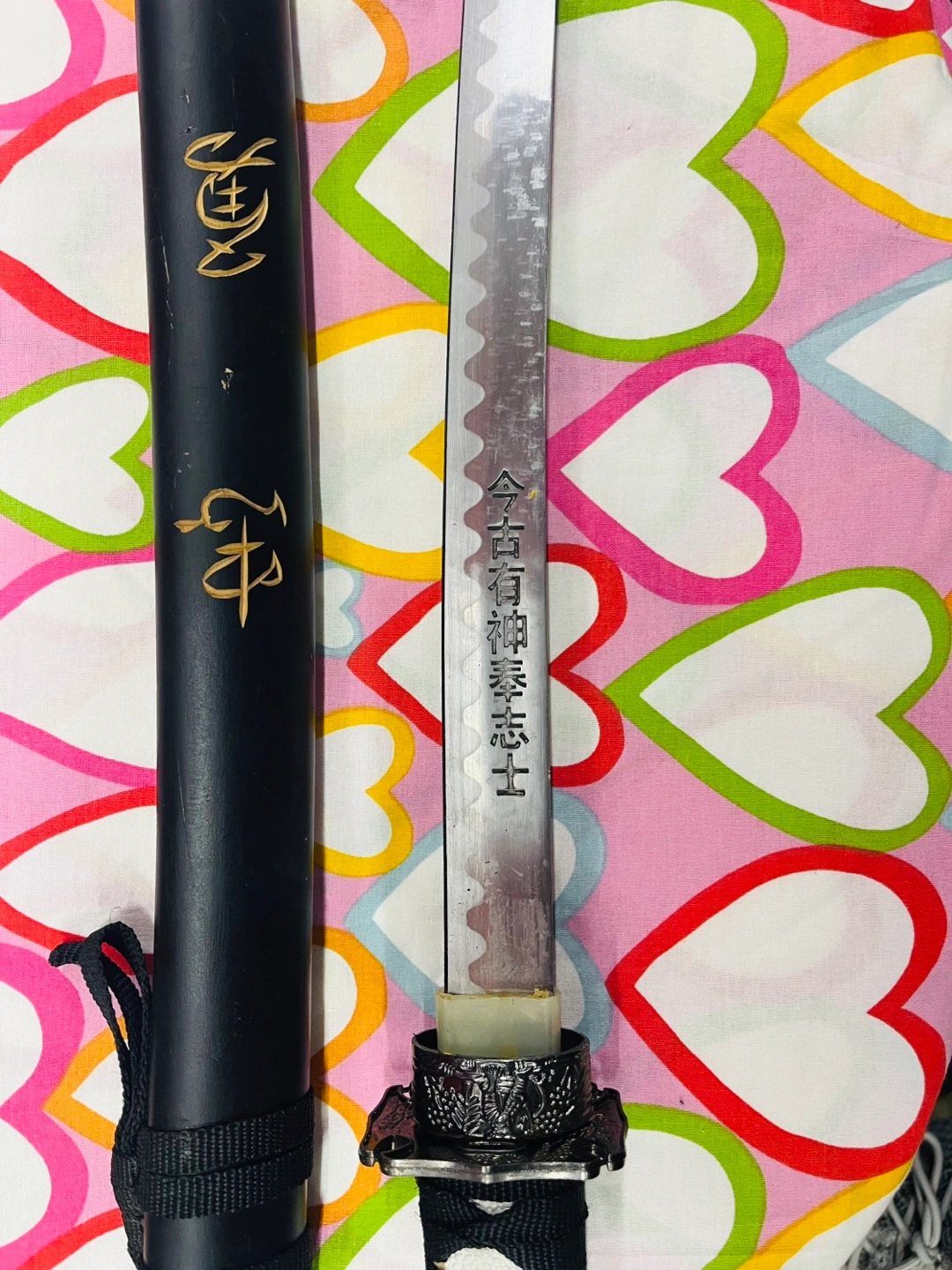 Four decorative katana swords. Black scabbards. Silver accents. Asian characters inscribed on blades and scabbards. Great for collectors or display.