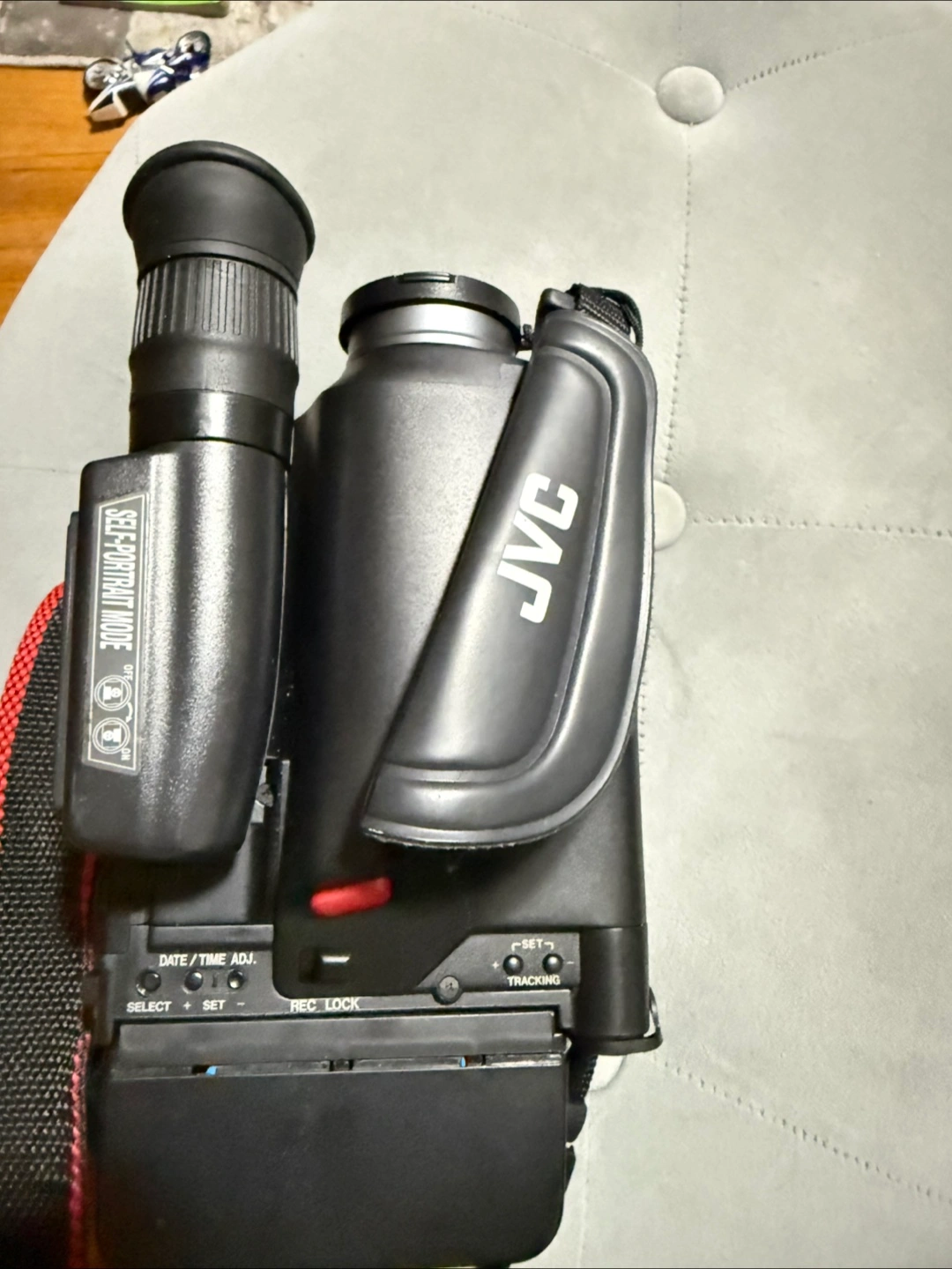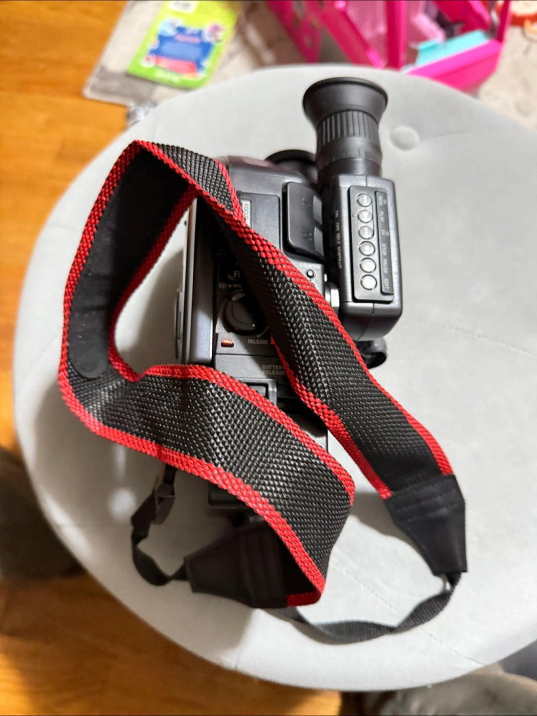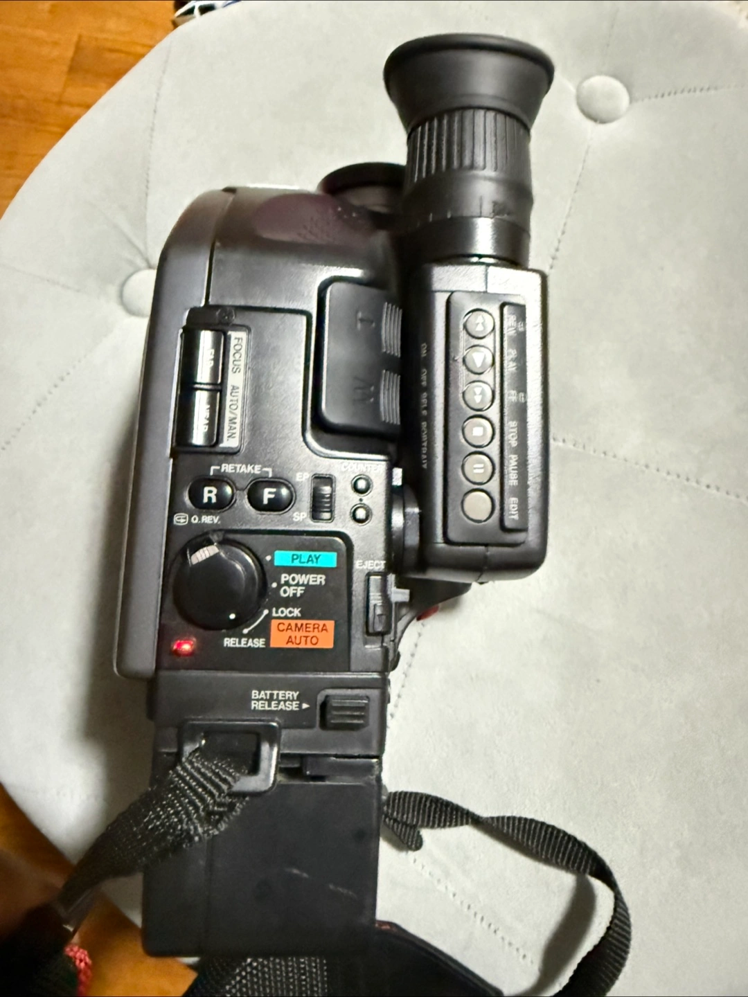 165Vintage camcorder. Features self-portrait mode. Includes shoulder strap. Great for retro videos.