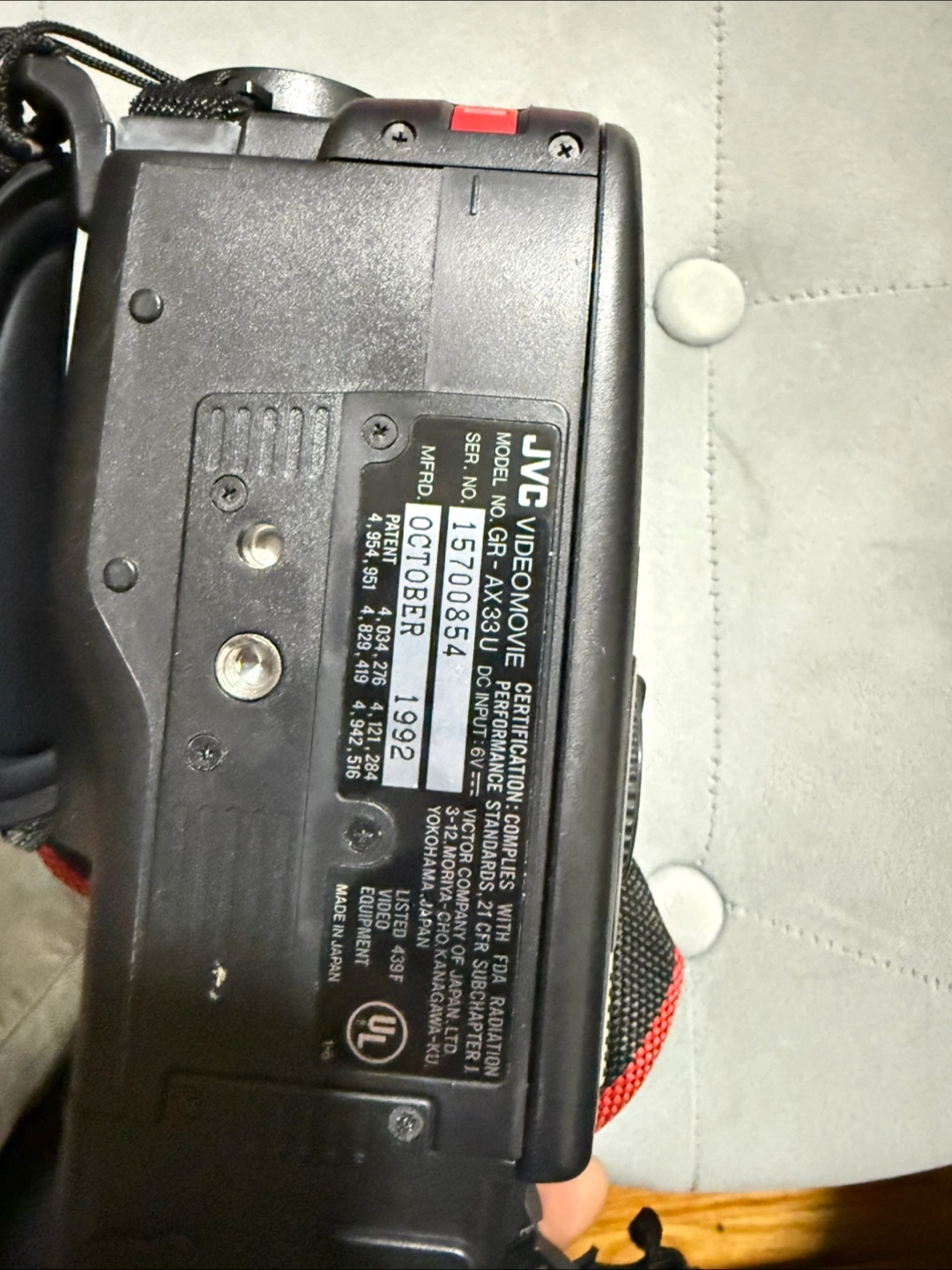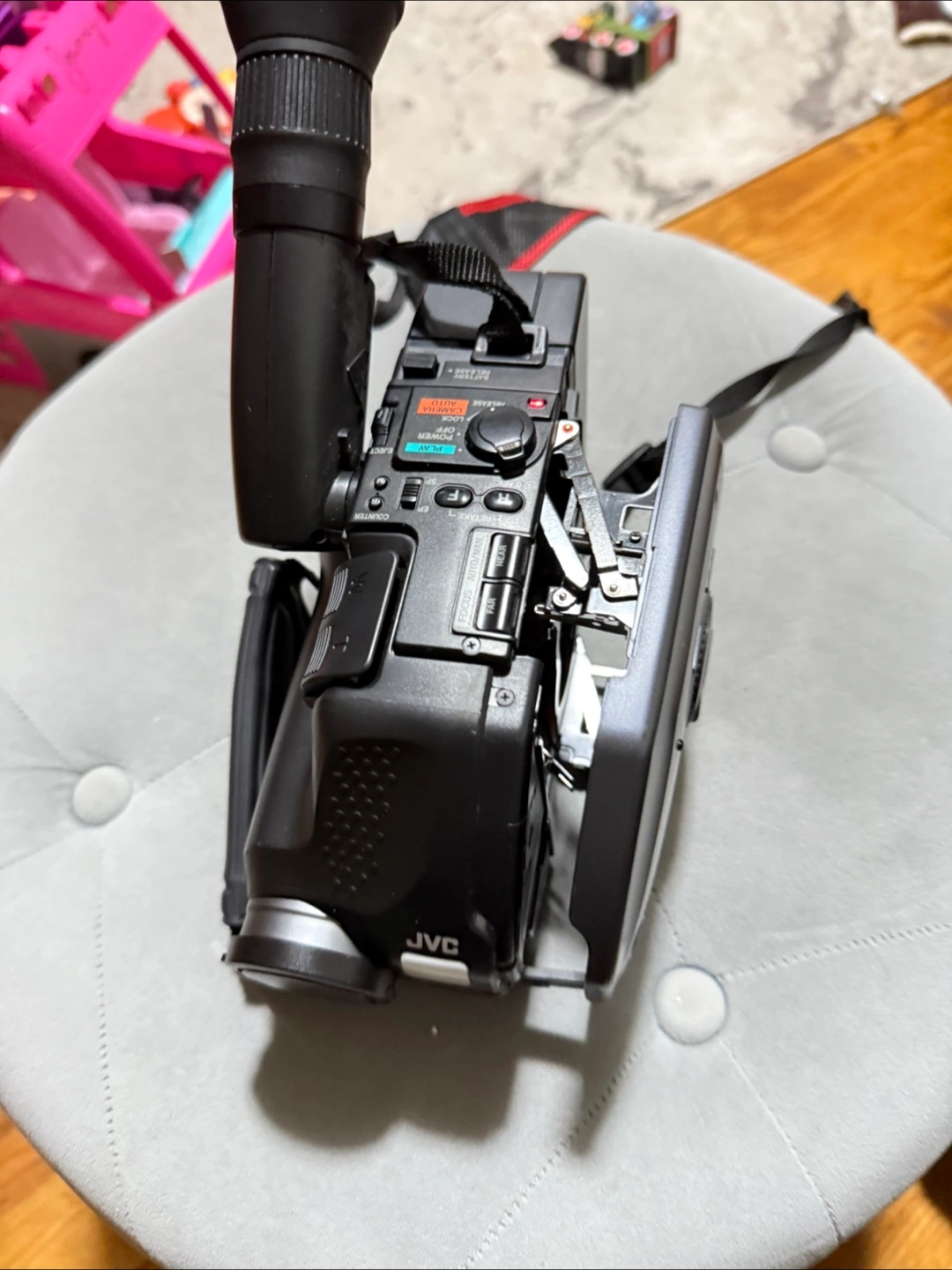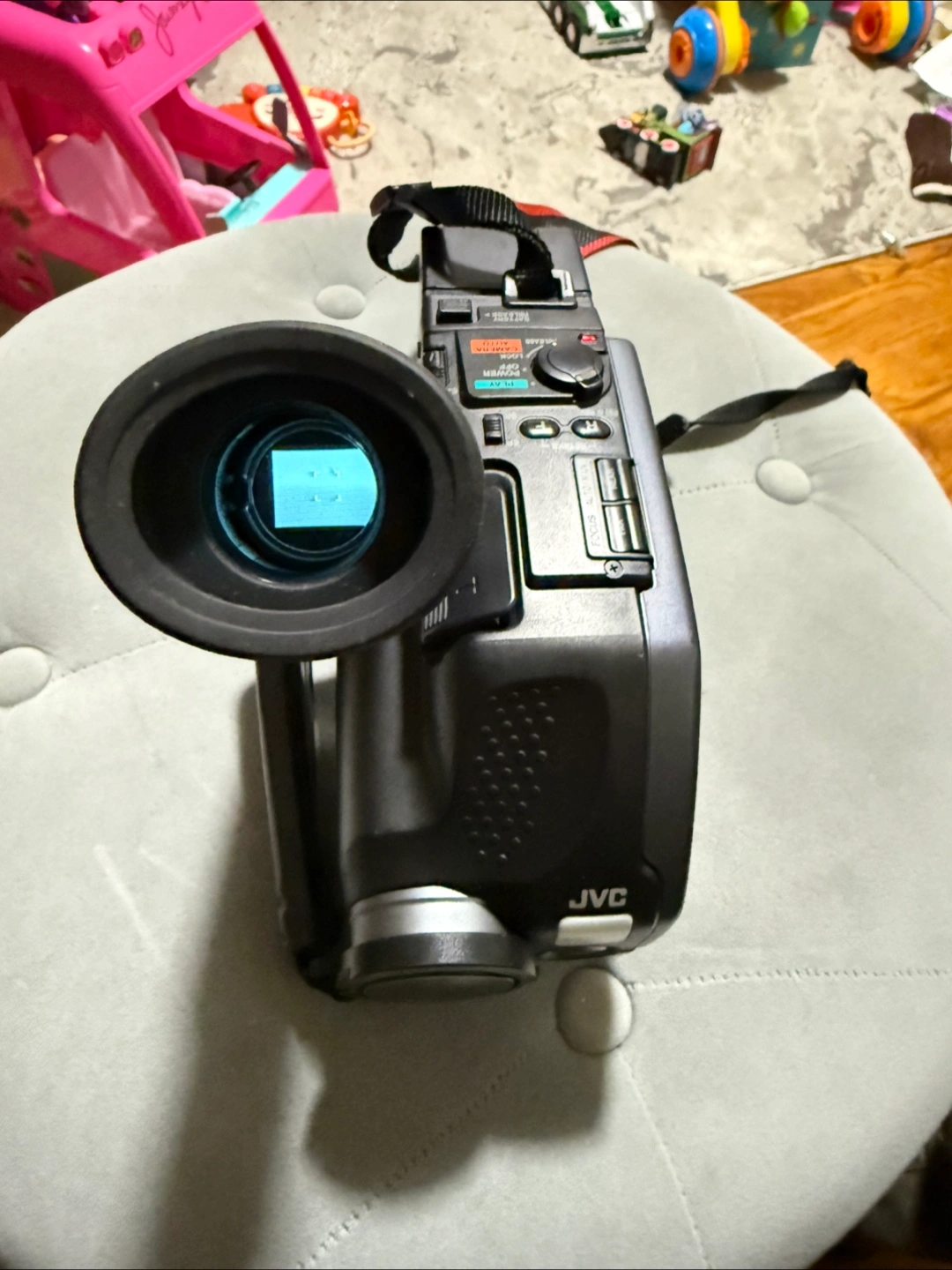 165Vintage camcorder. Features self-portrait mode. Includes shoulder strap. Great for retro videos.