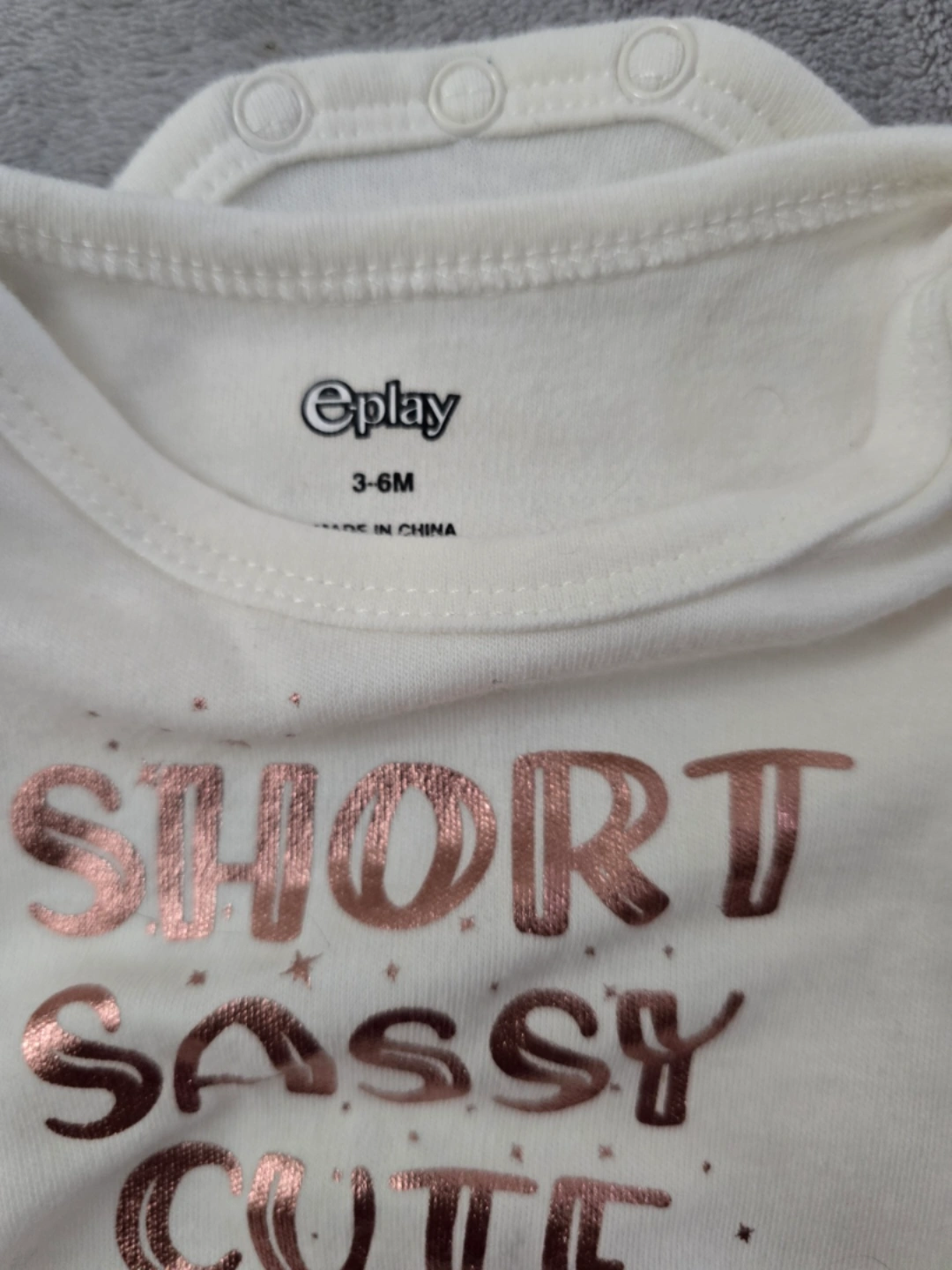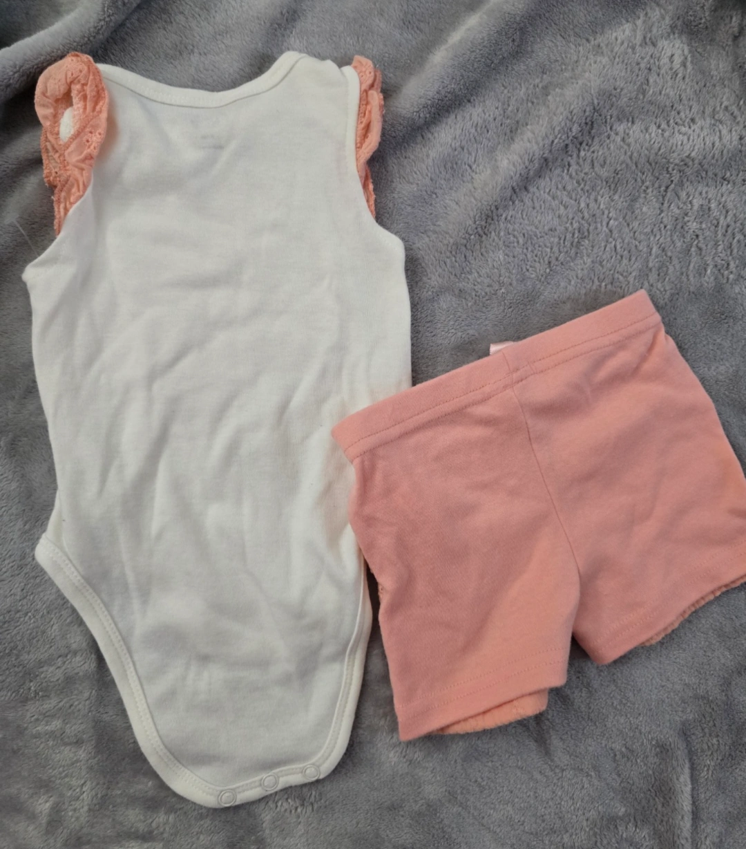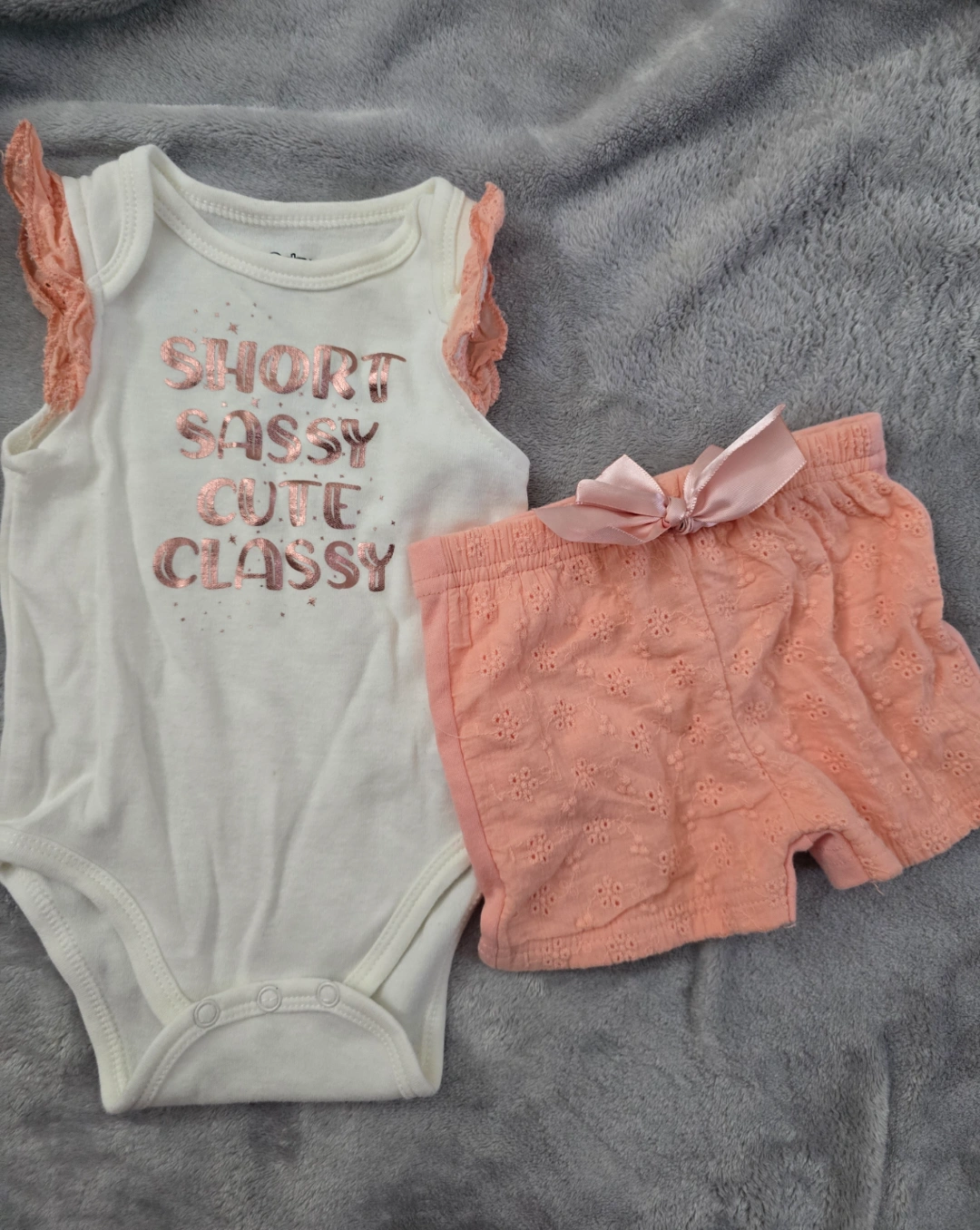 1000+preloved [worned once] Adorable baby girl outfit. Features a white bodysuit with a rose gold saying and a pair of peach shorts. Lace details on the bodysuit sleeves. Size 3-6 months.