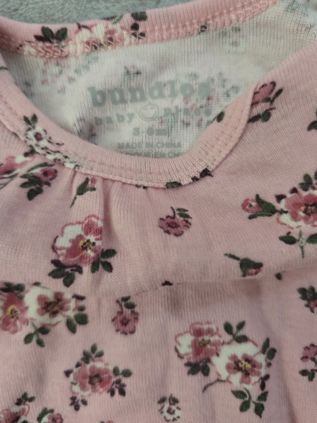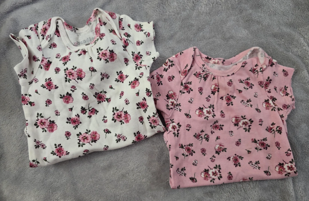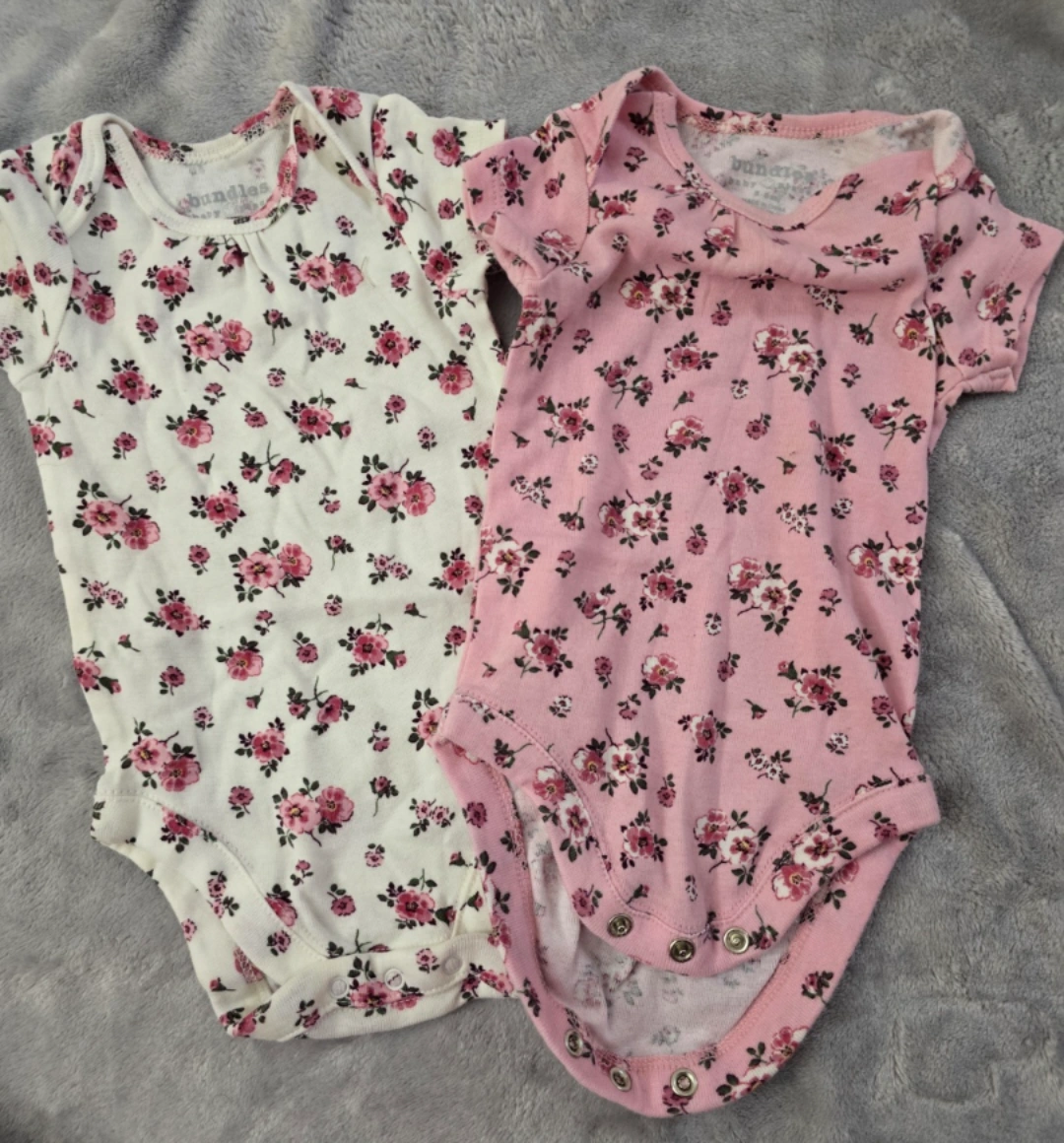 1000+[worned once] Two baby girl bodysuits. Short sleeves. Floral print. One pink, one cream.