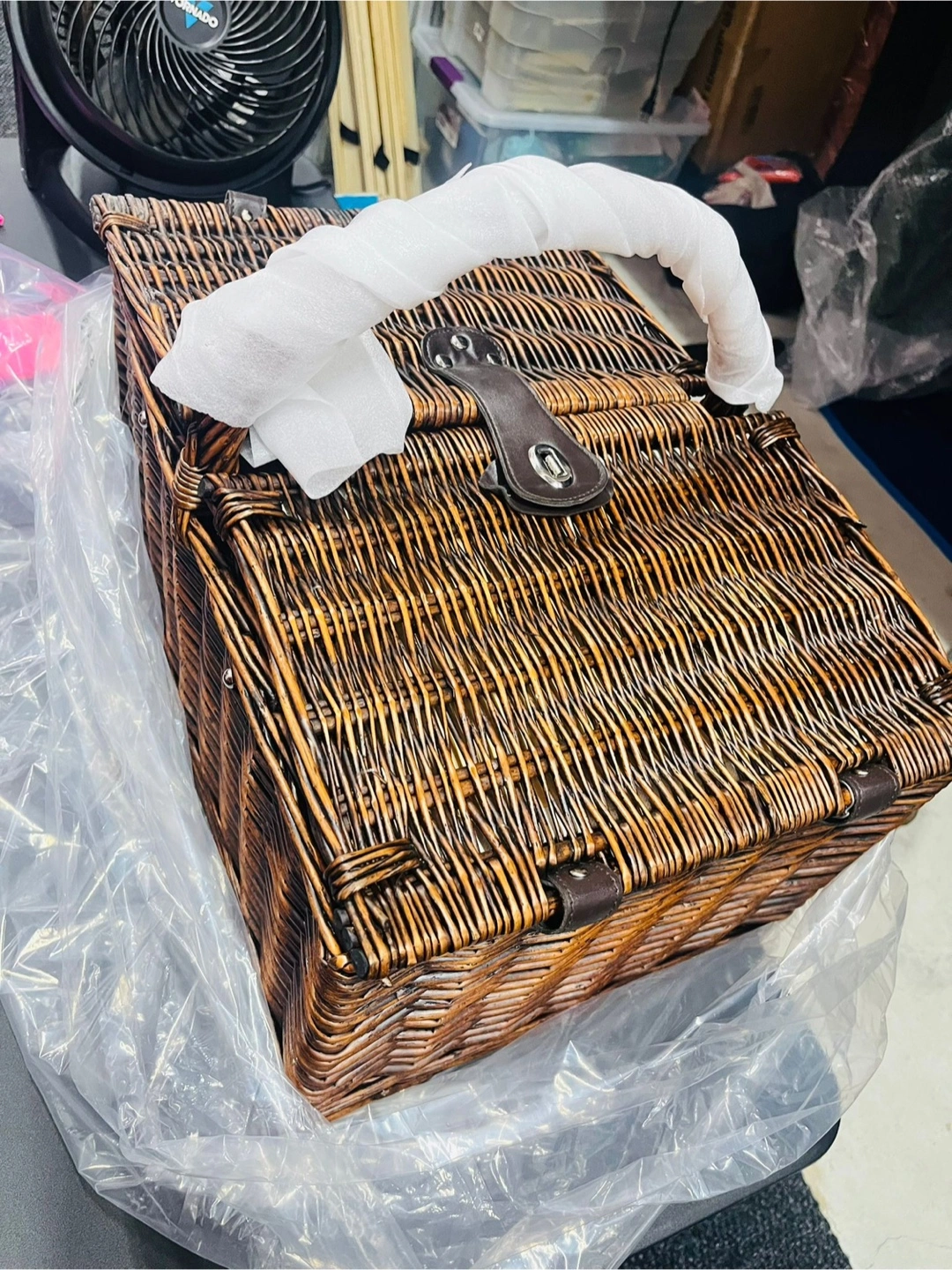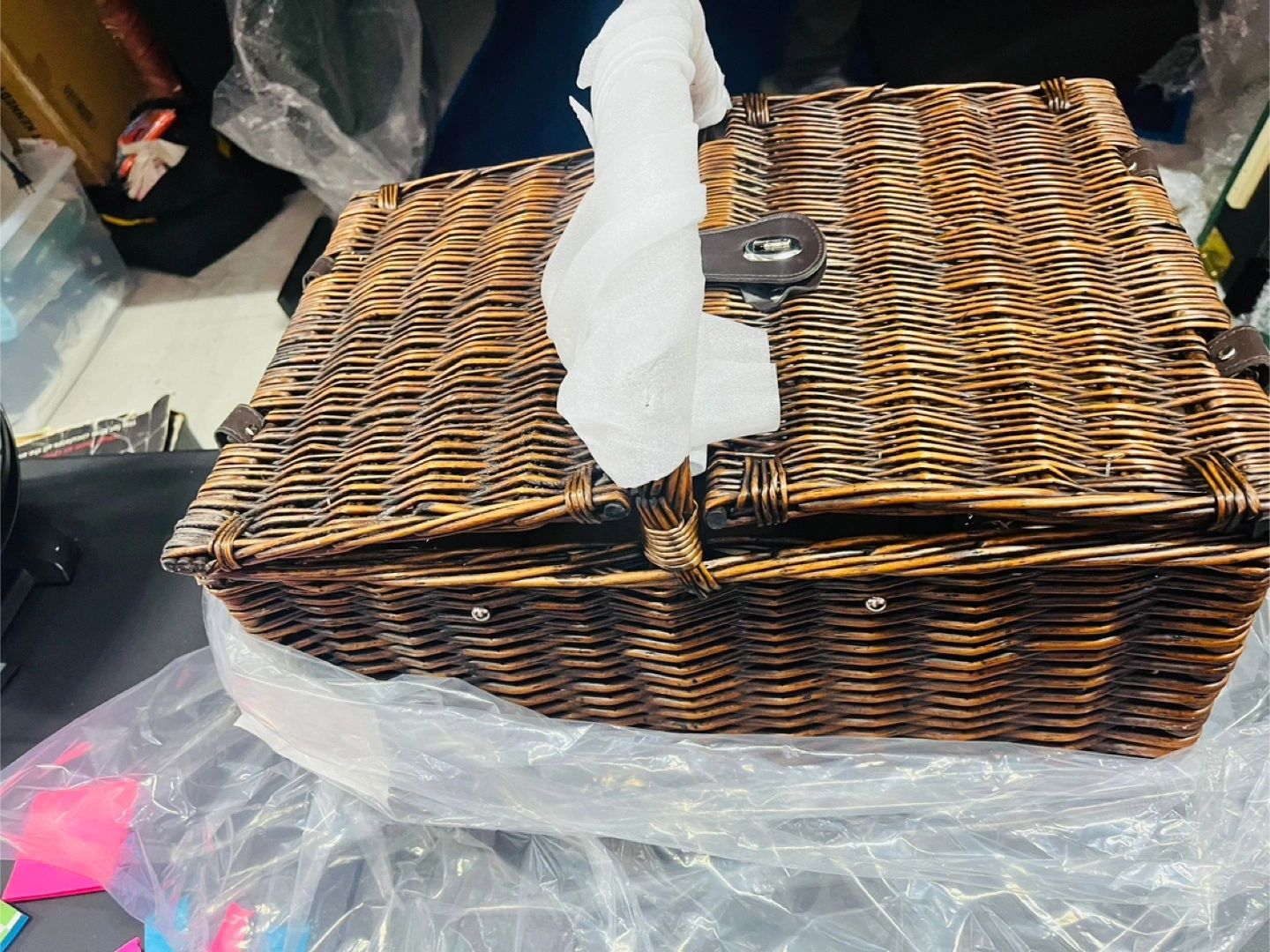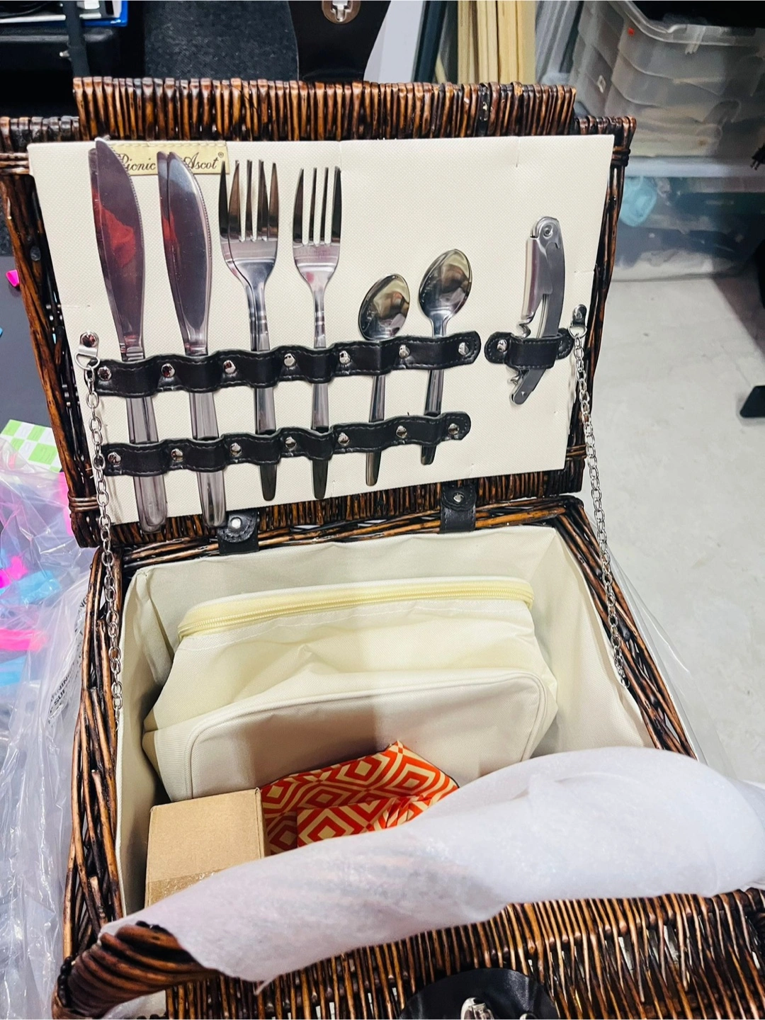 Brown wicker picnic basket. Includes utensils and a small cooler bag. Perfect for outdoor adventures.