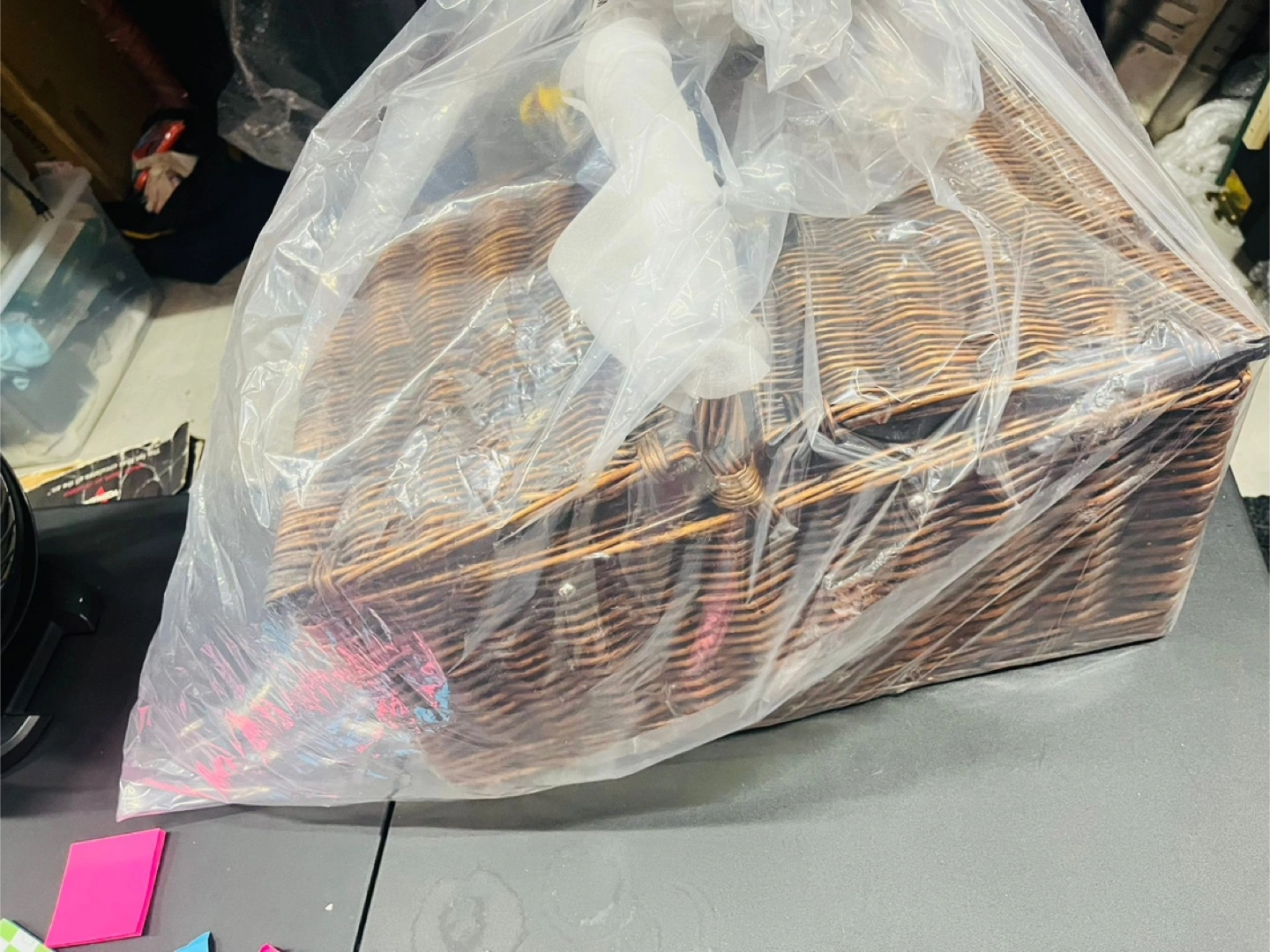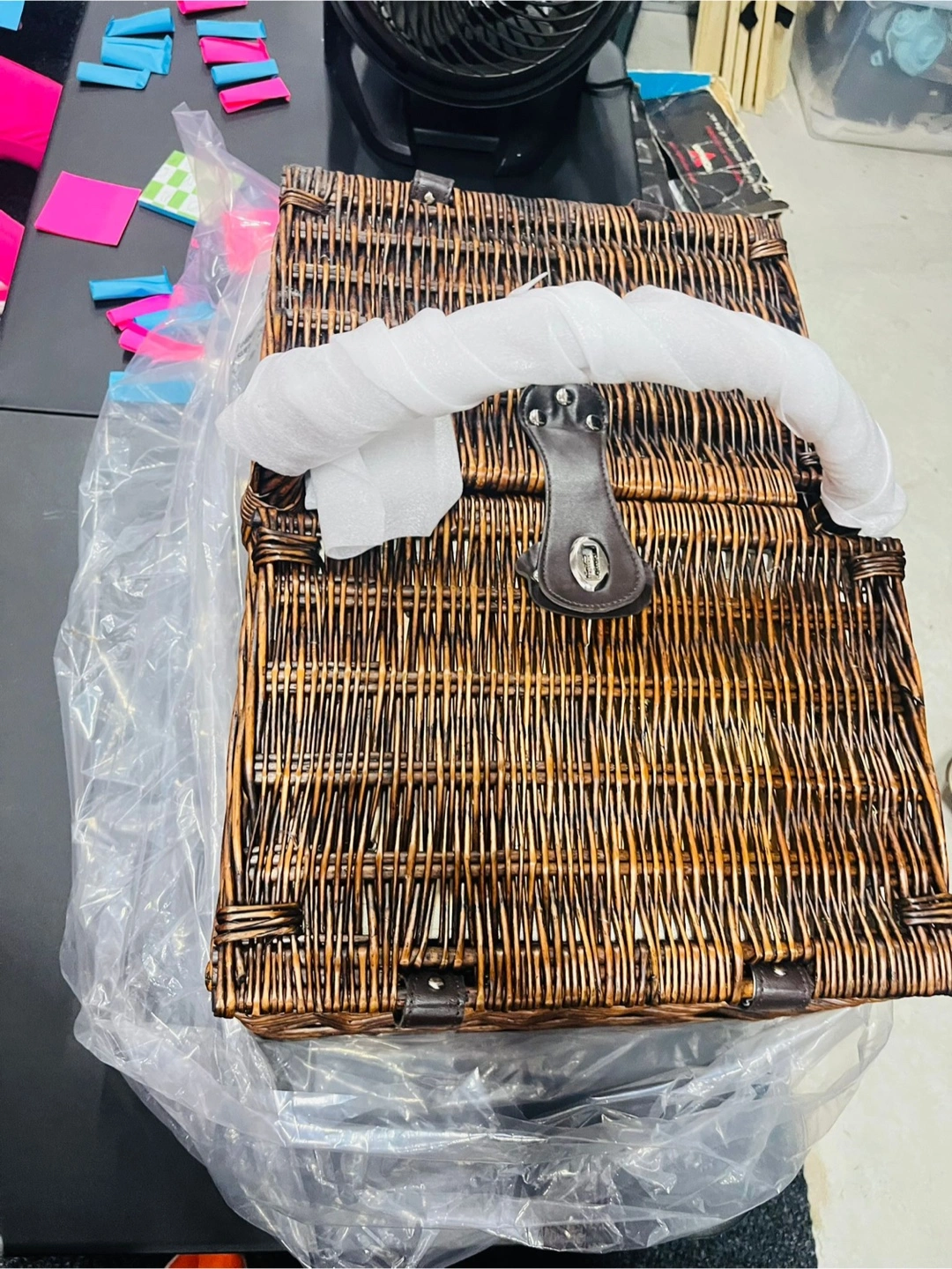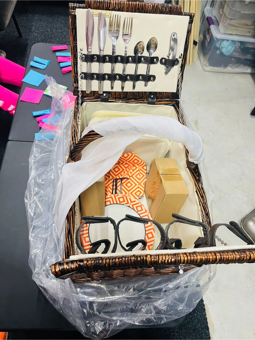 Brown wicker picnic basket. Includes utensils and a small cooler bag. Perfect for outdoor adventures.