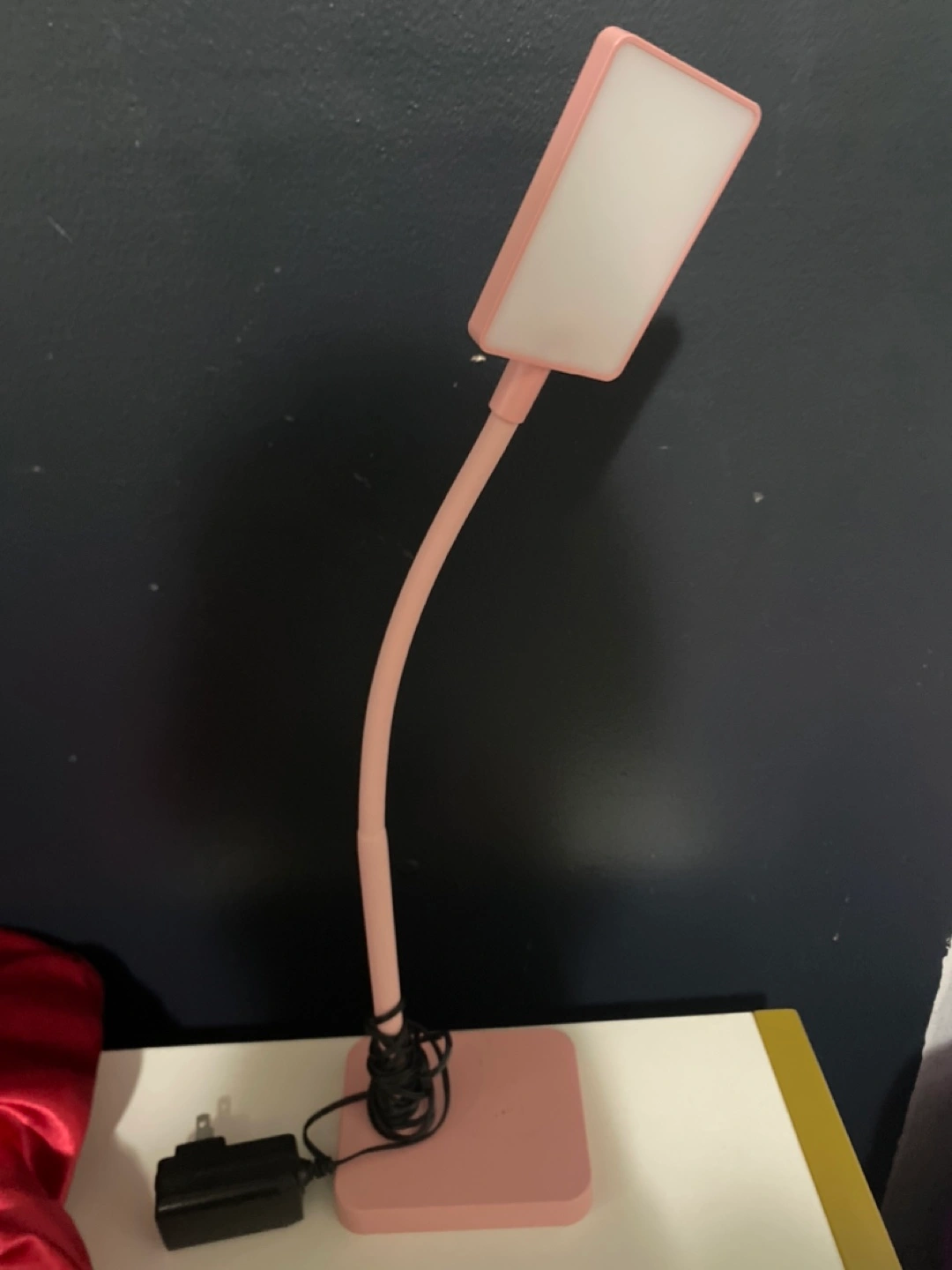 172Flexible gooseneck. Square light panel. Pink plastic base and arm. Includes power adapter.