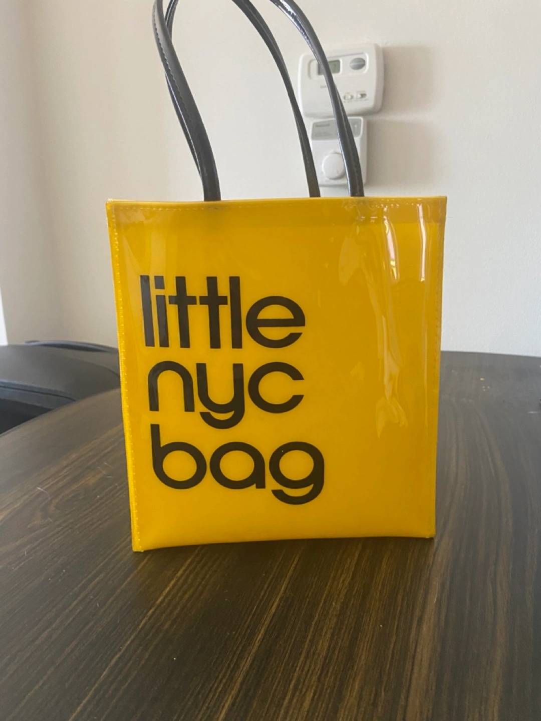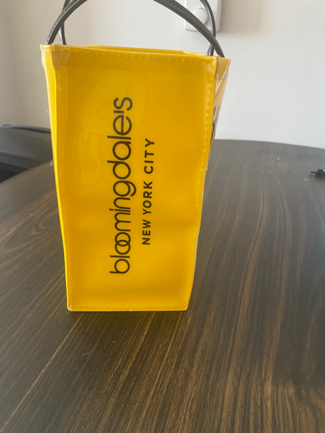 Small yellow tote bag. Bloomingdale's branding. Black handles. Glossy finish. Perfect for shopping or everyday use.