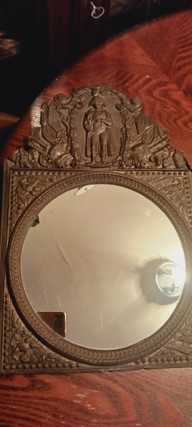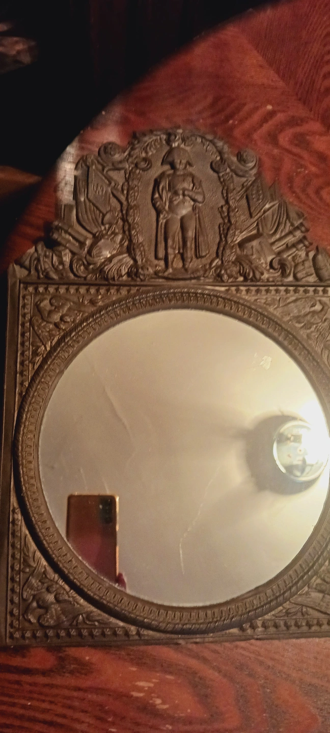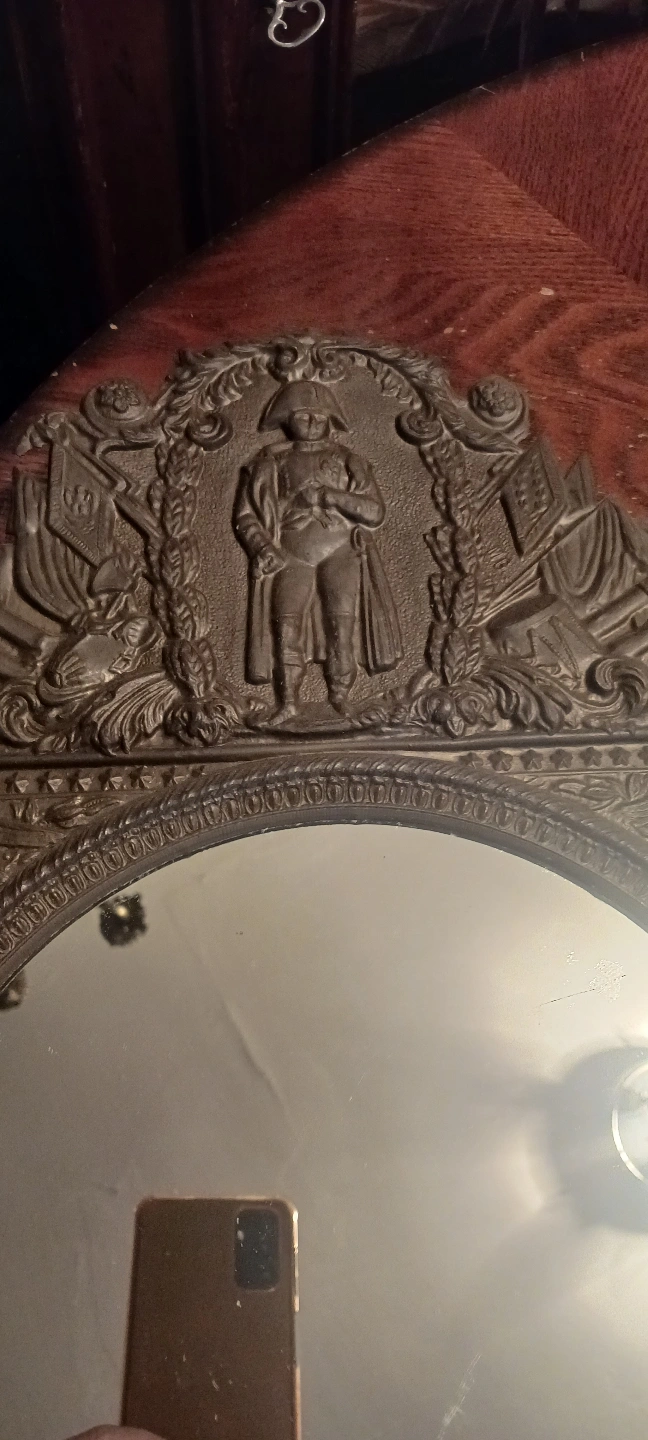 Ornate antique mirror. Features a relief of Napoleon. Intricate metal frame. Round mirror. Wall hanging. 17"×12". ALL MY PRICES ARE NEGOTIABLE !!!