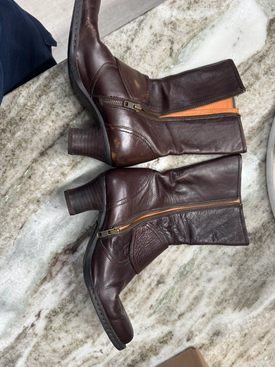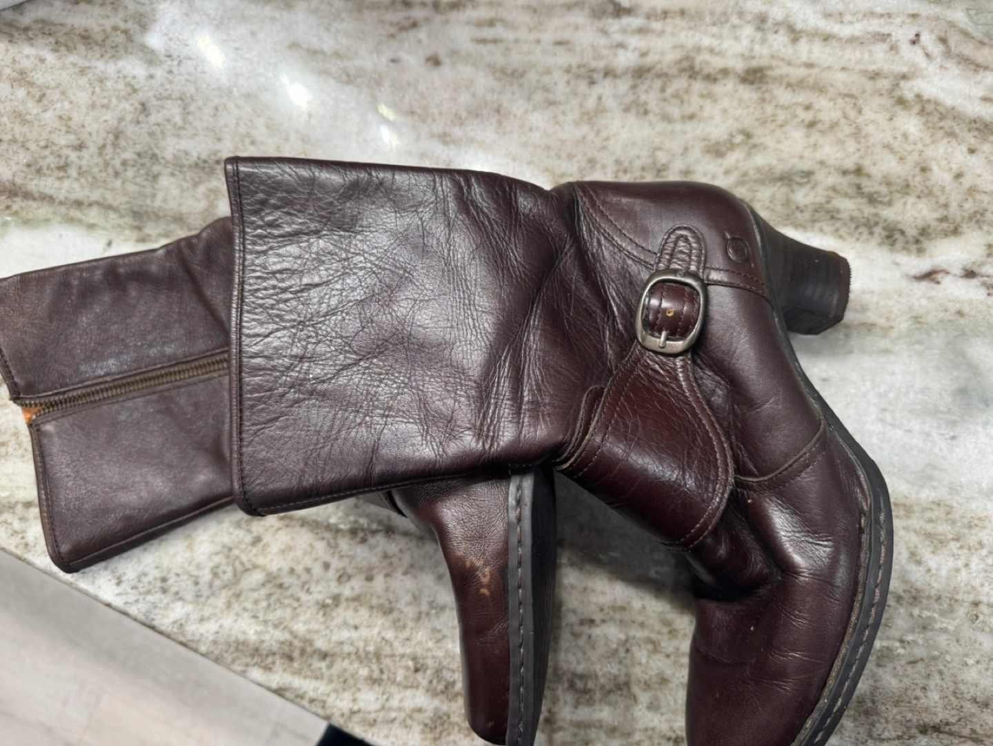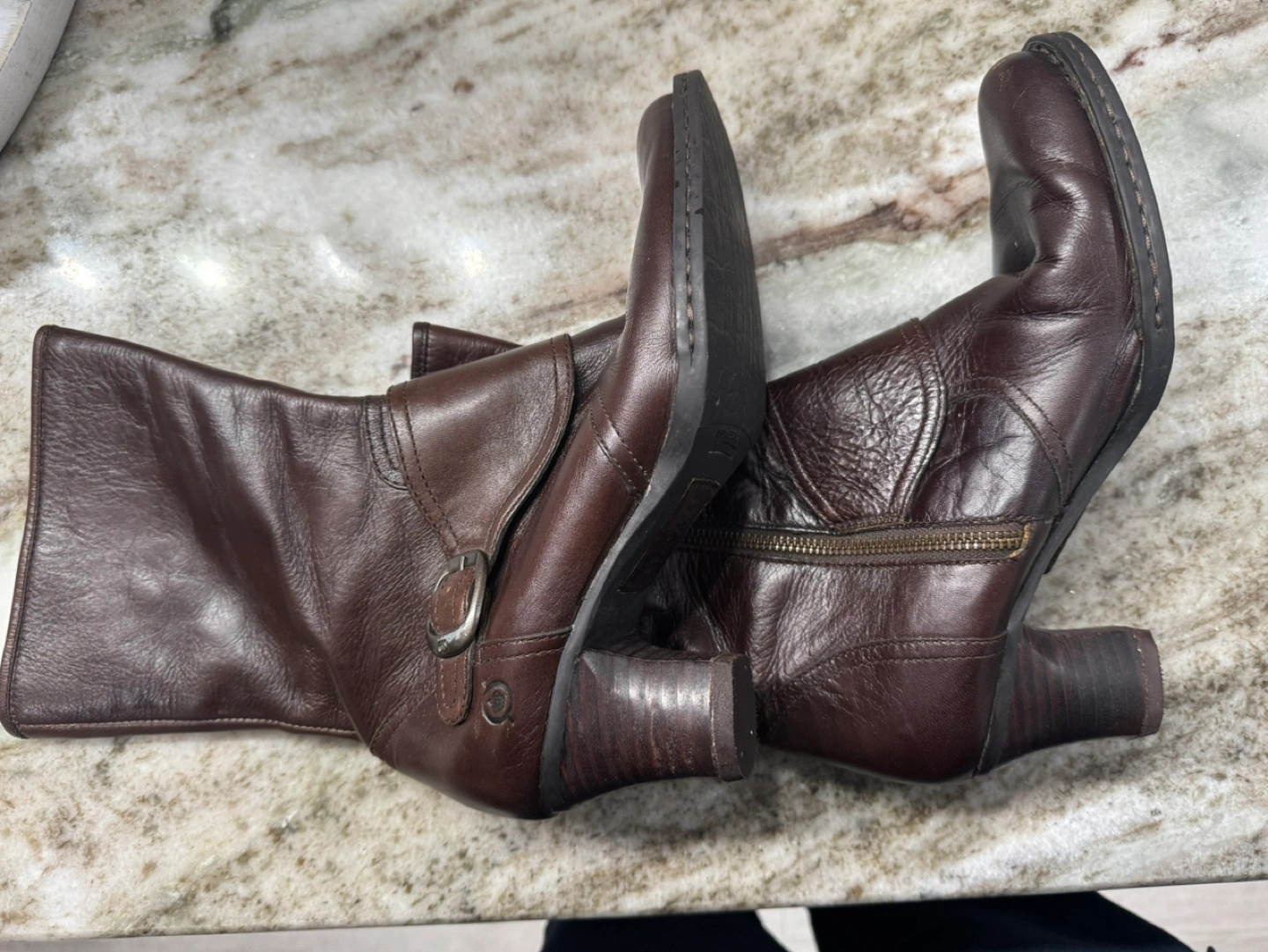 Women's brown leather boots. Side zipper. Block heel. Buckle detail. Hand-crafted.