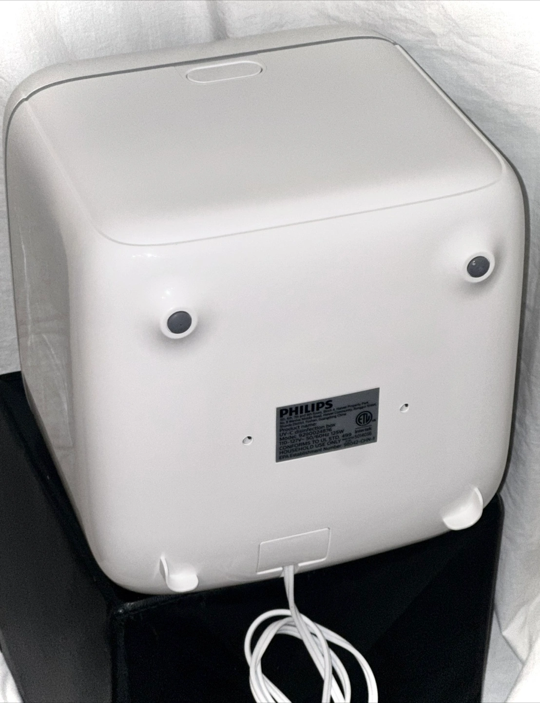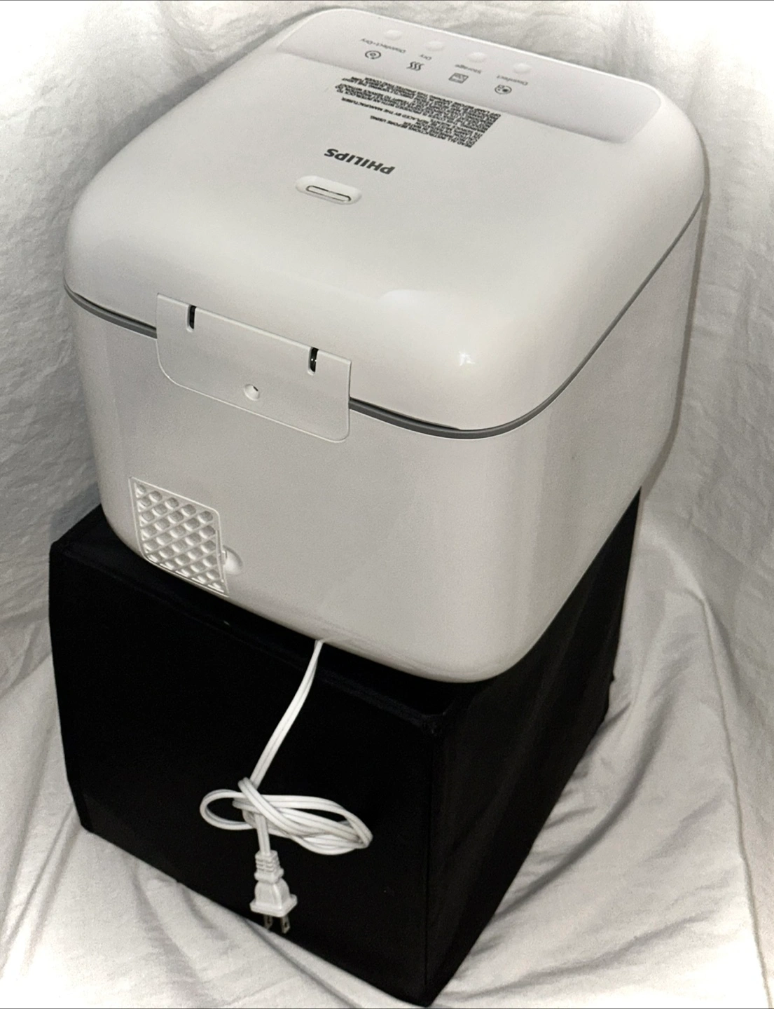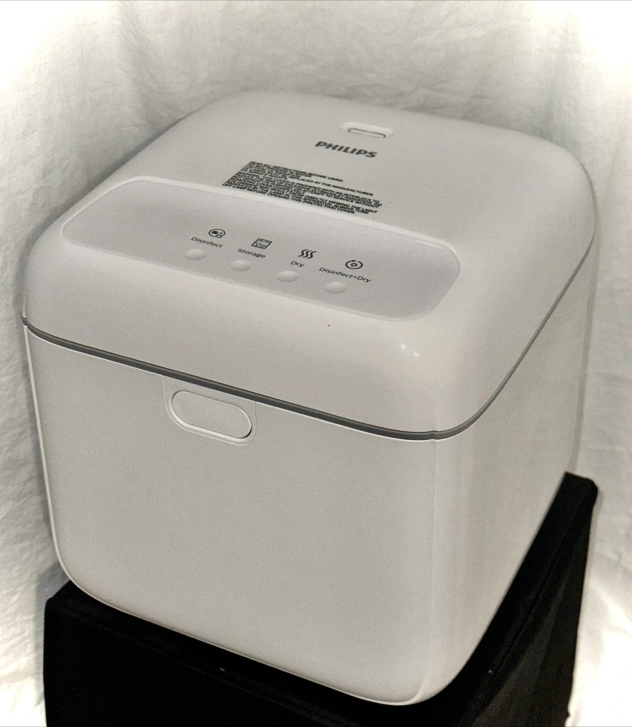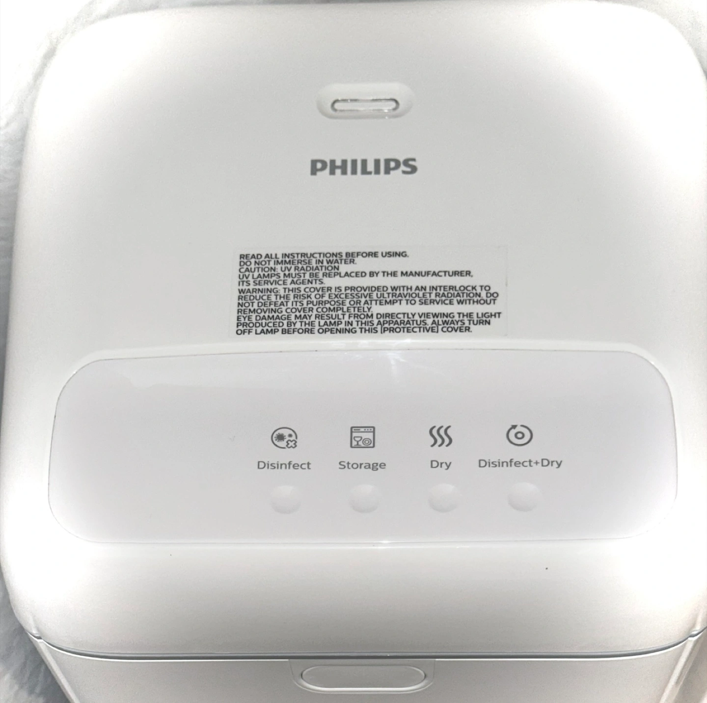 166White Philips UV-C disinfection box. Features disinfect, dry, and storage functions. Stainless steel interior. Includes power cord.