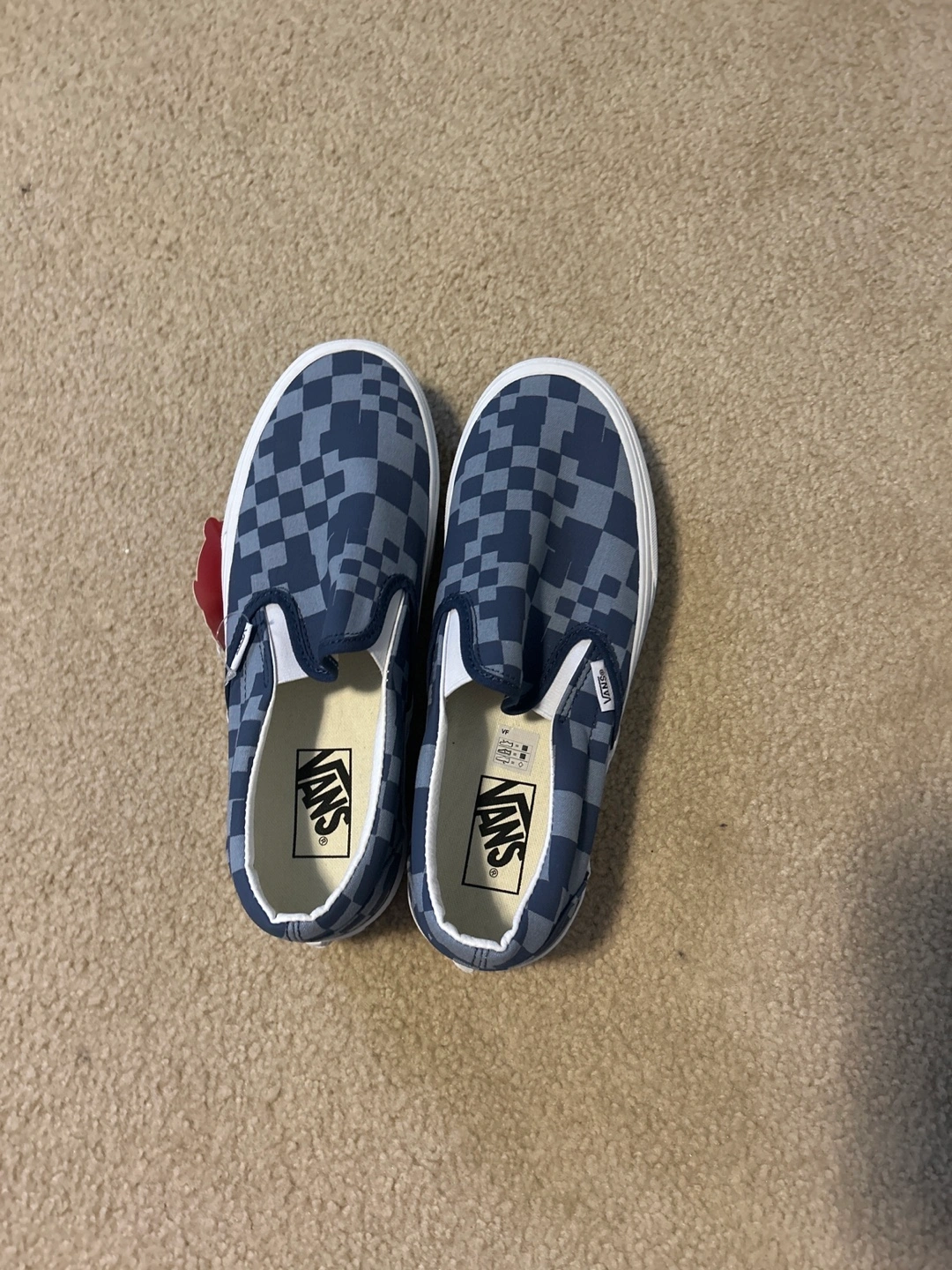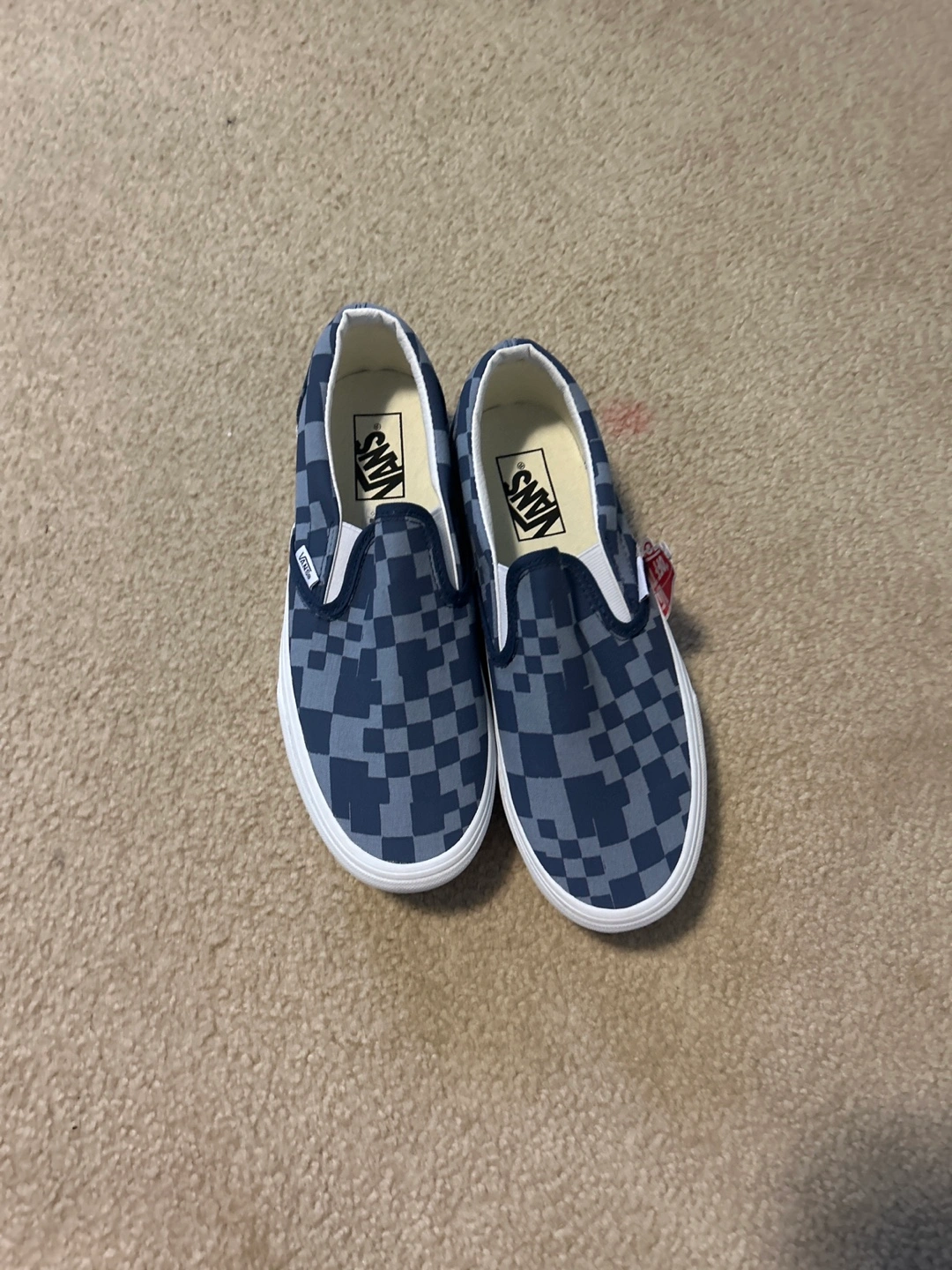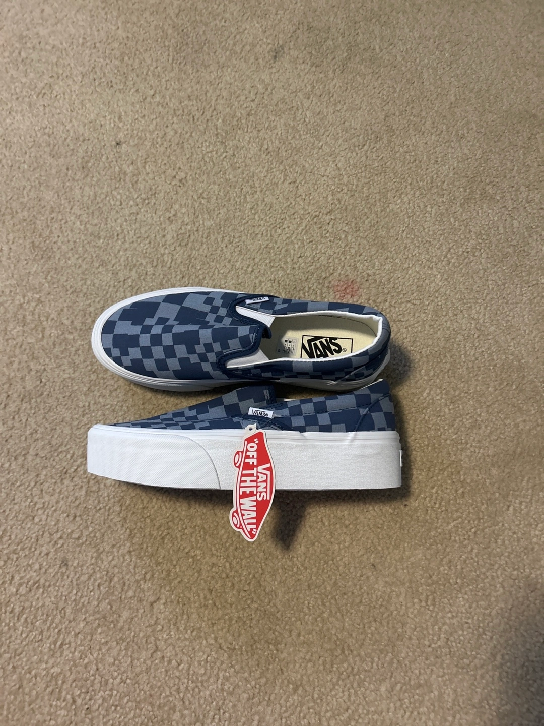 Women's / Men’s slip-on platform Vans sneakers. Checkerboard pattern. Navy blue and light gray. New with tag.