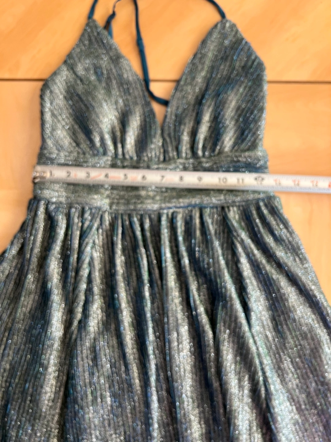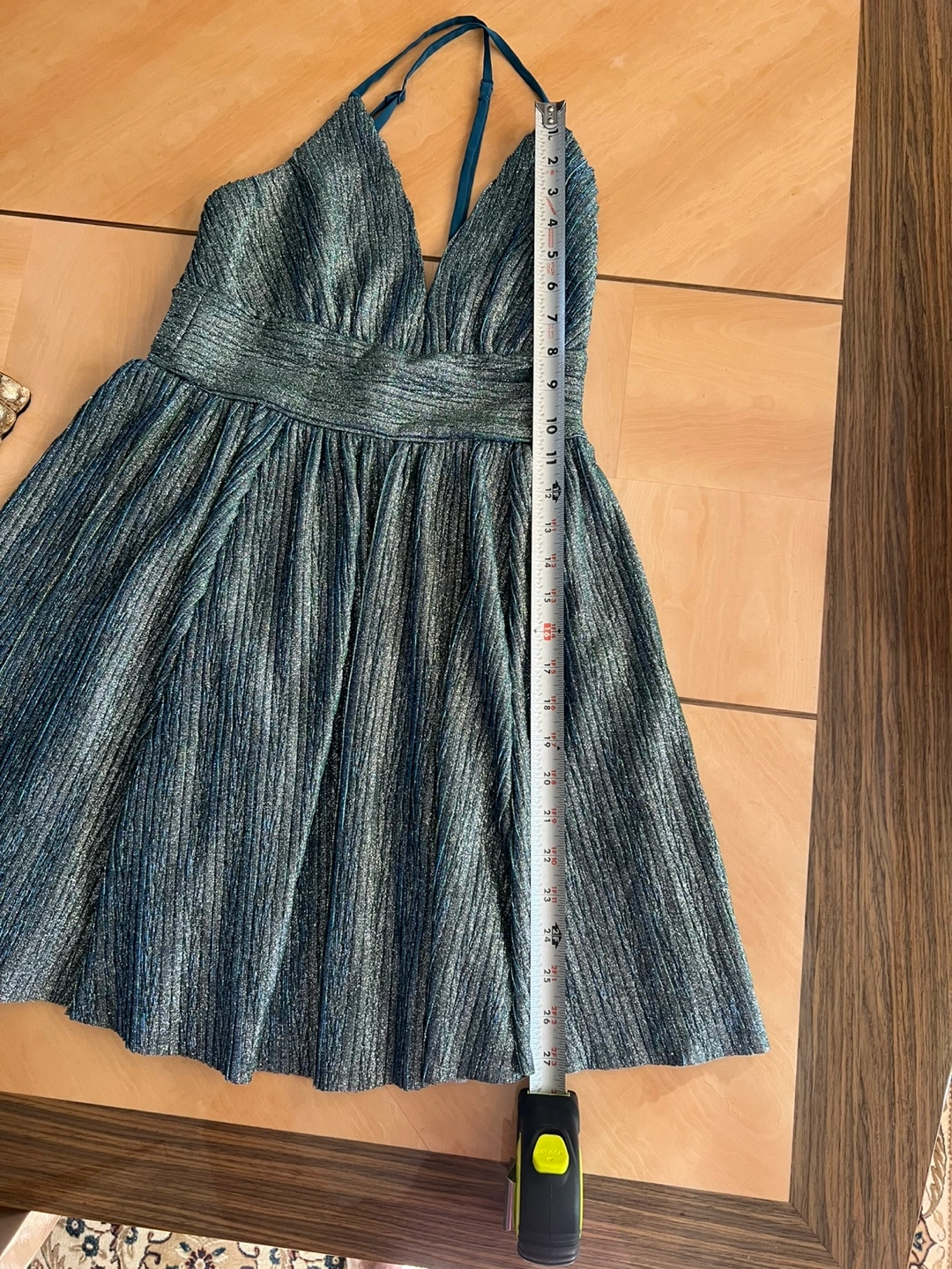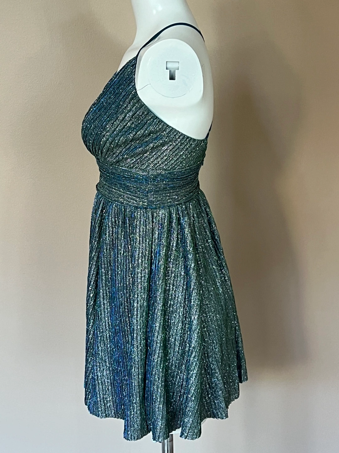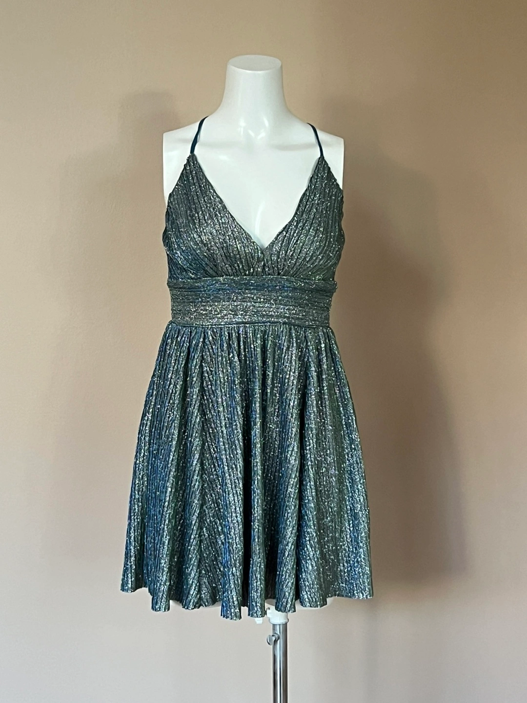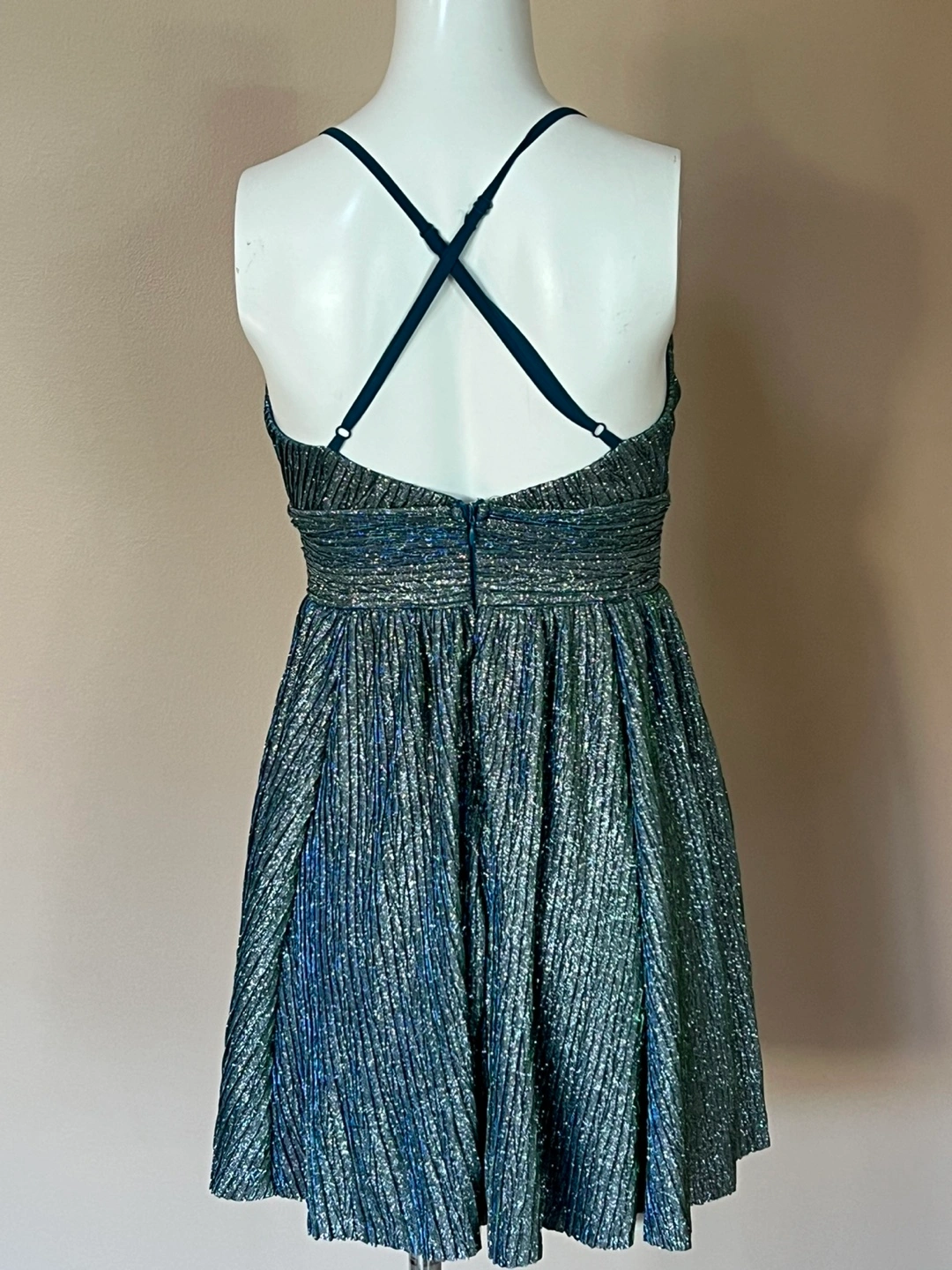 18Beautiful sparkly mini dress. Features a V-neck, adjustable criss-cross straps in the back, and a pleated skirt. Fully lined new dress, tad is missing. Perfect for parties or special occasions.