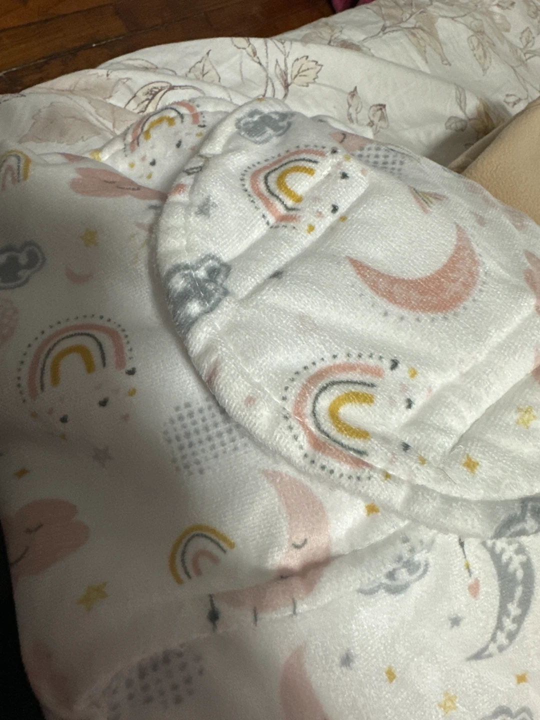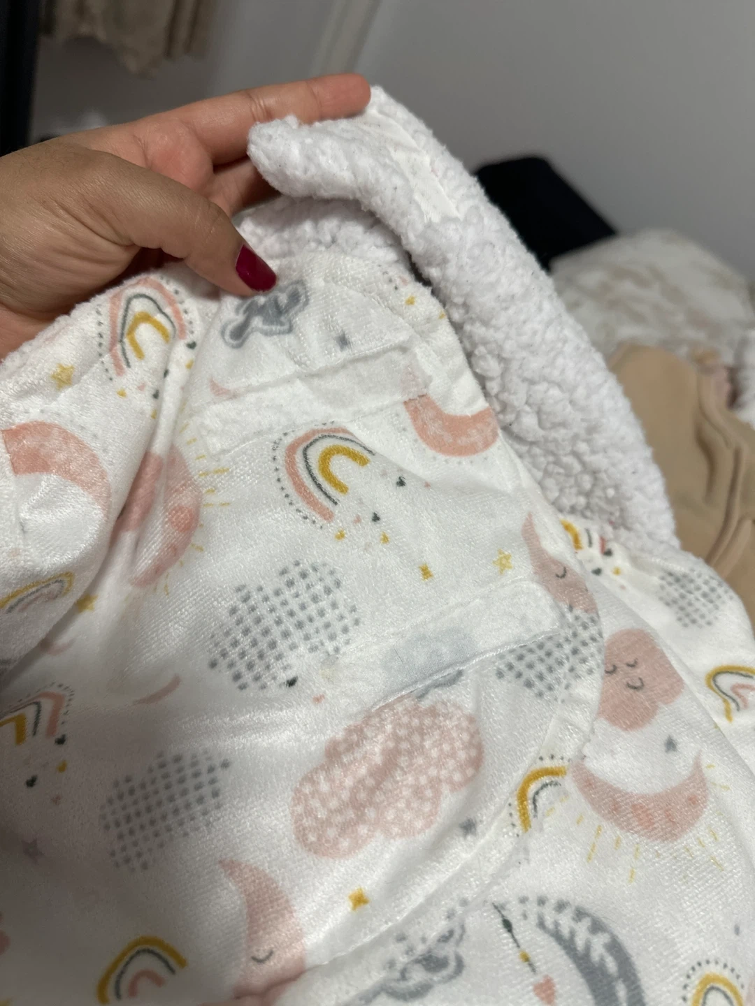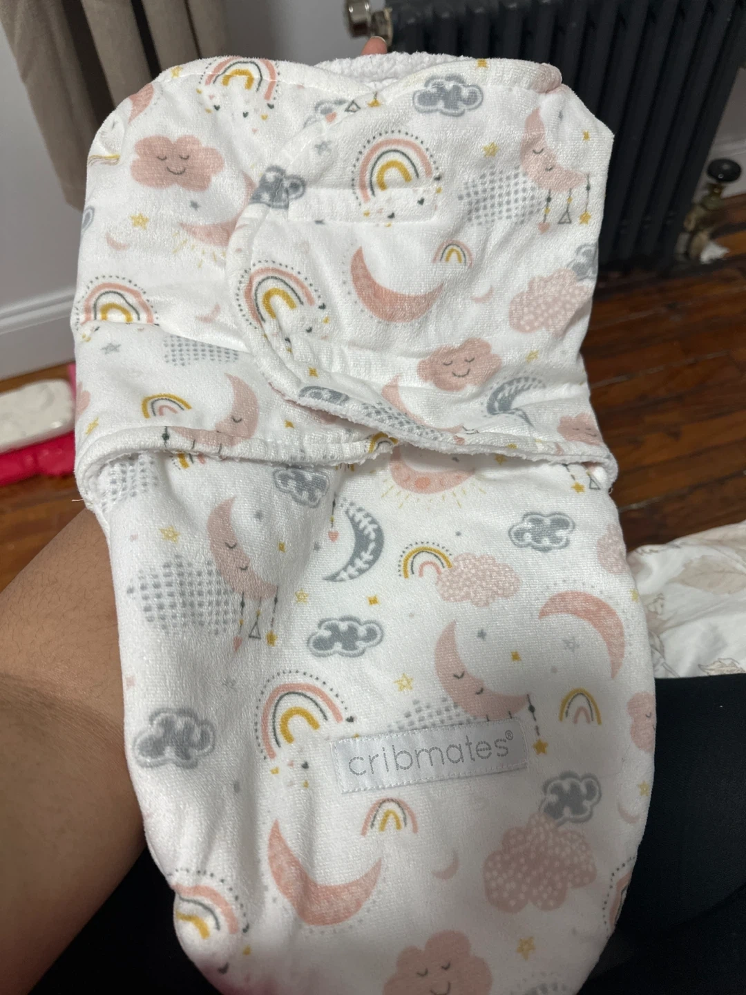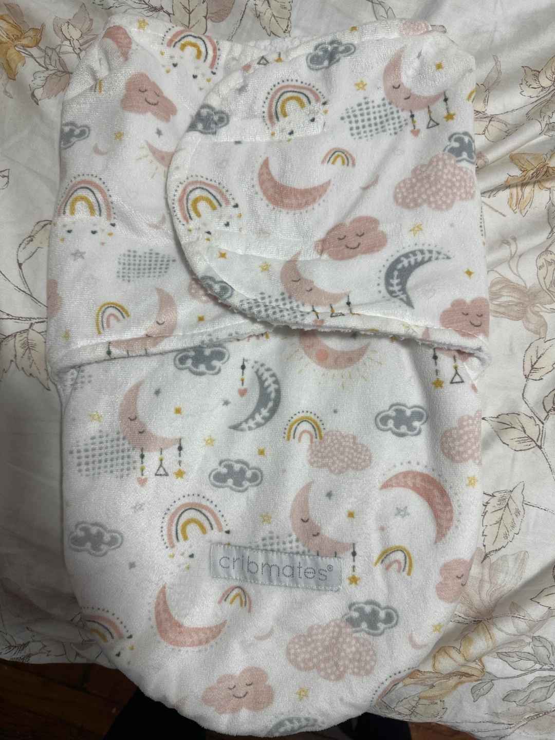 This Cribmates swaddle blanket features a cute moon and rainbow print. It's made from soft, plush material for baby's comfort. Adjustable hook and loop closure for a snug fit. Perfect for babies who love to be swaddled!