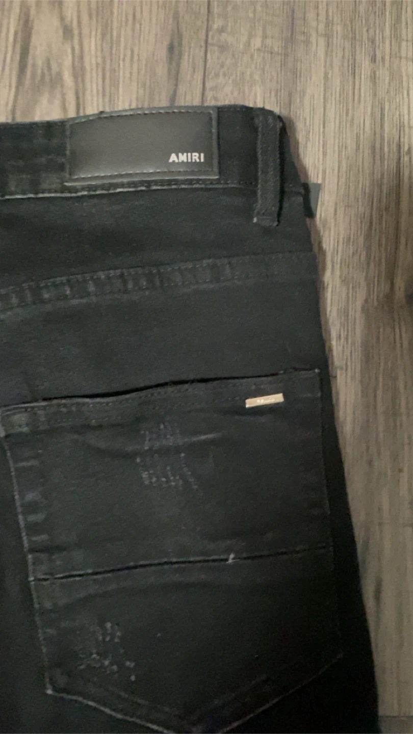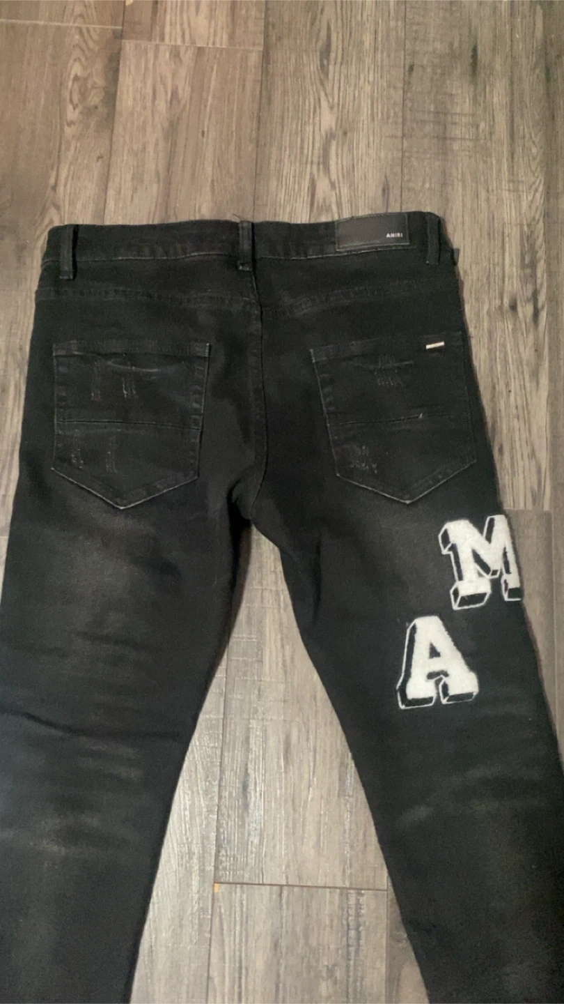 AMIRI black distressed denim jeans. Features white letter applique spelling out 'AMIRI' on the legs. Made from durable denim material. These pants offer a unique, edgy style.