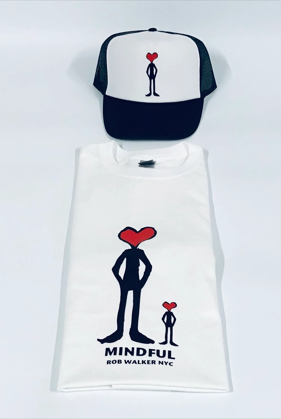 White t-shirt and black and white trucker hat set . Features a graphic of a figure with a heart for a head. Rob Walker NYC ( Mr. Mindful branding. )New.