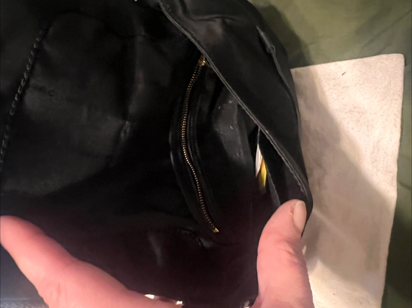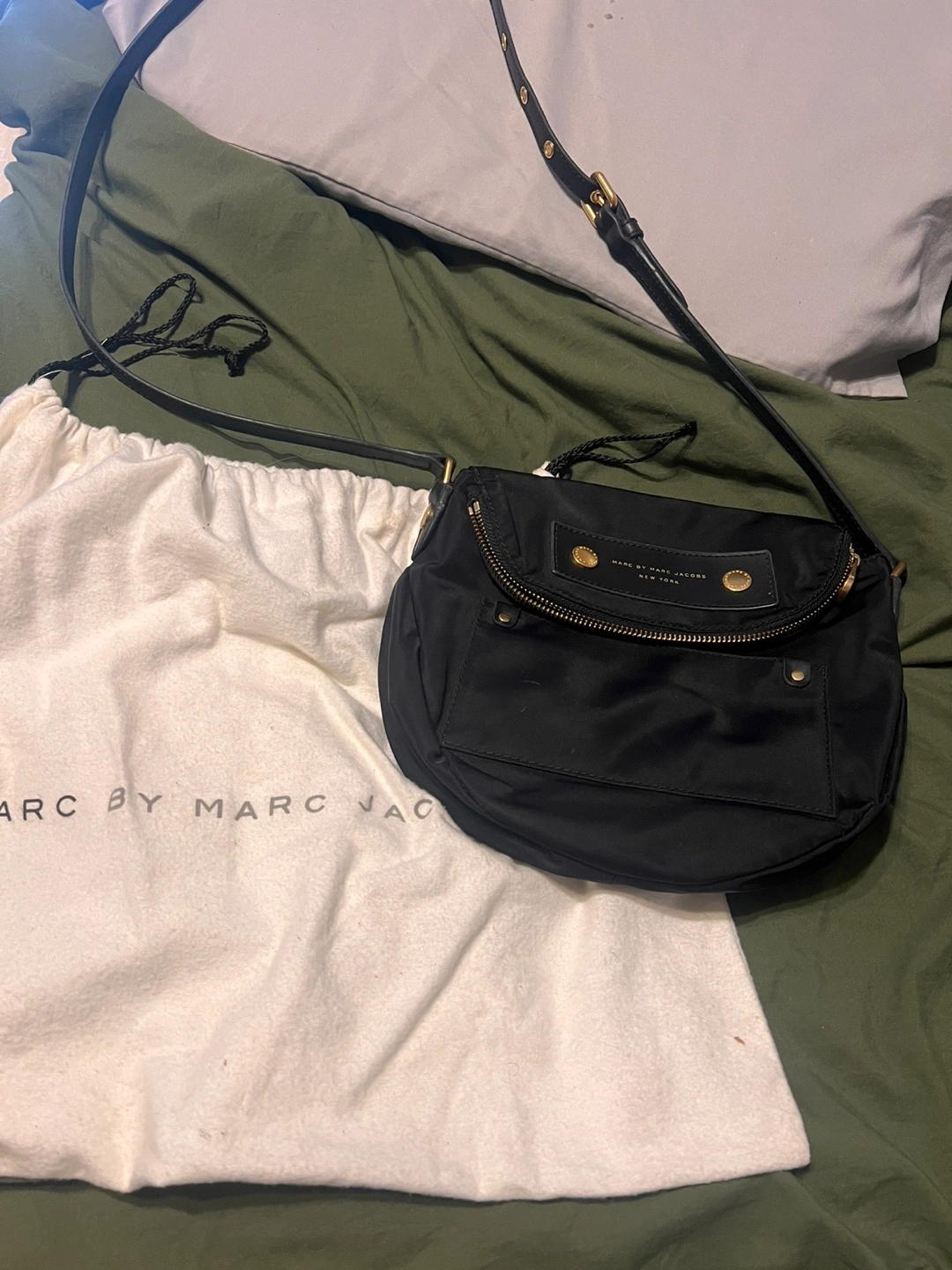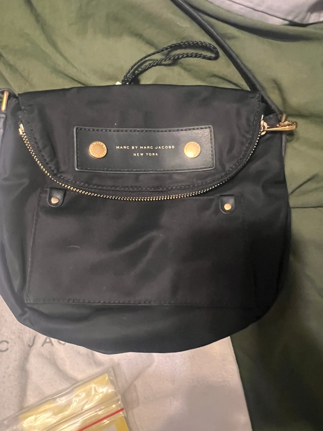 Black nylon crossbody bag. Features gold hardware and a flap closure. Includes dust bag and care card. Small zippered pocket inside. Never used.