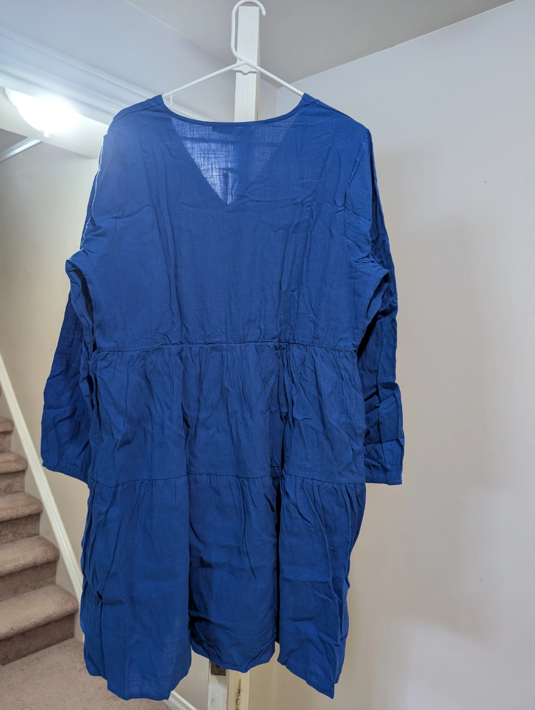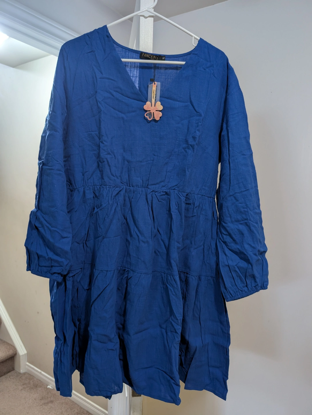 Brand new with tags, never worn. Blue mini dress. Tiered design. Long sleeves. V-neck. Size XL.