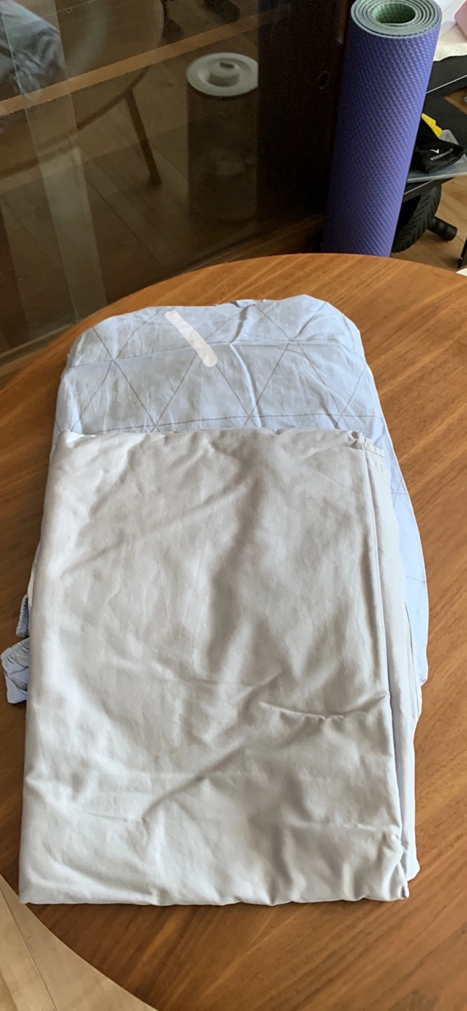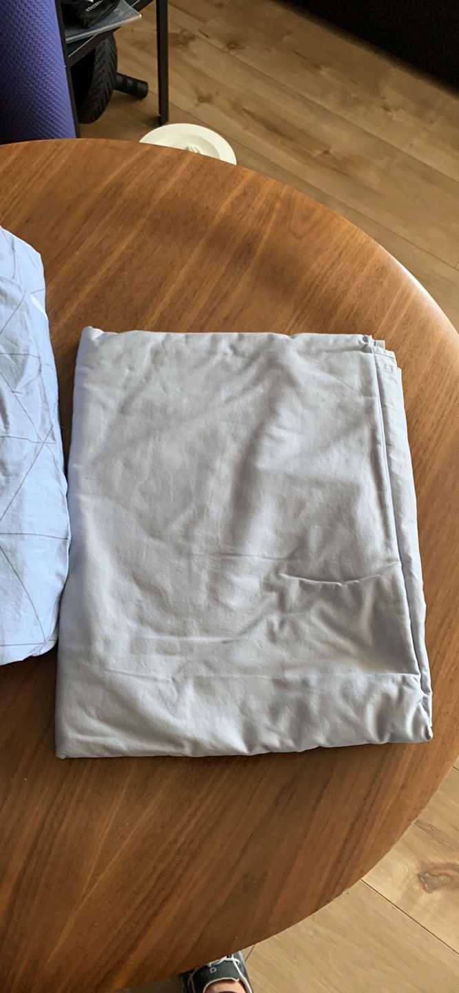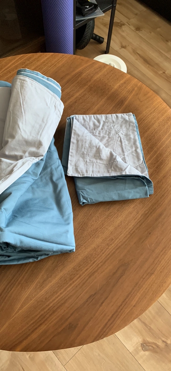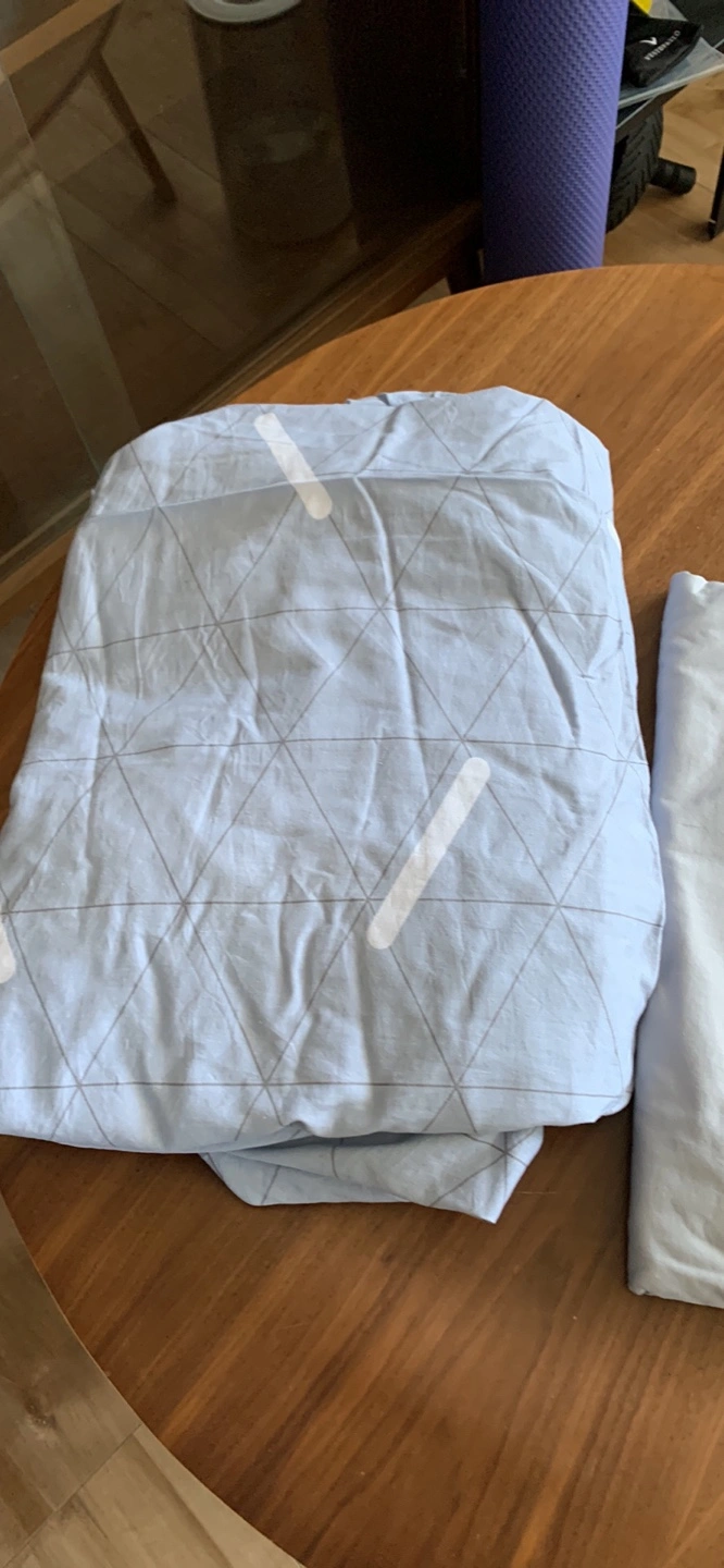Queen size bedding set. Includes flat sheet, fitted sheet, and one pillowcase. Light blue and teal colours. Geometric pattern on one side of flat sheet. Soft cotton.