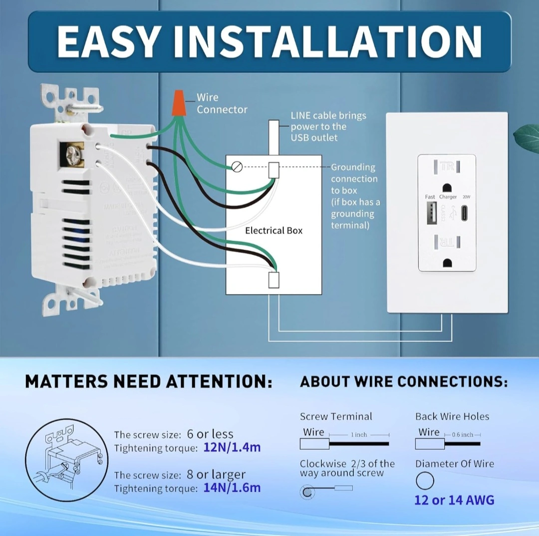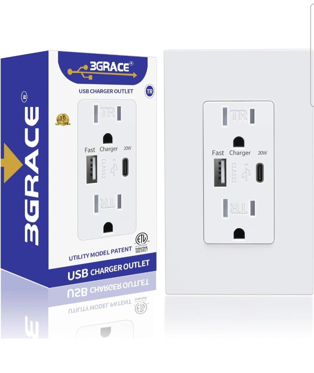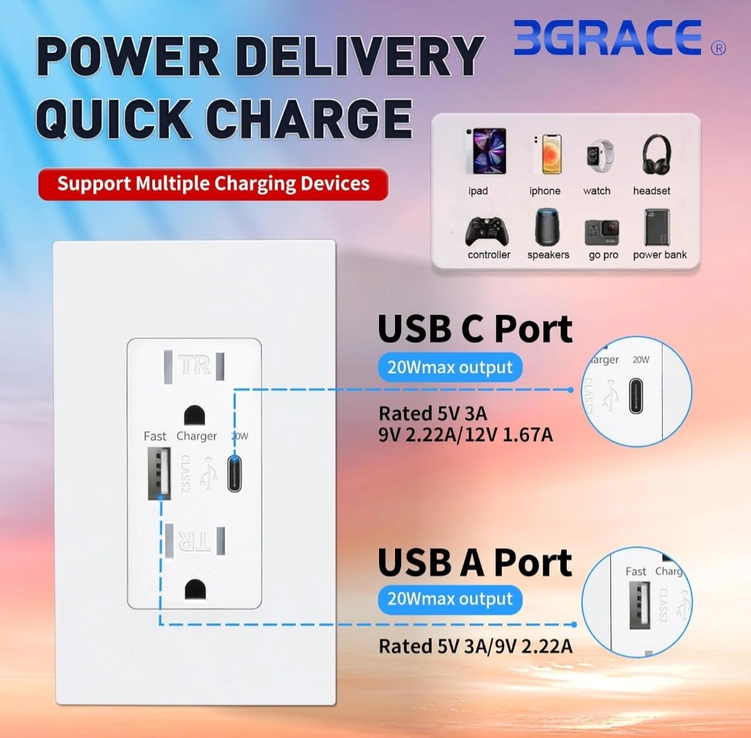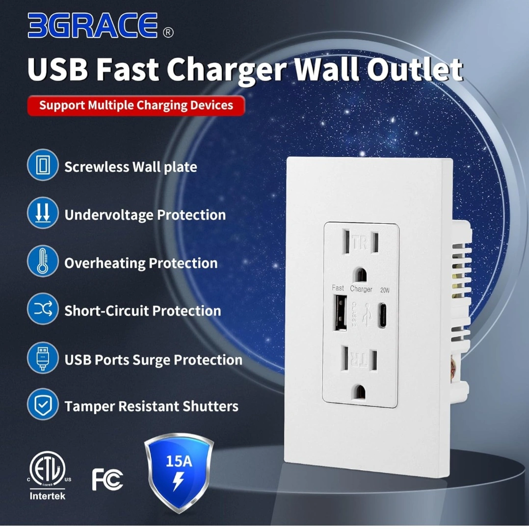 188Screwless wall plate. Under voltage, overheating, and short circuit protection proff USB ports surge protection. 15A. Easy installation. Dual USB ports and standard outlets. 20W max output.