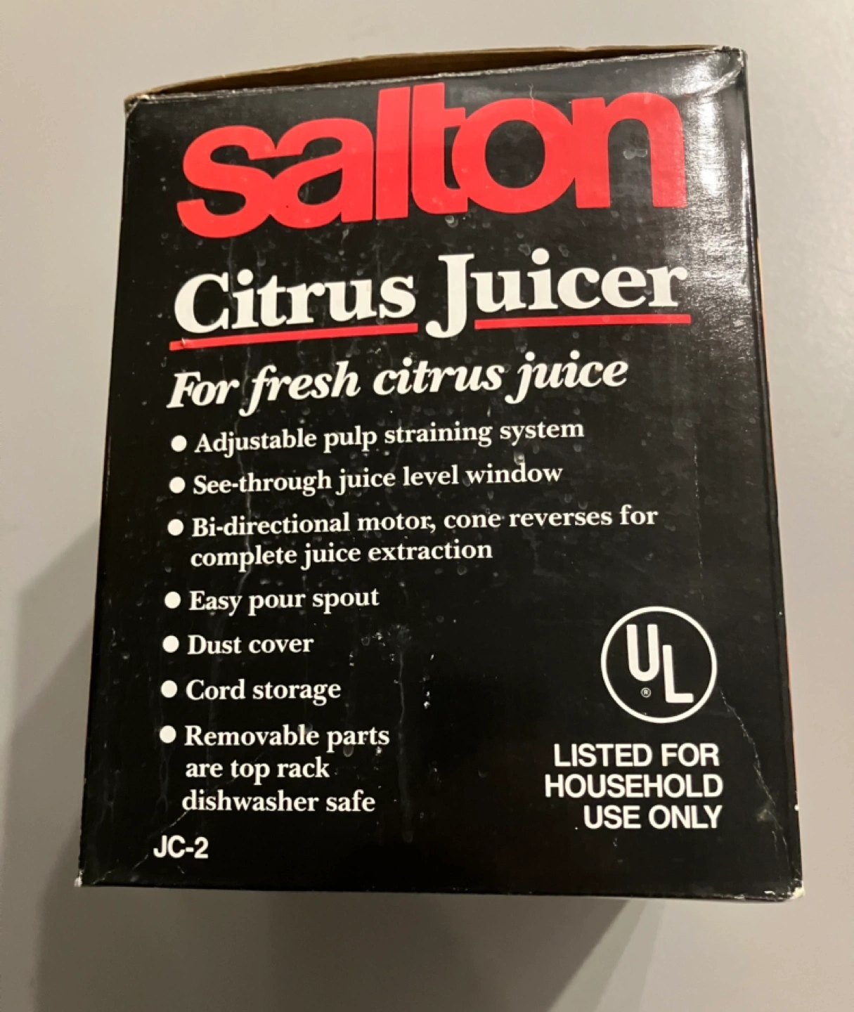 Vintage Salton Citrus Juicer, model JC-2. New in box. Features adjustable pulp straining system, see-through juice level window, bi-directional motor, easy pour spout, dust cover, and removable dishwasher-safe parts.