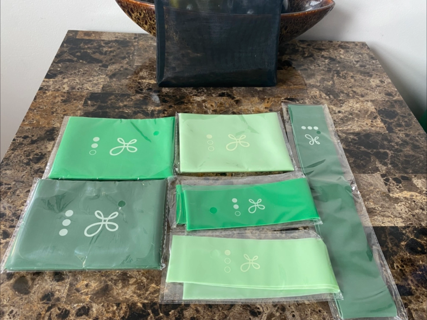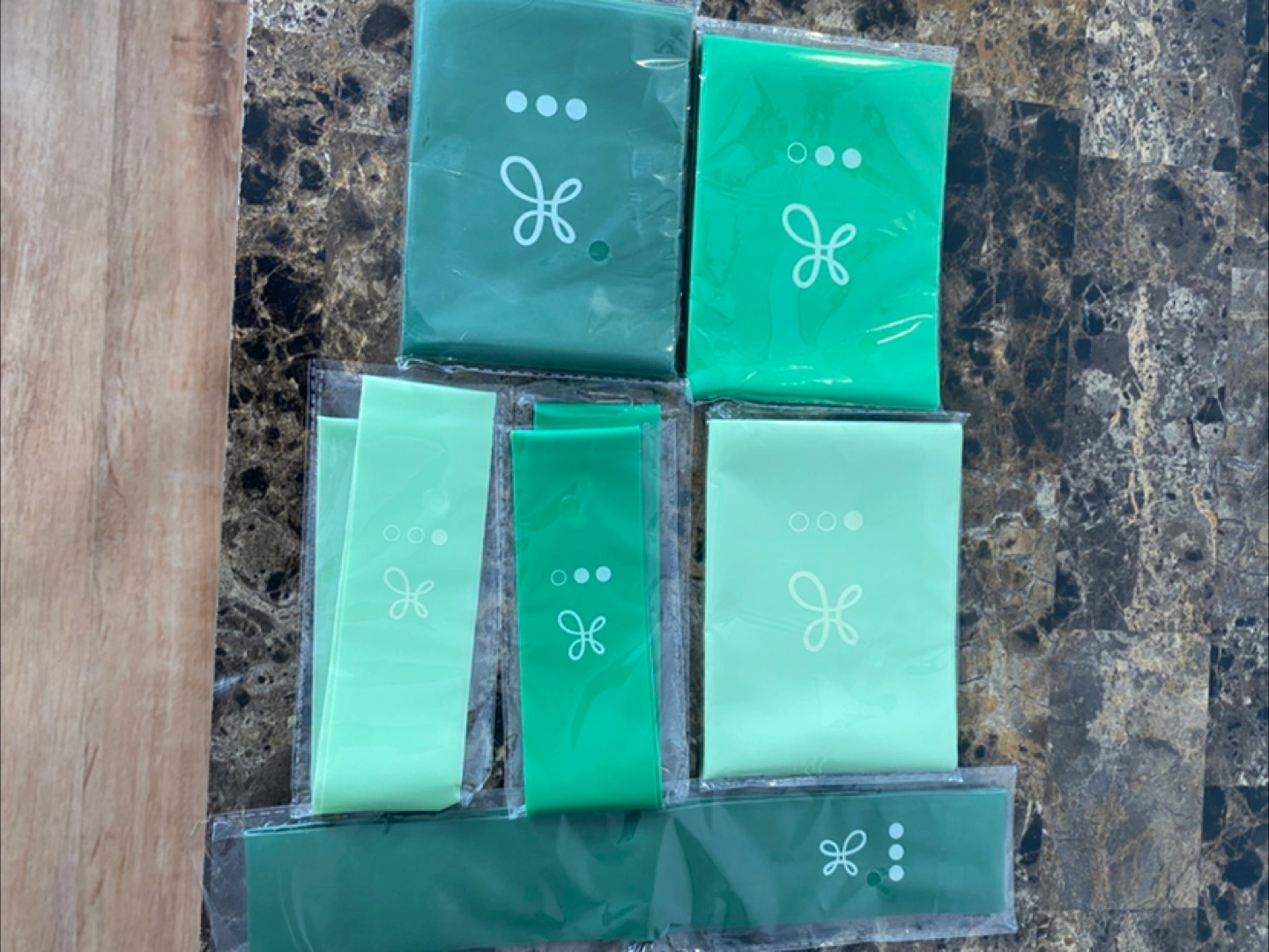 123Set of seven resistance bands. Various shades of green. Great for workouts. Includes carrying bag.