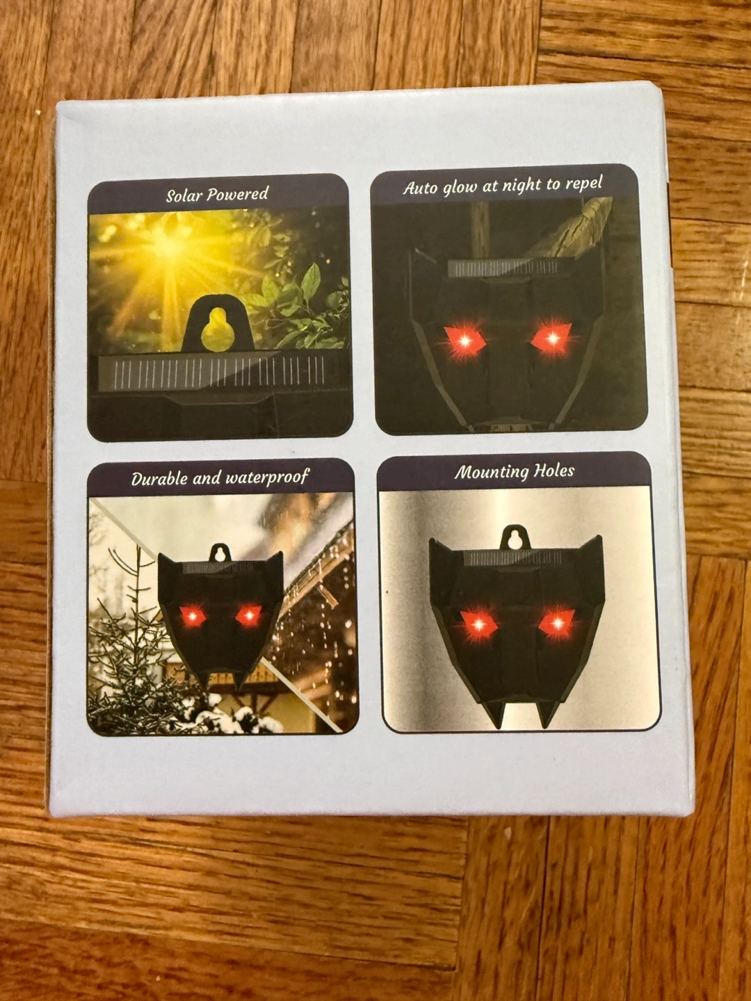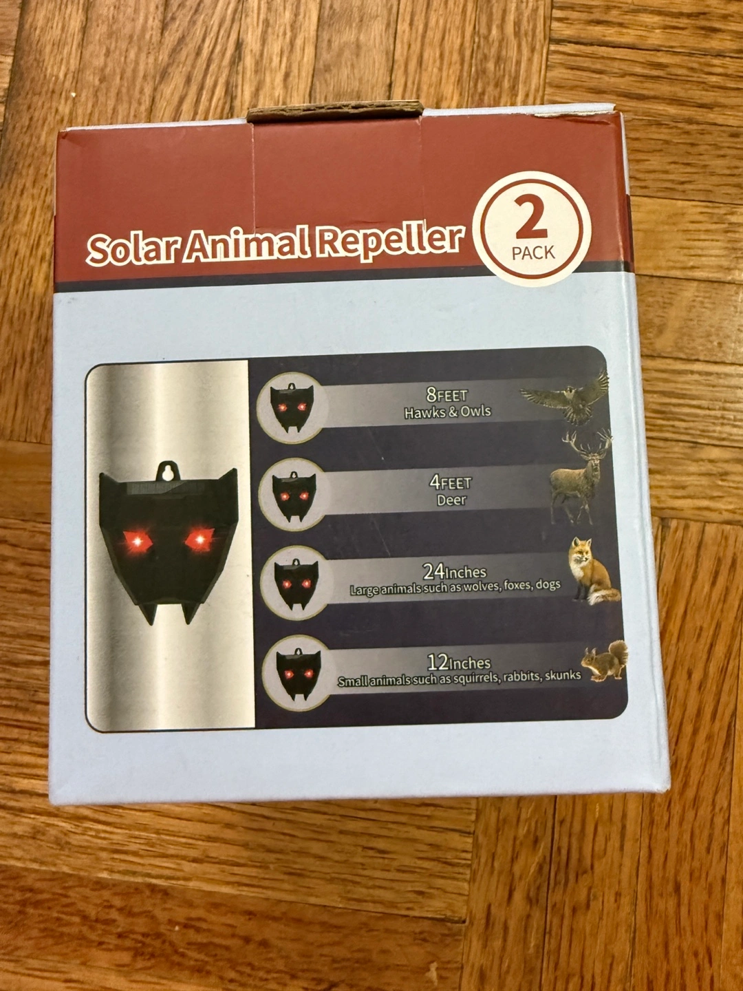 Solar powered animal repeller. Auto glow at night. Durable and waterproof. Mounting holes. Repels hawks, owls, deer, wolves, foxes, dogs, squirrels, rabbits, and skunks.(brand new in box)