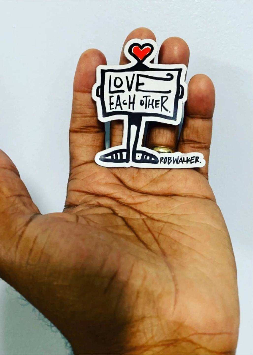 19Small sticker features a figure holding a sign that says "Love Each Other." Black and white design with a red heart. Perfect for laptops, water bottles, or anywhere you want to spread some love.