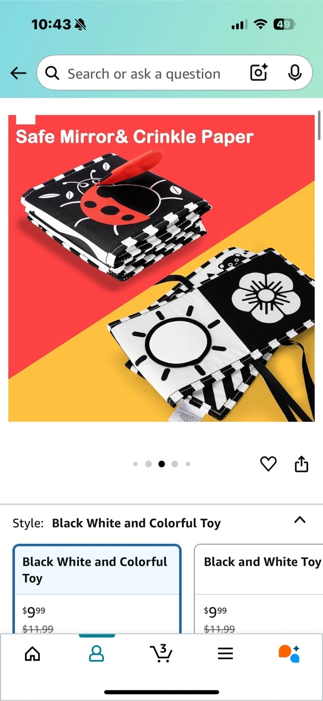 New baby book toy. Features crinkle paper and safe mirror. Black and white and color designs. Great for baby's development. No exchange and return