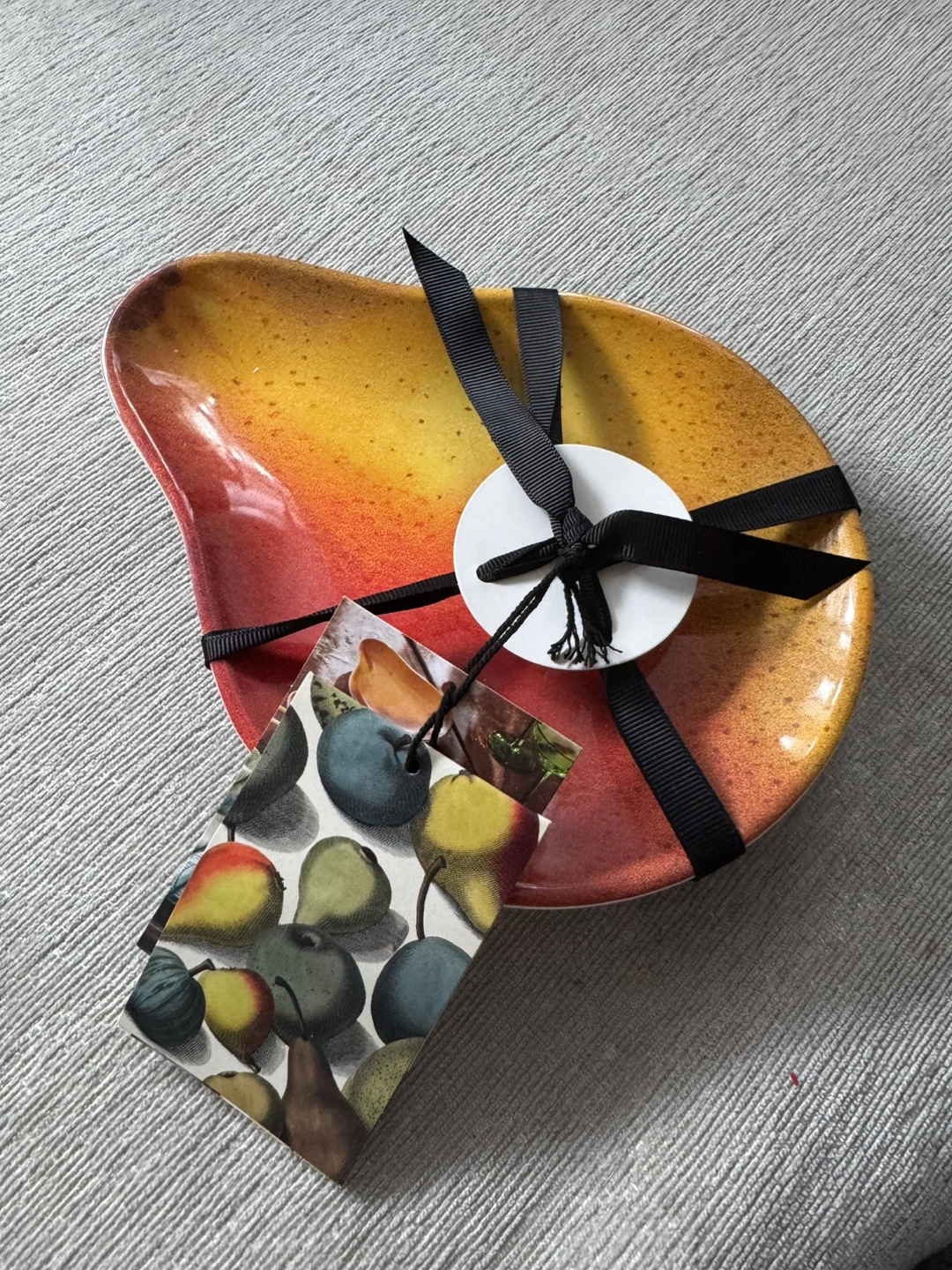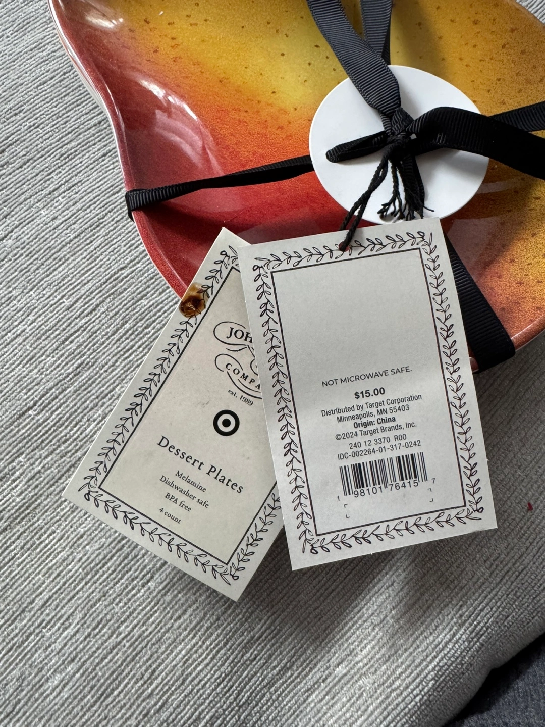 352Small melamine dessert plate. Pear shape. Orange and yellow ombre design. Dishwasher safe. Not microwave safe. Brand new with tags.