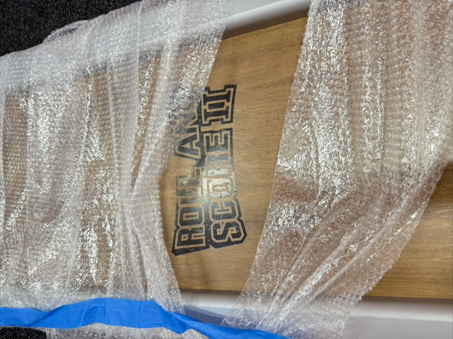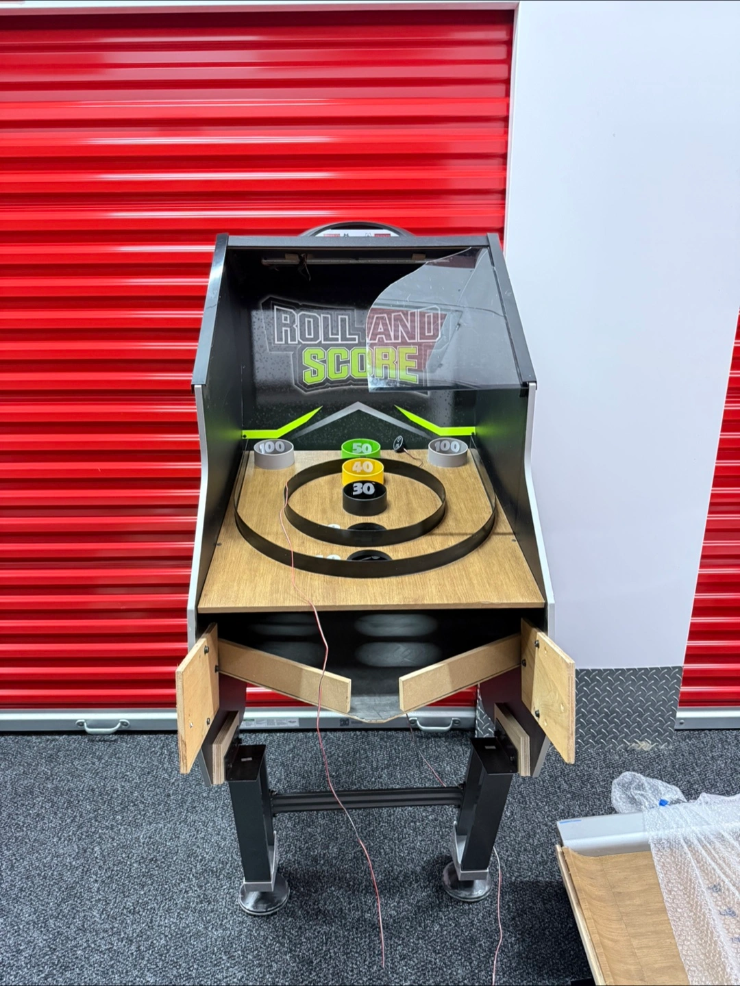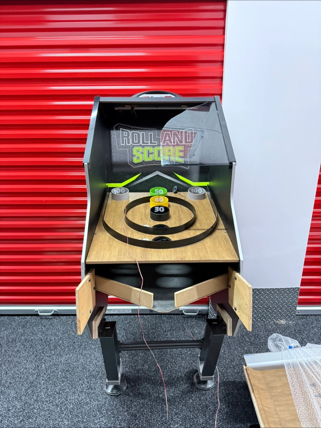 165Roll And Score arcade game. Great condition. Wooden play surface. Black metal frame. Includes scoring rings. Easy setup. Fun for all ages.