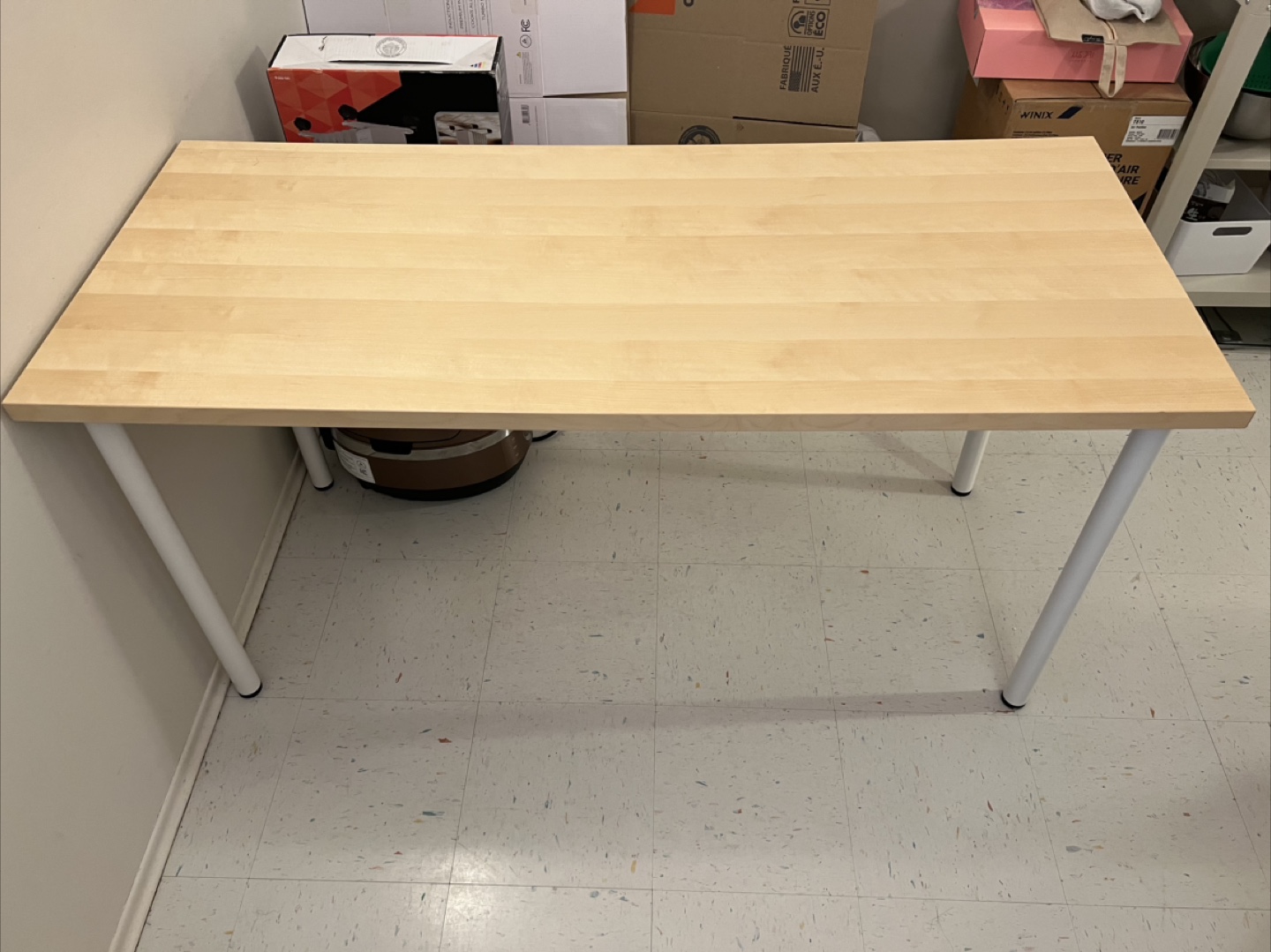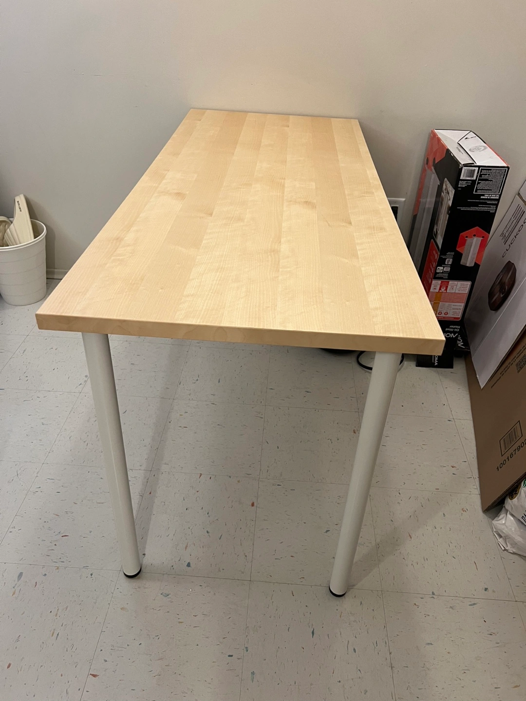 Light wood tabletop on white legs. Great for a home office or small workspace. Minimalist design.