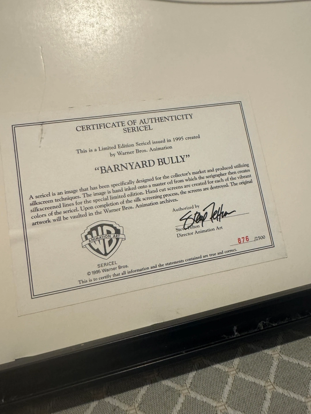 311995 Sericel from Warner Bros. Animation. Limited edition silkscreen print. Numbered 876/2500. Features artwork from Barnyard Bully. Includes certificate of authenticity.