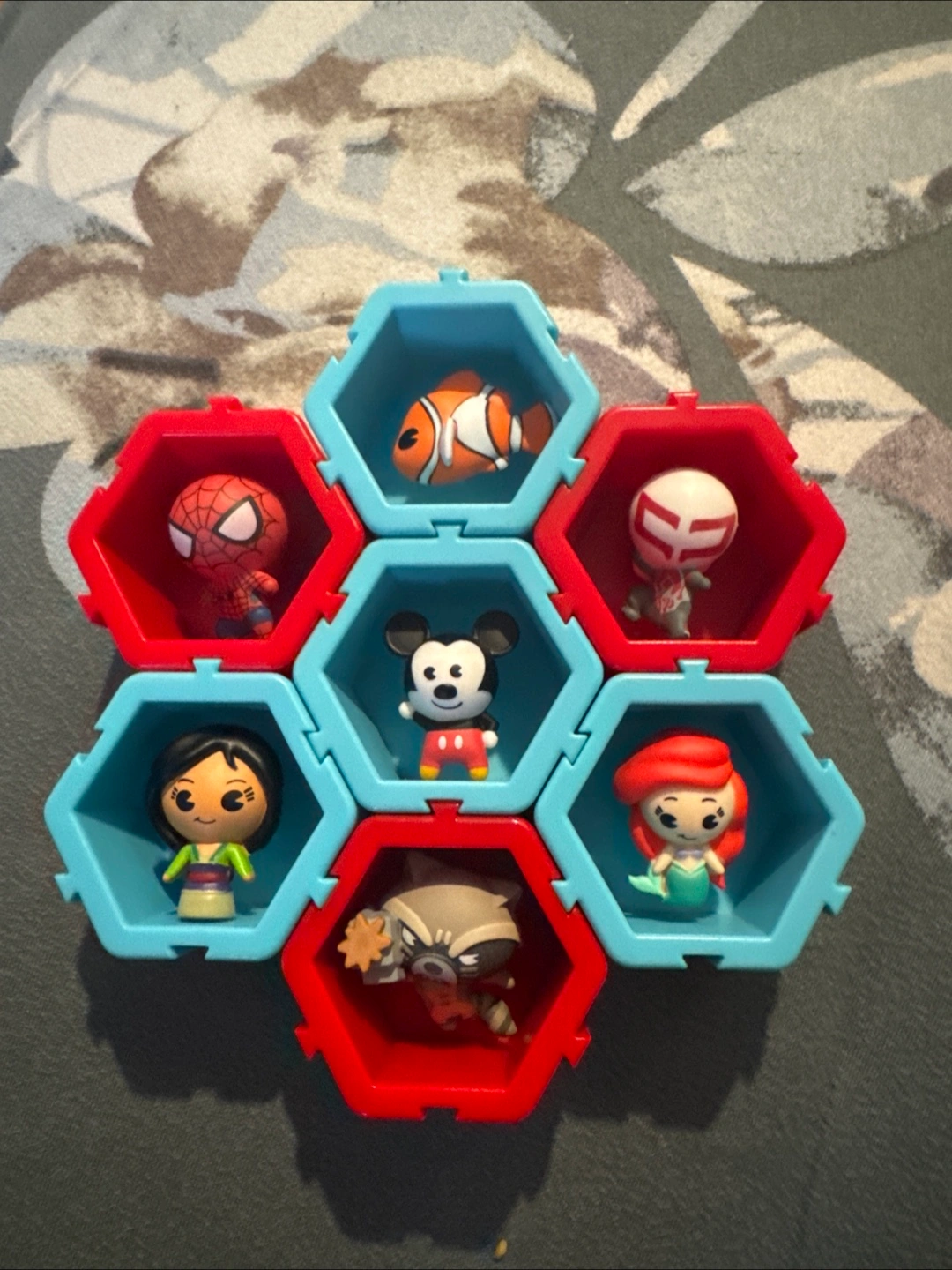 751Seven collectible figures in hexagon-shaped display cases. Features characters from Disney and Marvel. Great for collectors or Disney fans.