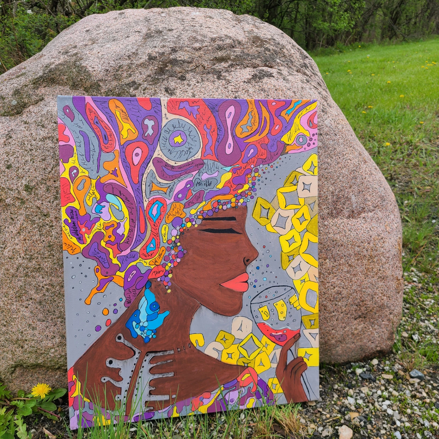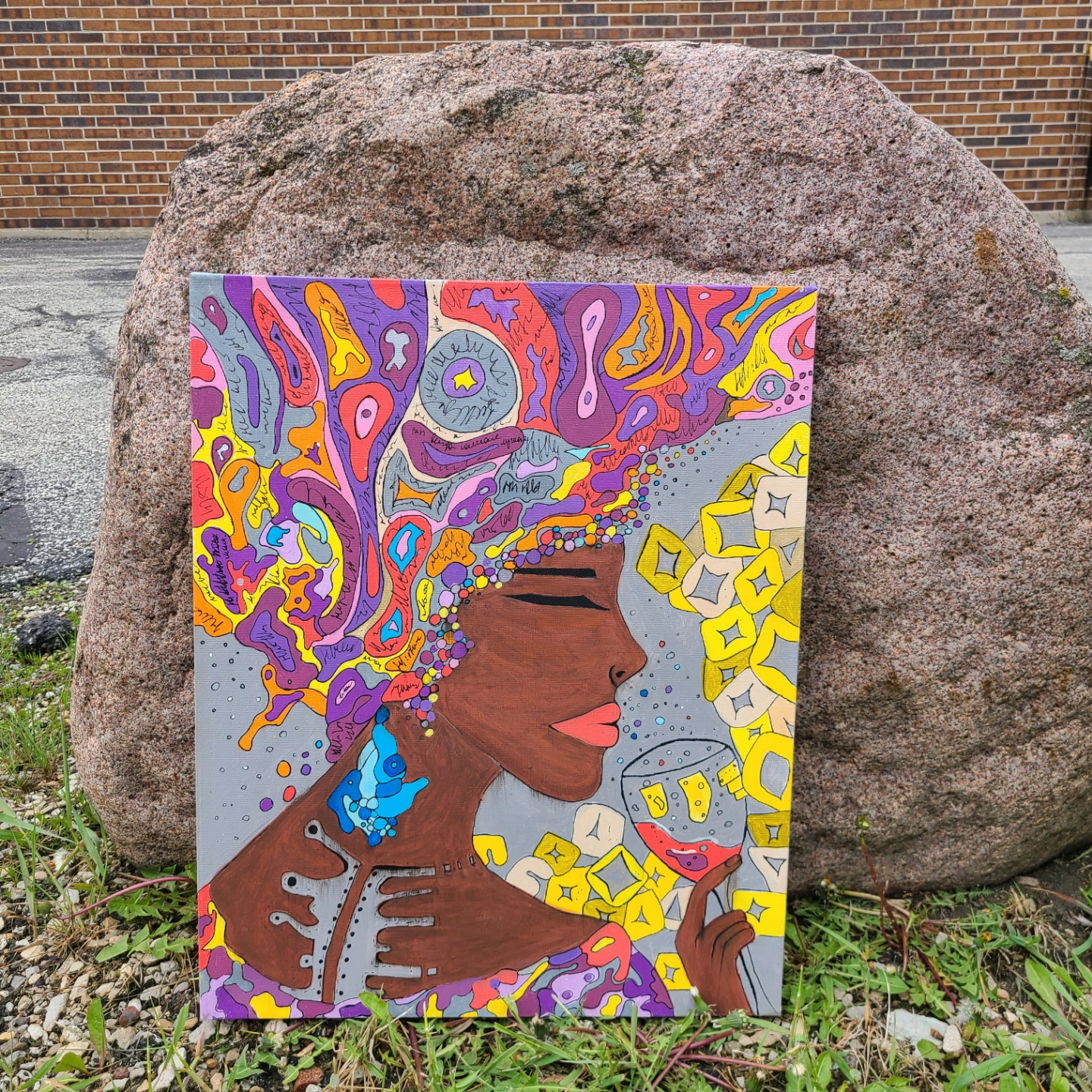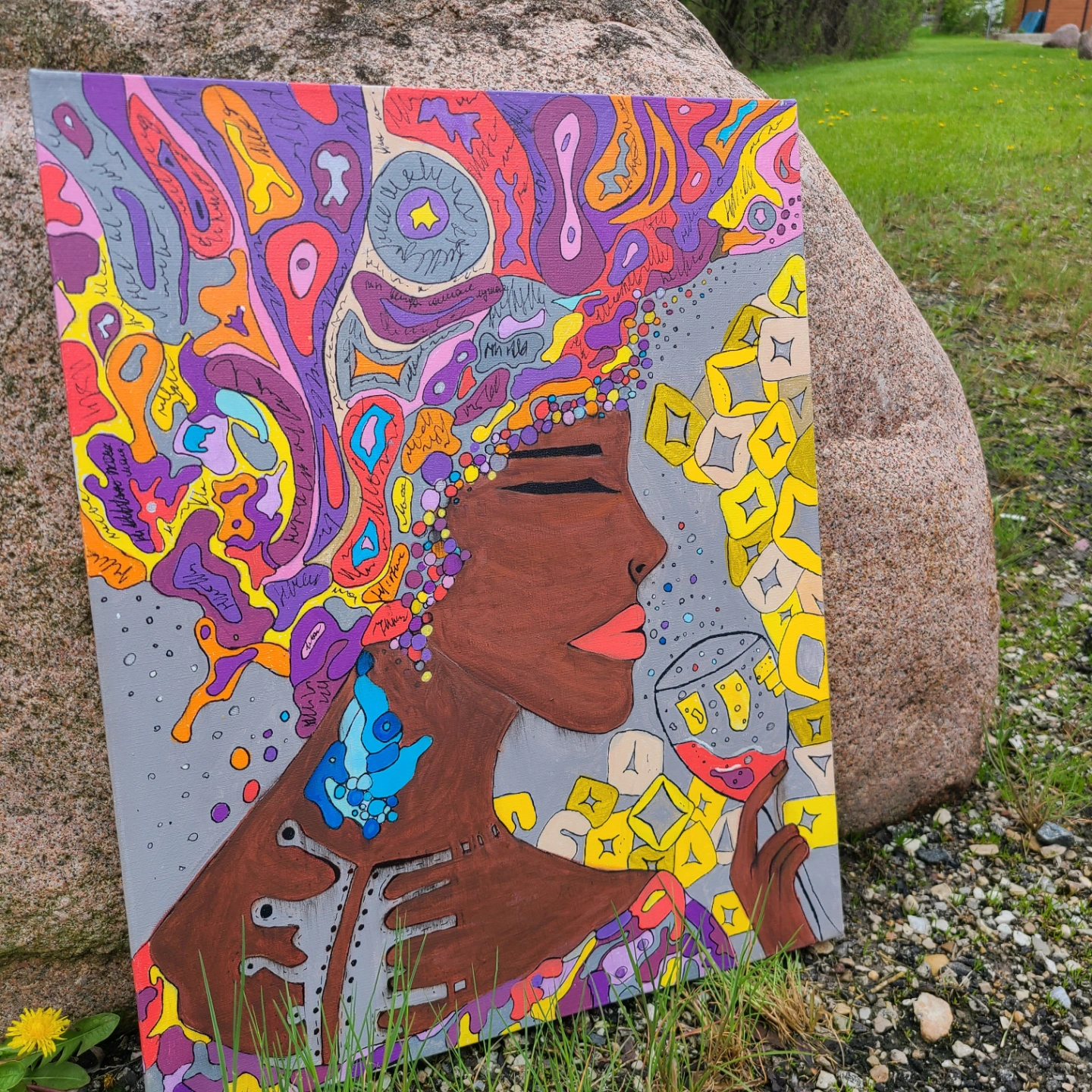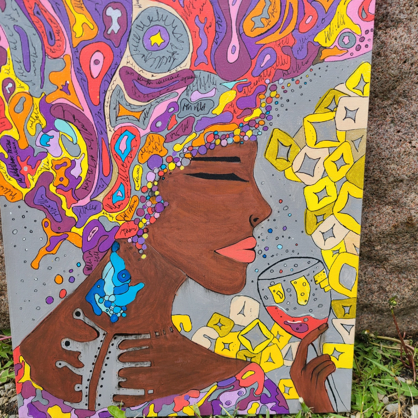 18Vibrant and colorful acrylic painting on canvas. Features a woman enjoying a glass of wine. Unique style, bold colors. Great addition to any art collection.