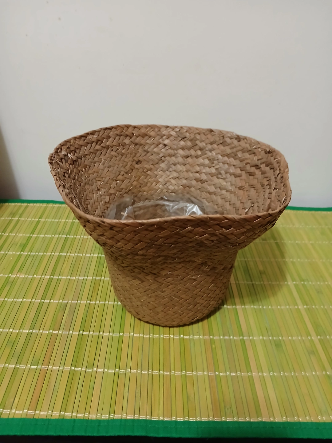 586Small woven straw hat or bowl. Perfect for decor or small plant. Lightweight and versatile.