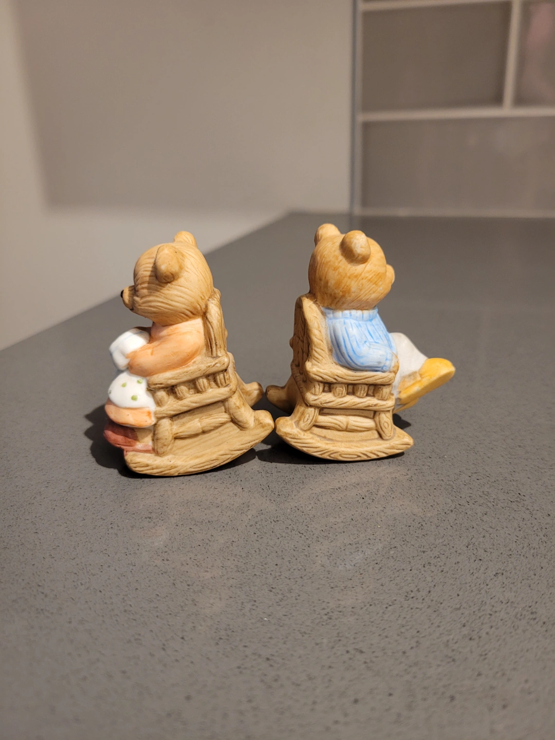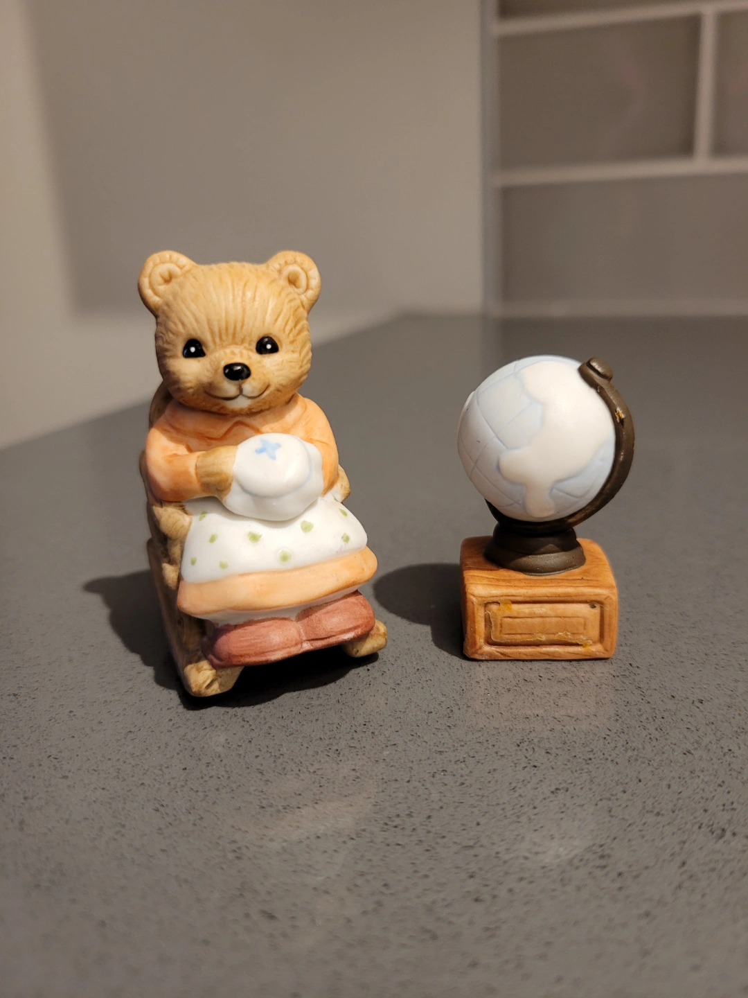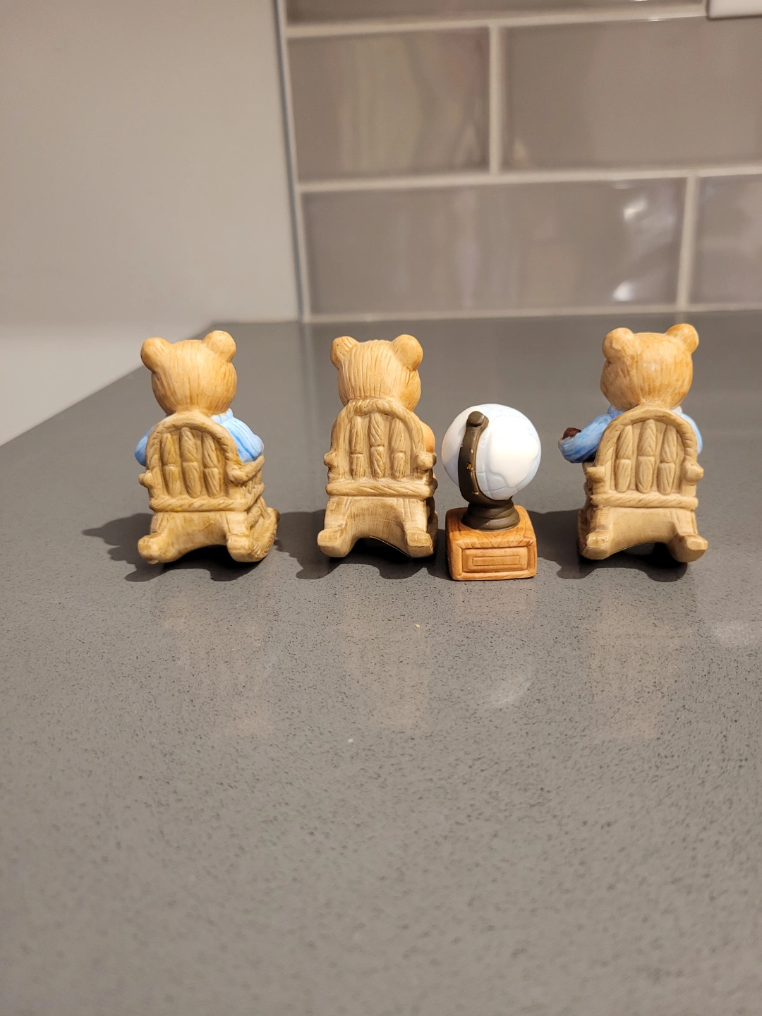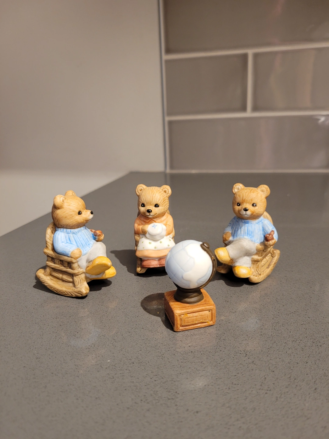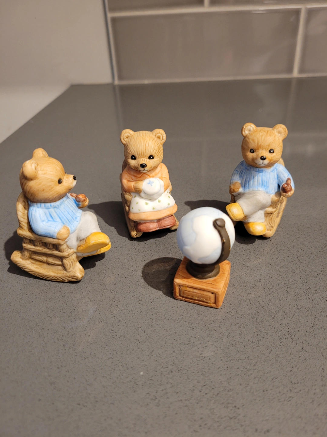 All figurines together for price. Set of three adorable ceramic bear figurines. Bears sit in rocking chairs. One bear holds a cross-stitch & Grandpa's hold a pipe. Small ceramic globe included. Give a little push and they rock. Perfect for a shelf or desk. Approximately 2 & 1/4 inch high. Good condition. Feel free to check out my other unique items listed.