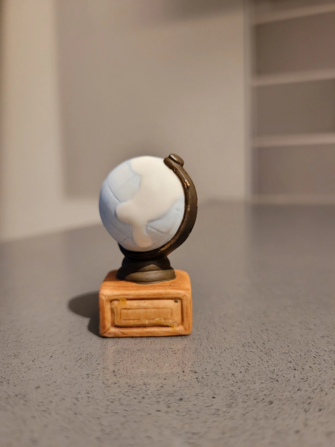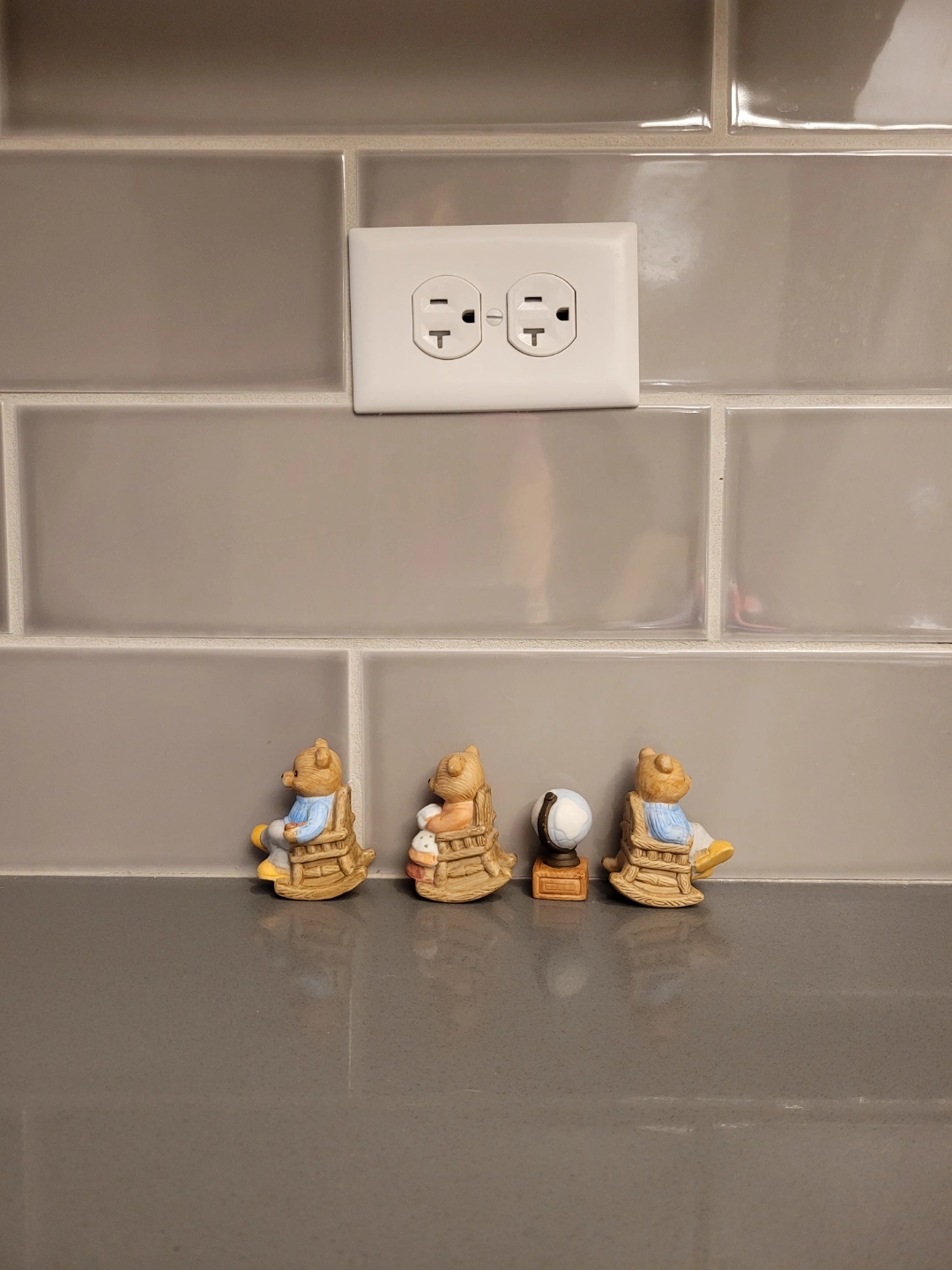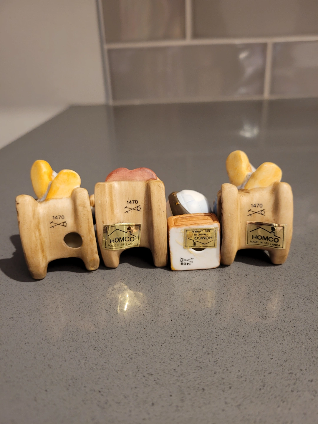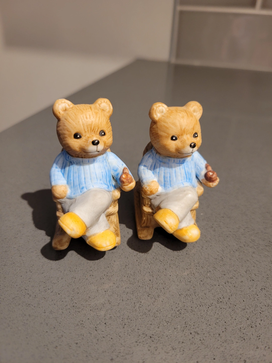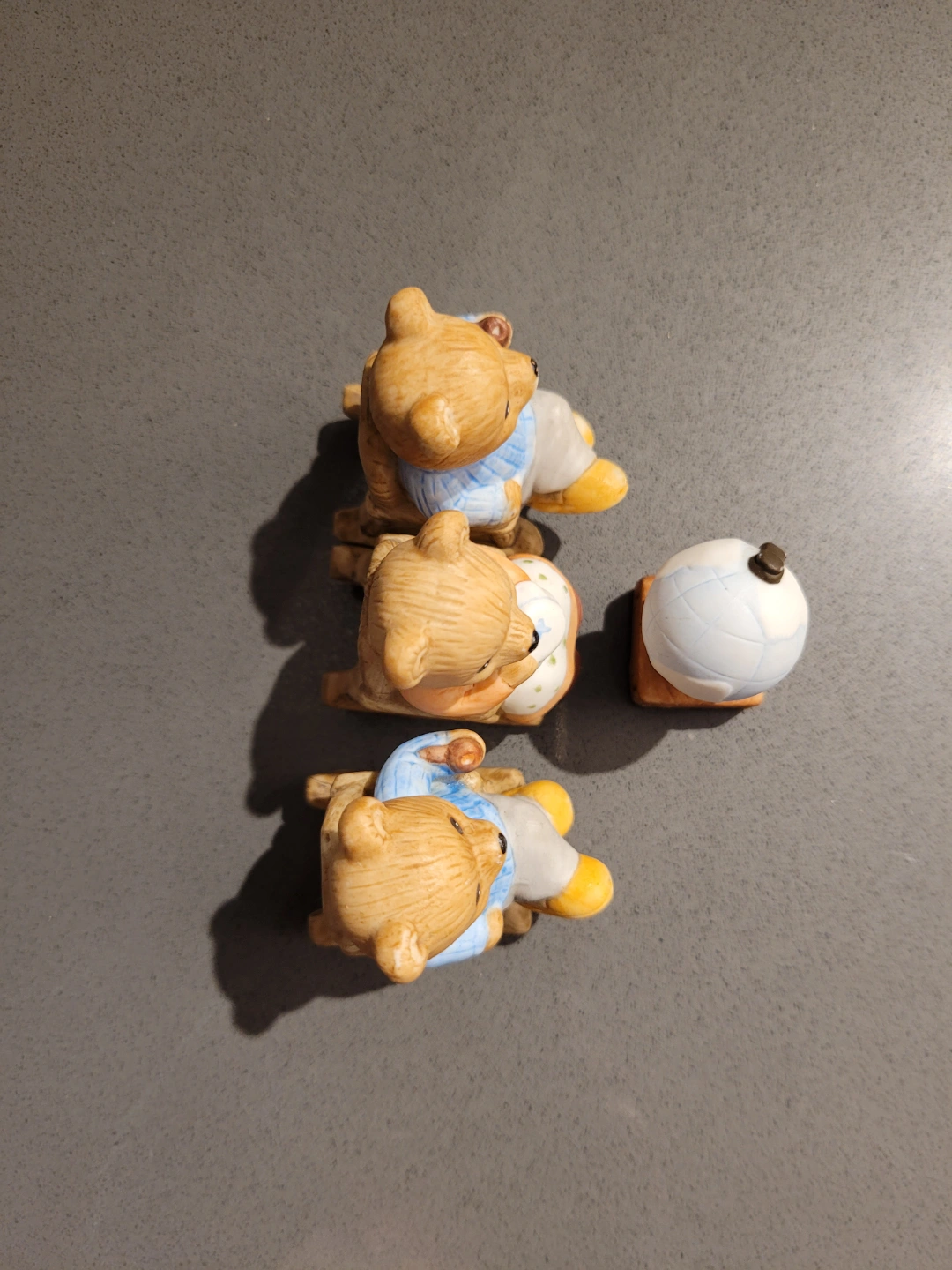 All figurines together for price. Set of three adorable ceramic bear figurines. Bears sit in rocking chairs. One bear holds a cross-stitch & Grandpa's hold a pipe. Small ceramic globe included. Give a little push and they rock. Perfect for a shelf or desk. Approximately 2 & 1/4 inch high. Good condition. Feel free to check out my other unique items listed.